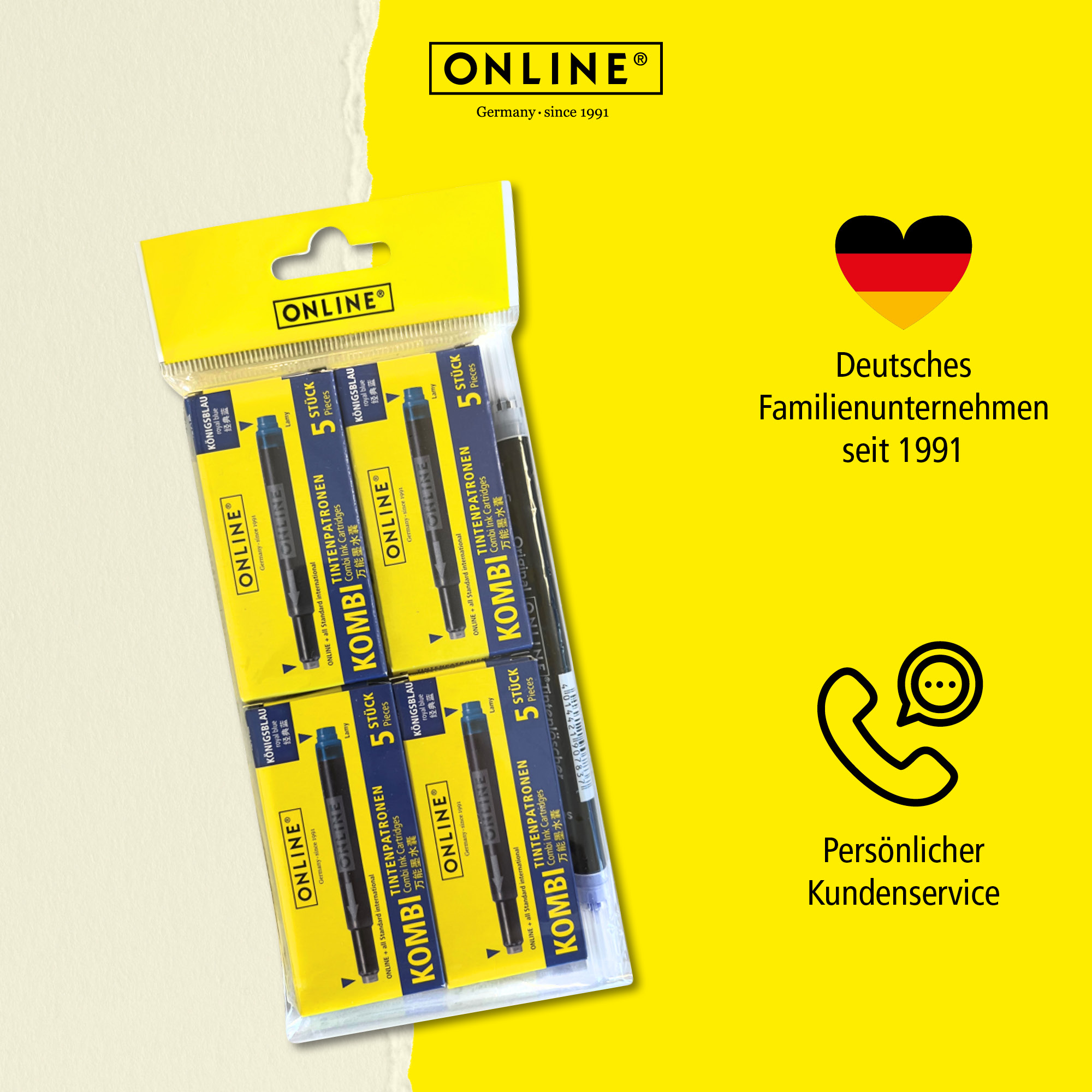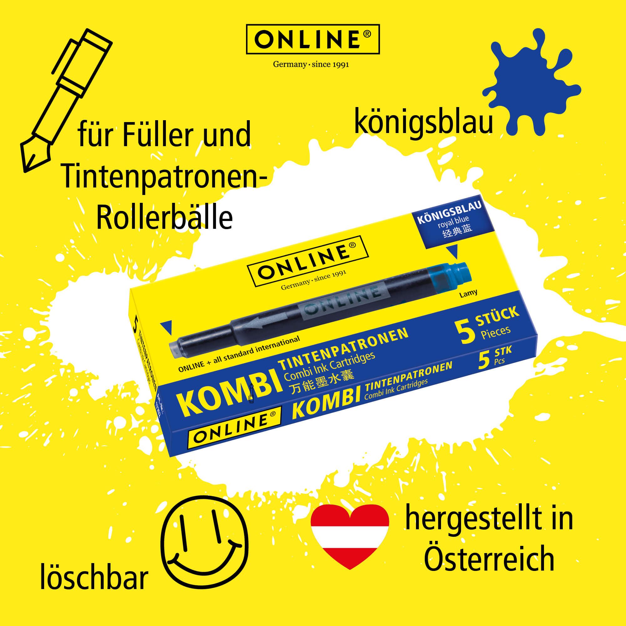 The combination cartridge from ONLINE – always a perfect fit! The thin side can be used for ONLINE and all standard fountain pen systems, while the thick side can be used for LAMY cartridge fountain pens. The high-quality ink – royal blue, erasable – guarantees intense writing colour in consistent quality, available in many different writing colours.