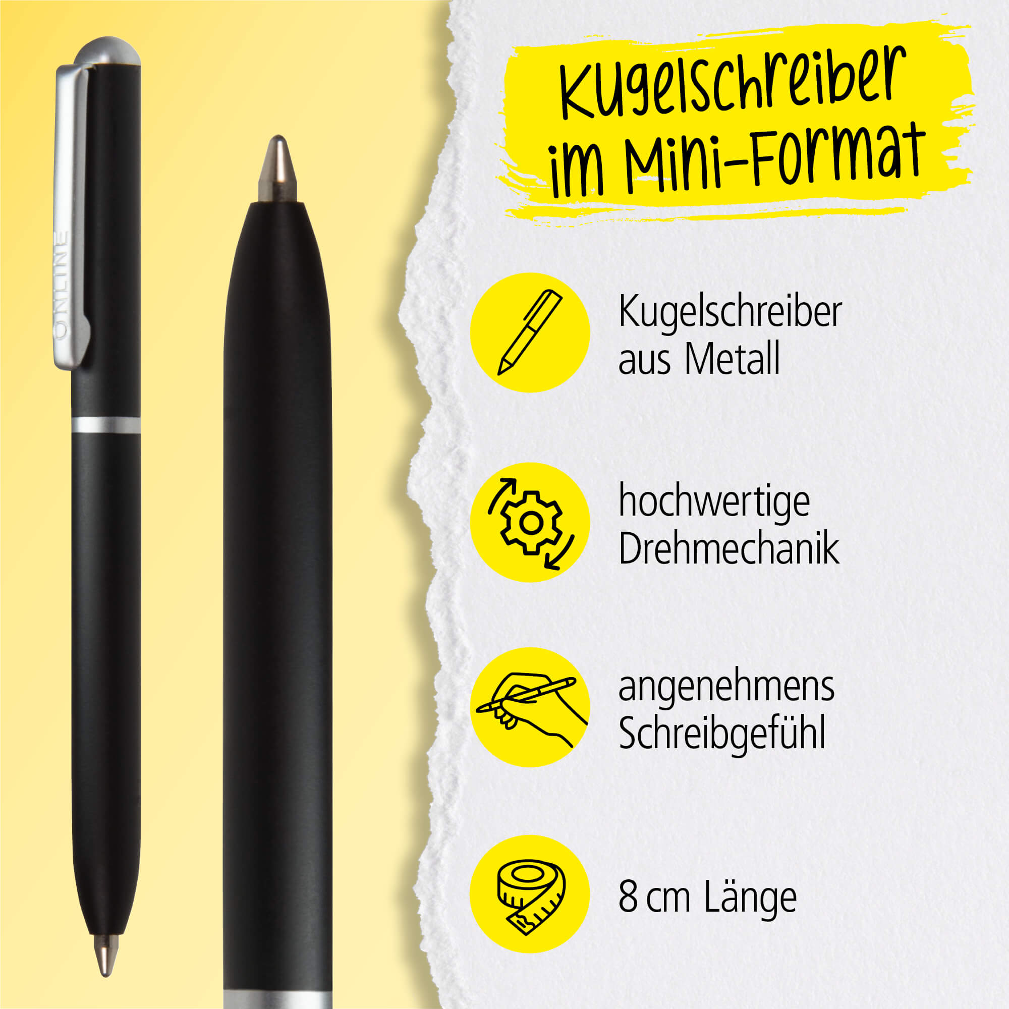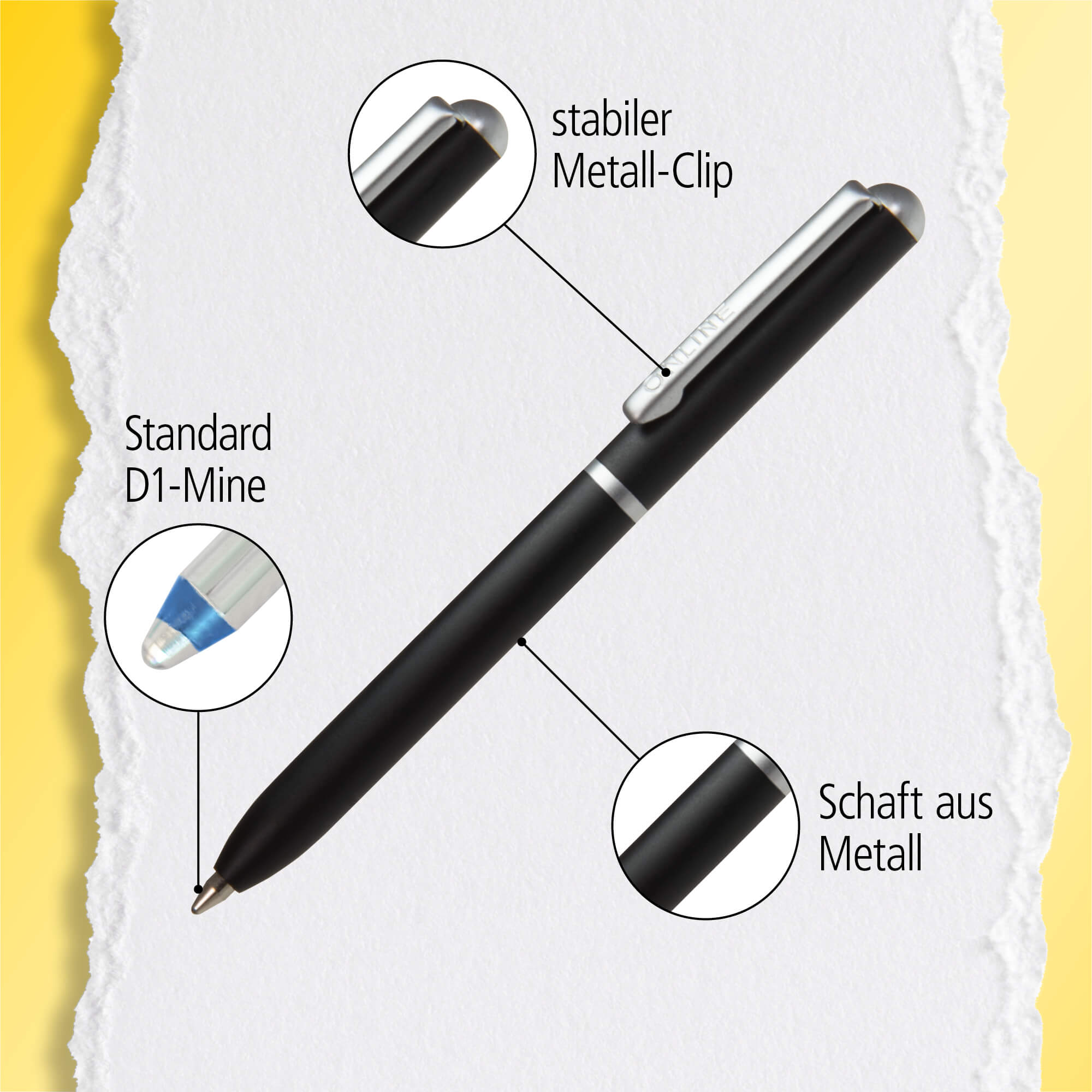 The mini ballpen fits perfectly into every wallet and into the smallest bag. This twist ballpen is equipped with a metal clip and a D1 standard blue refill.