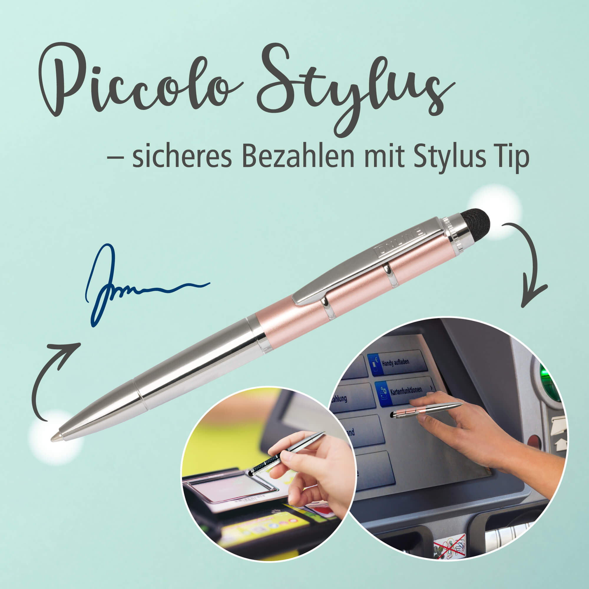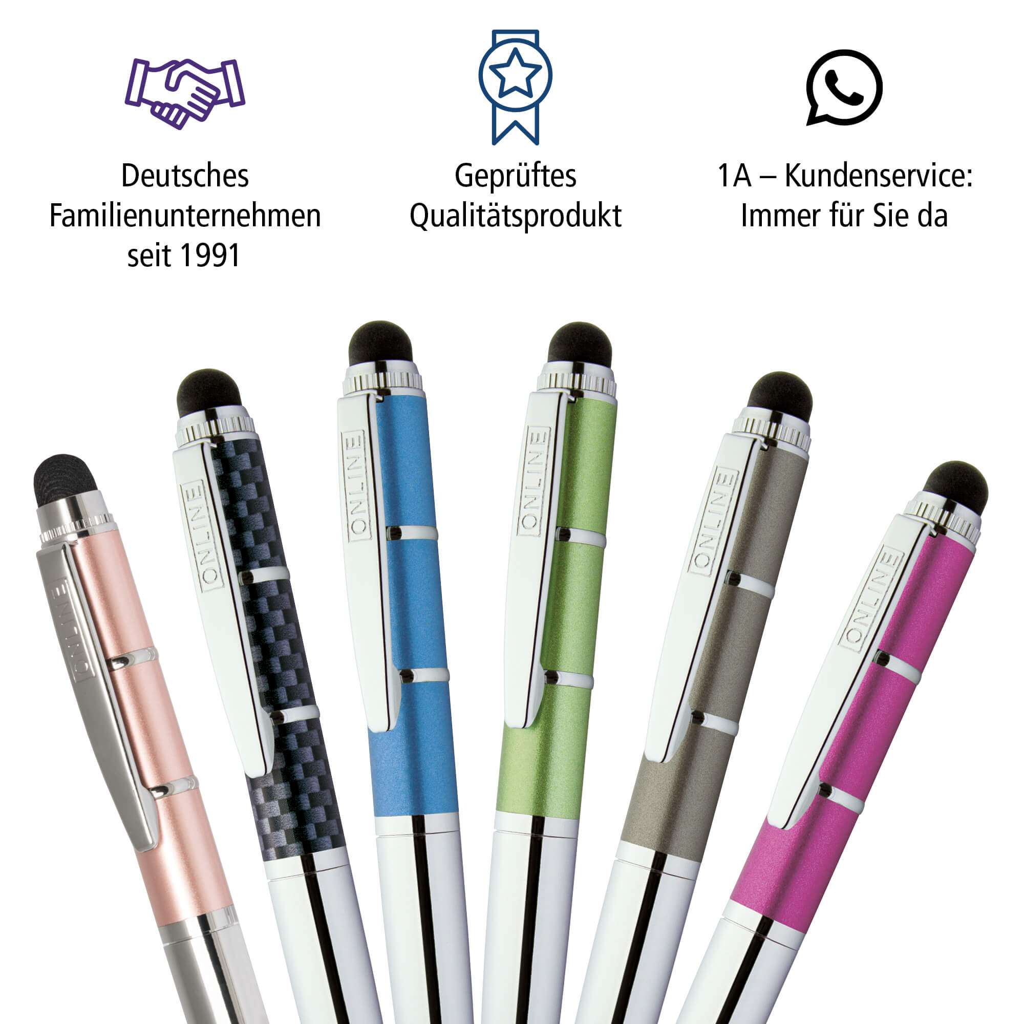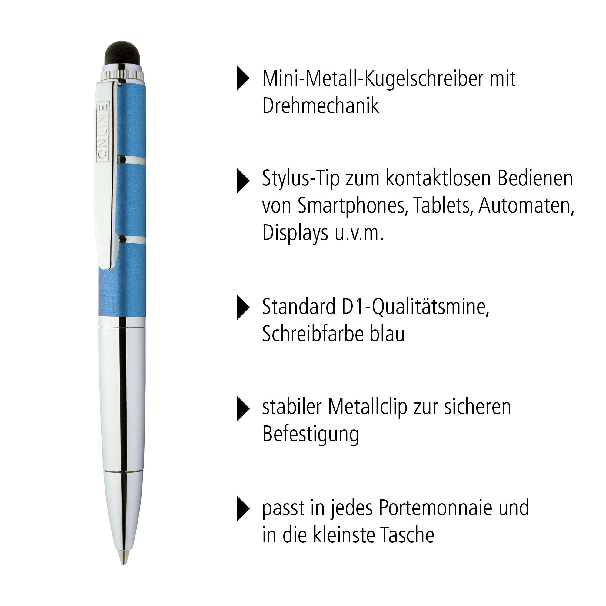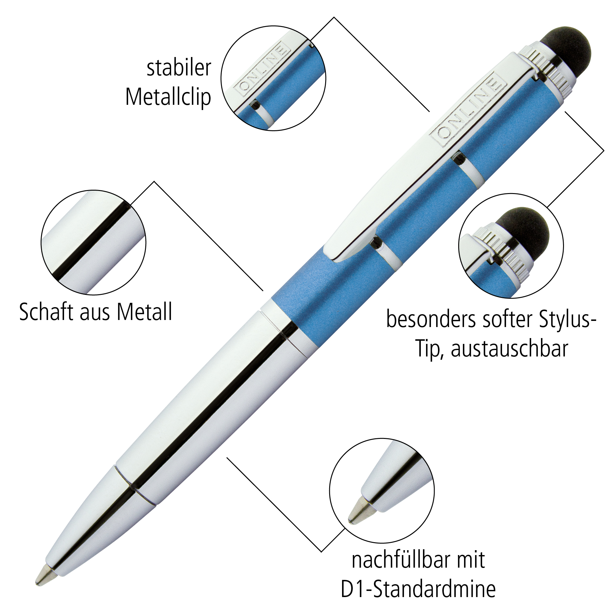ONLINE’s Piccolo design ballpen, is suitable for every trendy day timer and fits in every bag perfectly. The twist ballpen is equipped with a soft high-quality stylus tip for writing, sketching and typing on smart phones and tablet PCs. Turning the Piccolo upside down, the ballpen ,equipped with a metal clip and blue refill, is ready to use.