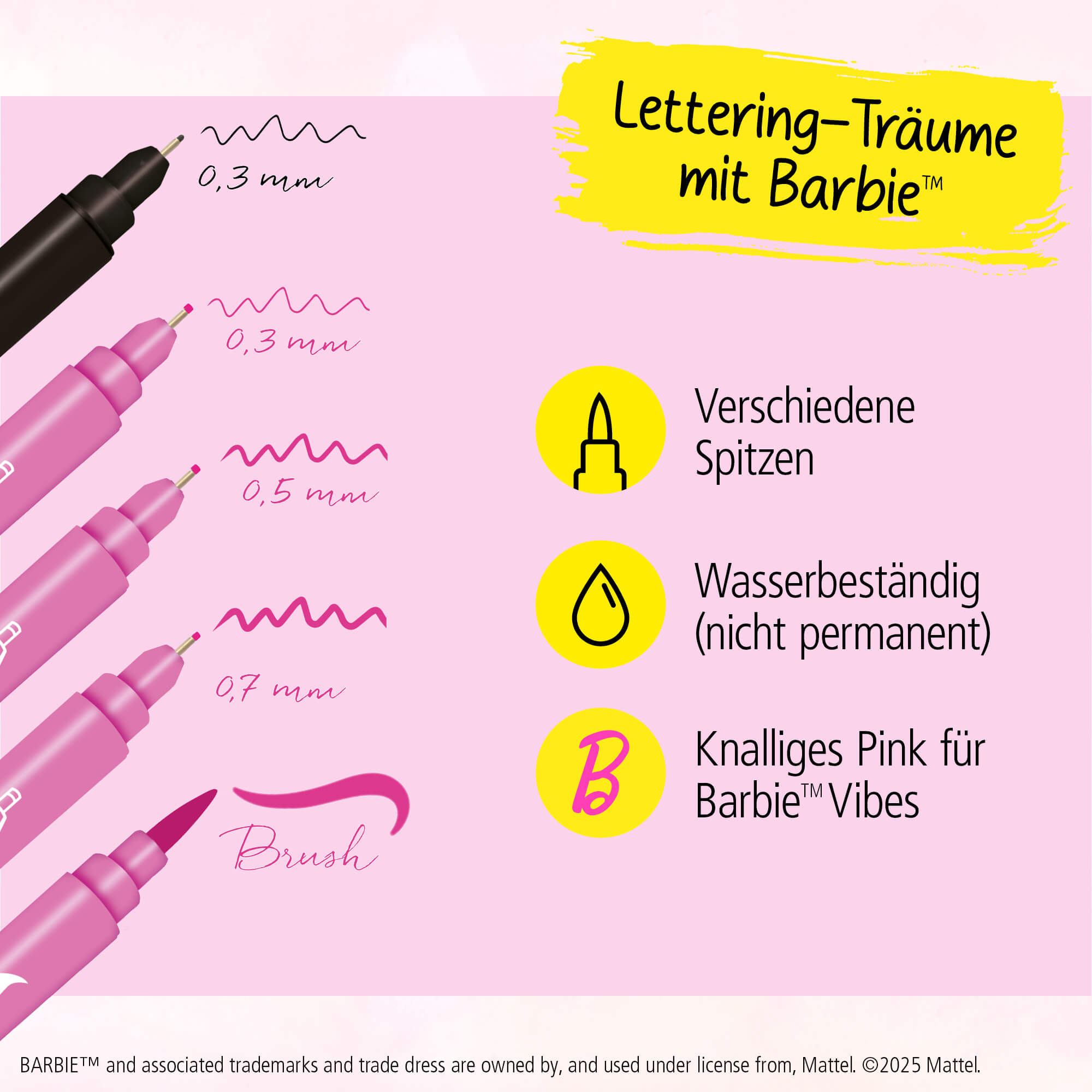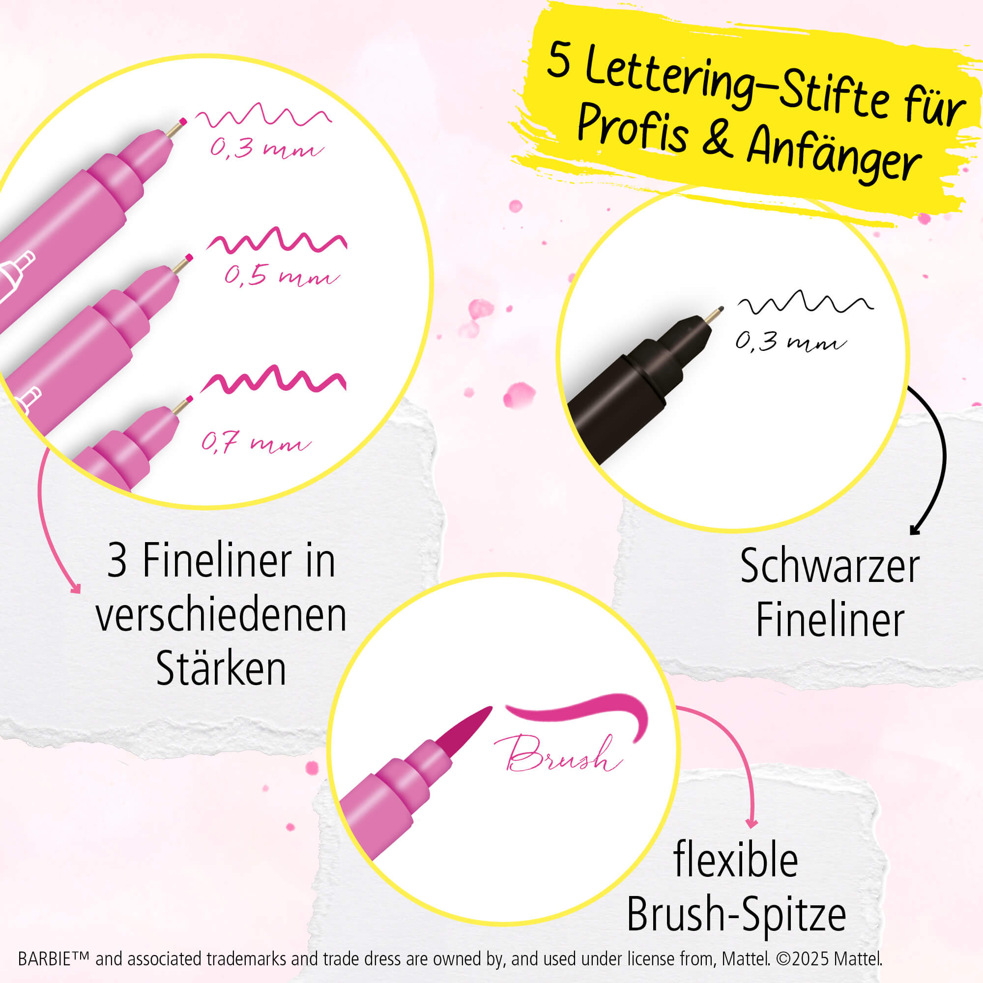 CREATIVE WRITING IN BARBIE STYLE: With this special hand lettering set in the Barbie Edition, creative design becomes a colourful highlight. It includes four beautiful pink pens and a classic black fineliner – perfect for girls who love to write, paint, draw or personalise gifts. Whether hand lettering, sketchnoting or bullet journaling – your creative adventure starts here!