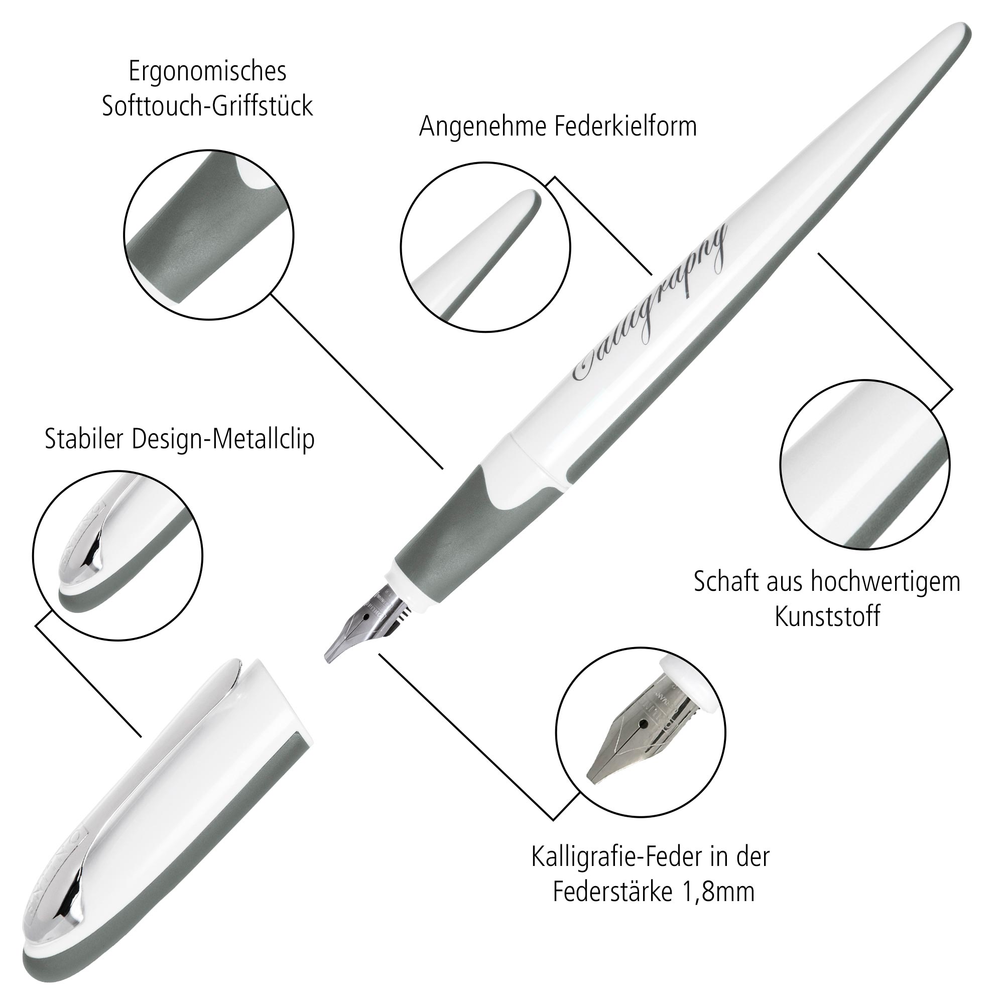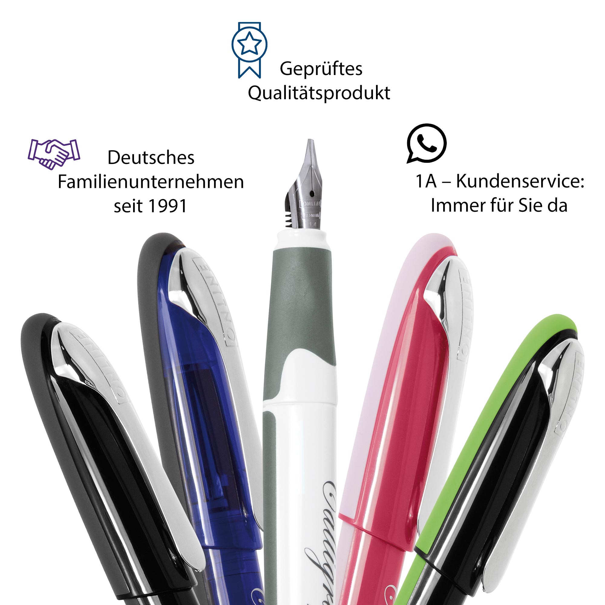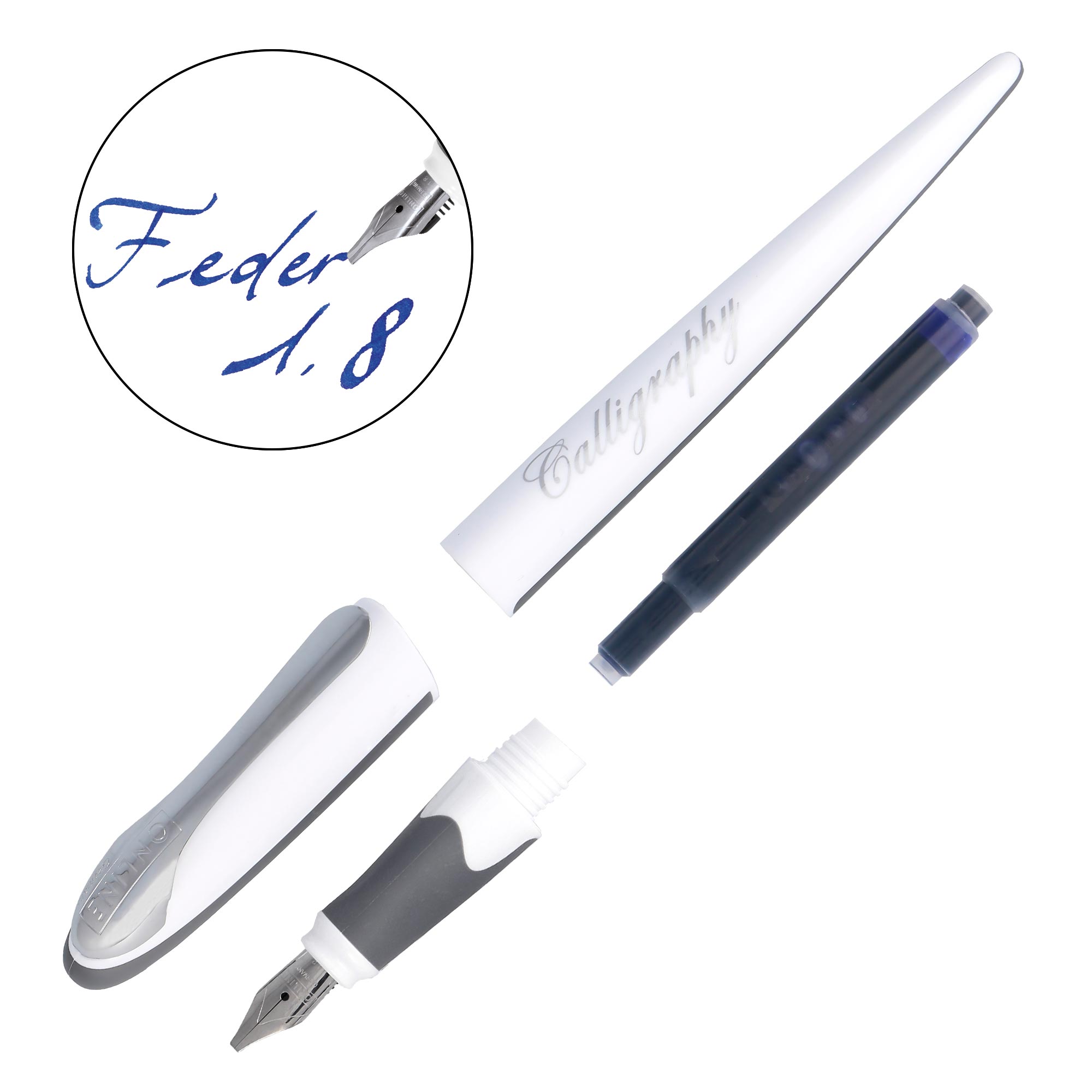 The ONLINE AIR calligraphy pen – the innovative design fountain pen. The ONLINE AIR calligraphy pen convinces with its soft triangle shape as well as the high-quality, ergonomic grip part. This high-quality fountain pen is ideal for creative writing and designing in school exercise books, on greeting cards, certificates etc. The high-quality iridium calligraphy nib – each one tested individually for quality – in sizes 0.8 mm, 1.4 mm, 1.8 mm, enables you to create an attractive and individual impression. The 5-year guarantee stands for sustainable, meticulous quality of the writing instrument, which is emphasized by the sturdy metal clip. Each individual pen represents tested quality – Made in Germany. Suitable for ONLINE combi ink cartridge, two standard ink cartridges or converter.