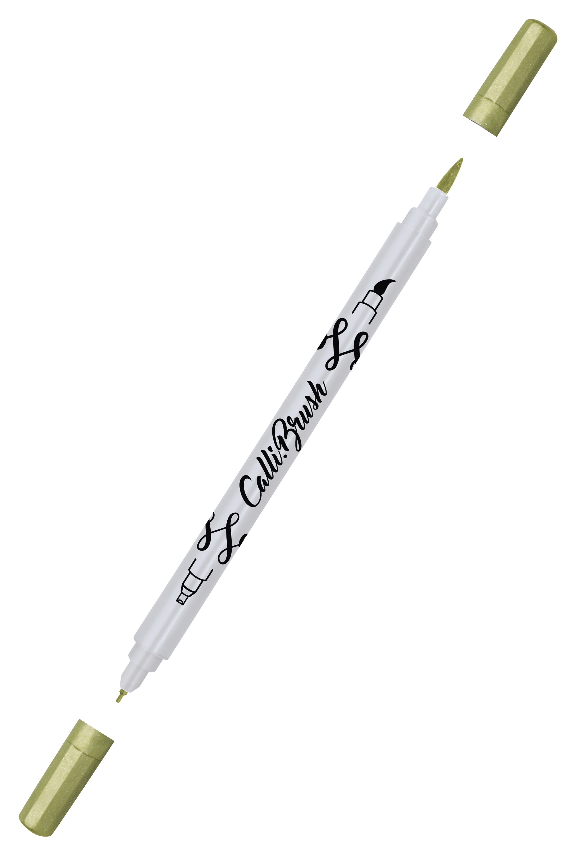 The Calli.Brush Double Tip Metallic Brushpens are especially suitable for dark papers. The Calli.Brush Pens score with their quality: The two dimensionally stable, durable brush and calligraphy tips allow a large variety of font widths and -variants with numerous design options. Available in five metallic colors, which unfold their shimmering effect especially on dark papers. Ideal on white and dark paper. Store pen horizontally. The Calli.Brush Pens are suitable for beginners.