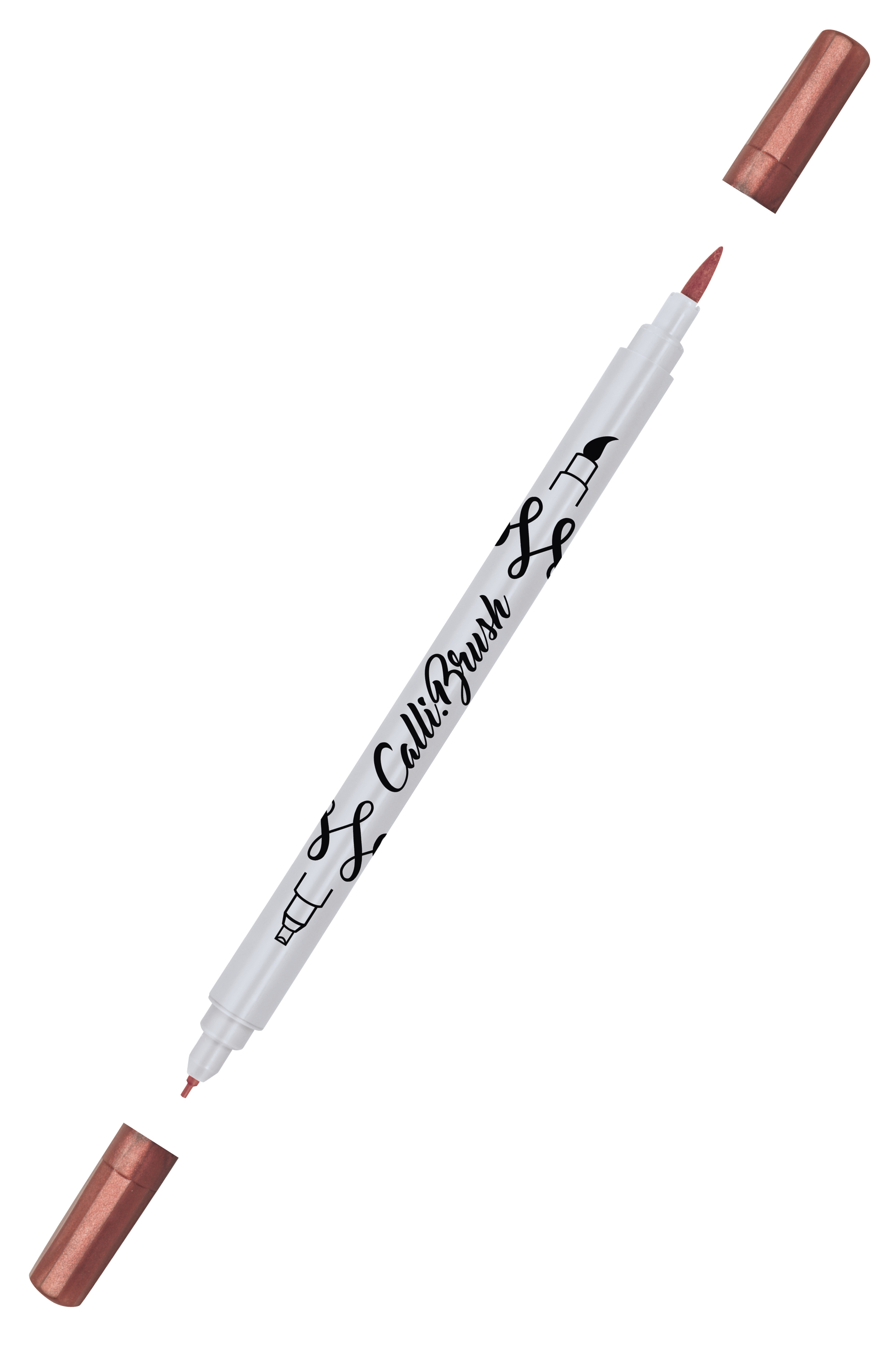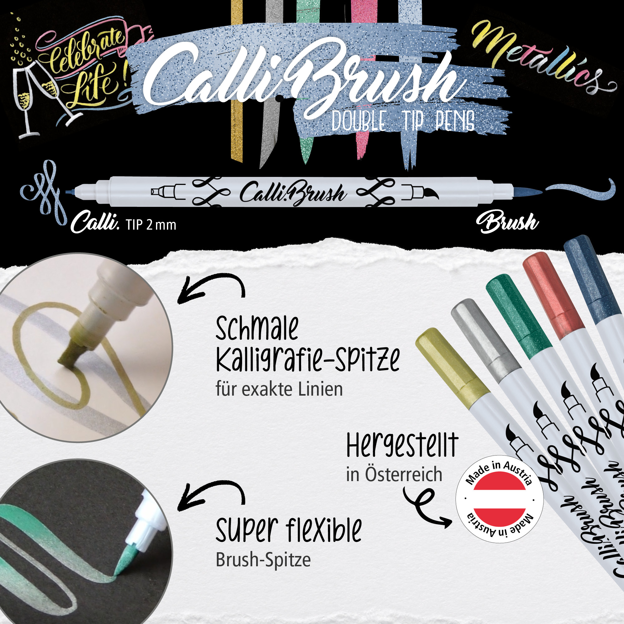 The Calli.Brush Double Tip Metallic Brushpens are especially suitable for dark papers. The Calli.Brush Pens score with their quality: The two dimensionally stable, durable brush and calligraphy tips allow a large variety of font widths and -variants with numerous design options. Available in five metallic colors, which unfold their shimmering effect especially on dark papers. Ideal on white and dark paper. Store pen horizontally. The Calli.Brush Pens are suitable for beginners.