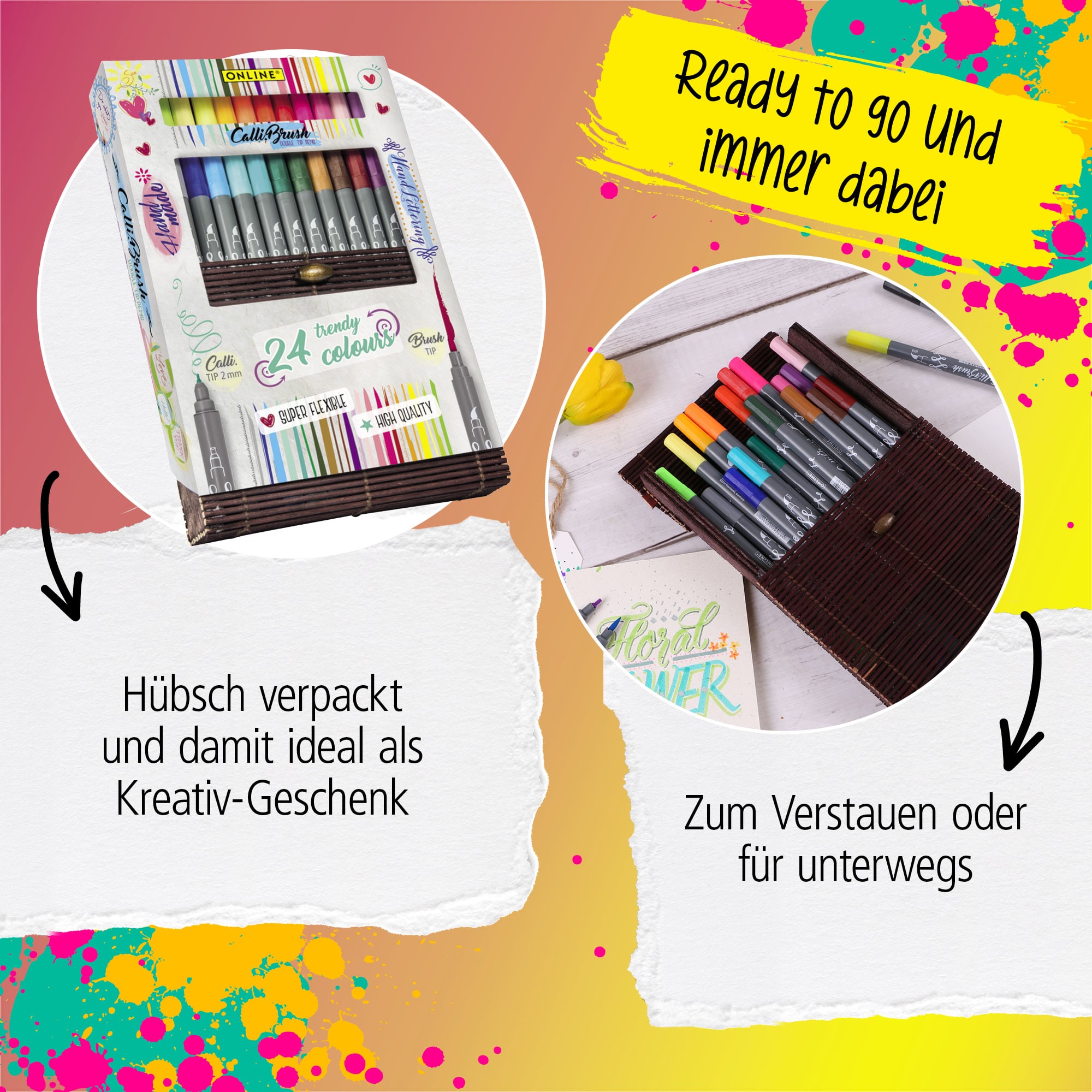 This set with 24 intense, harmonious colours will increase your pleasure in creative activities involving writing, hand-lettering and lots of other possibilities. The main thing is to enjoy creating ideas and dip into the wonderful world of the handmade. The combination of the thin, angled nib with the wide brush nib allows diverse and creative design. It is enjoyable – and these days, anything created by hand is especially appreciated. Ecologically clean in its sustainable bamboo case and ideal as the perfect gift.