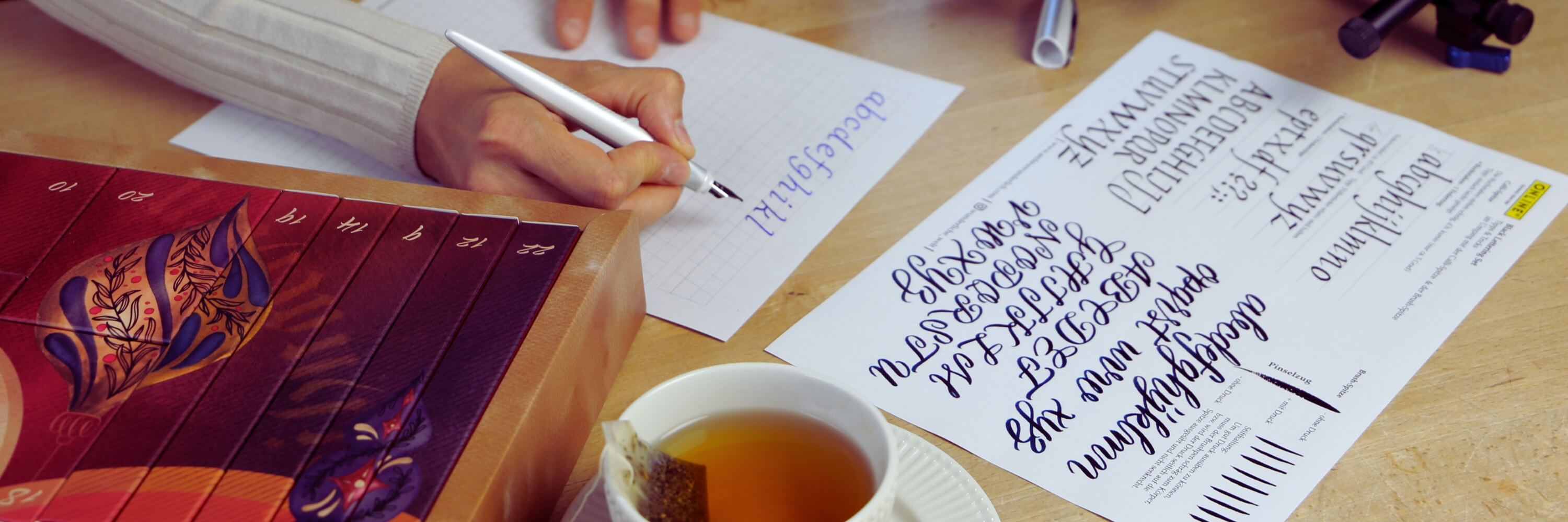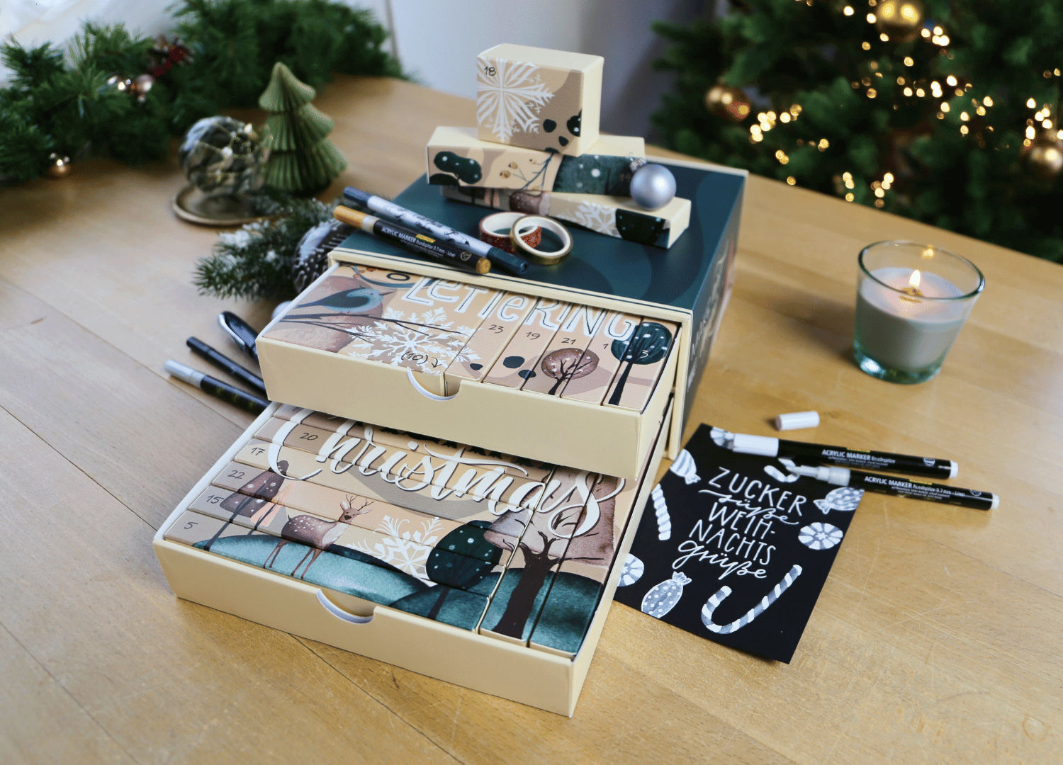 24 Tage voller Schreibkunst: Hinter jedem Türchen steckt eine neue Überraschung. Kalligrafie-Füller, Calli.Brush in vielen Farben, Black Lettering Fineliner, Aquarellblock, Tinte, Grußkarten und vieles mehr.