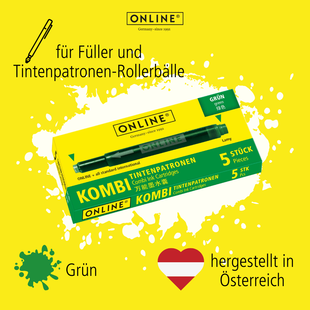 The ONLINE combi ink cartridge – always suitable! The high-quality ink – green – guarantees an intensive color and consistent quality, available in many different colors. 2 packs à 5 cartridges, with Rabazzi bonus points.