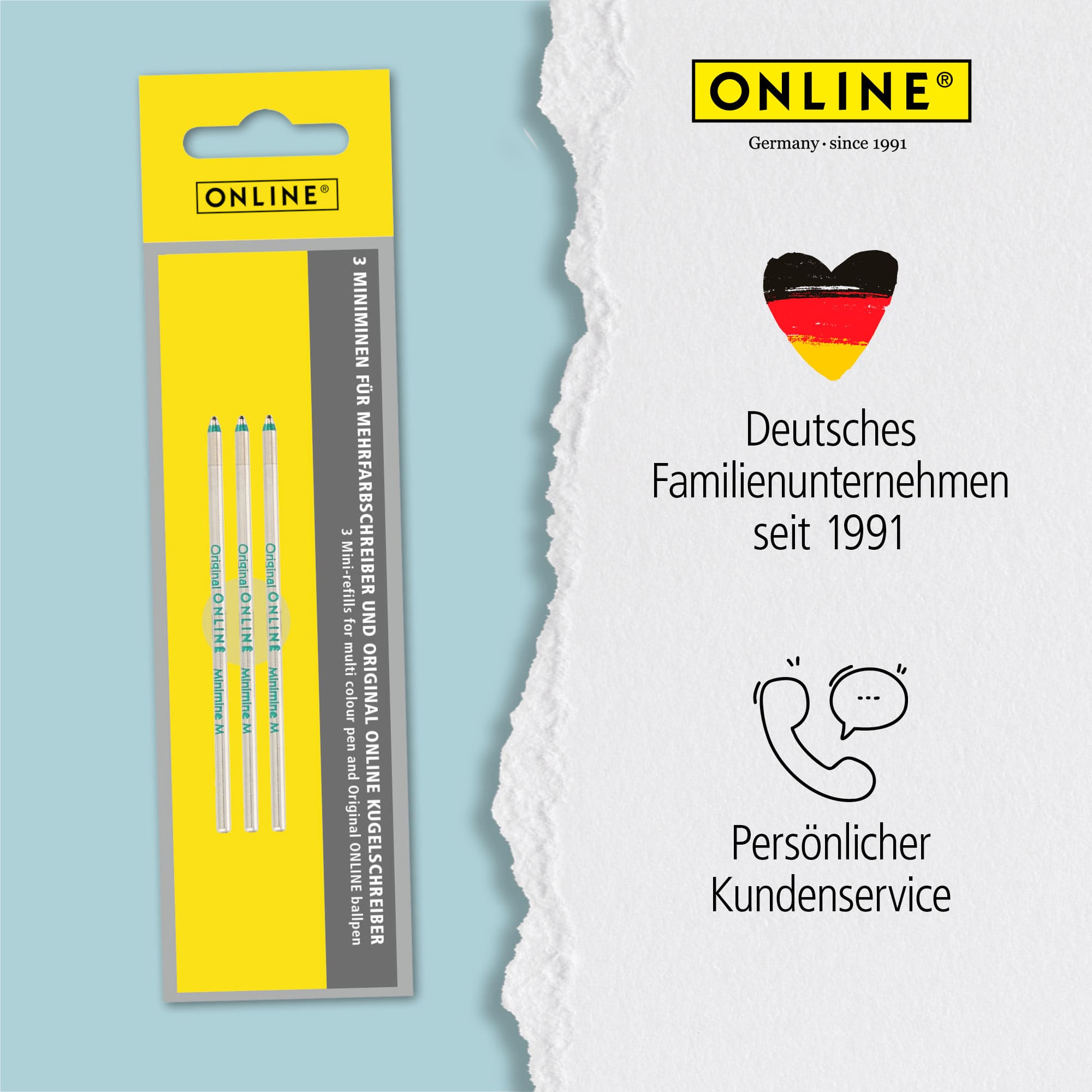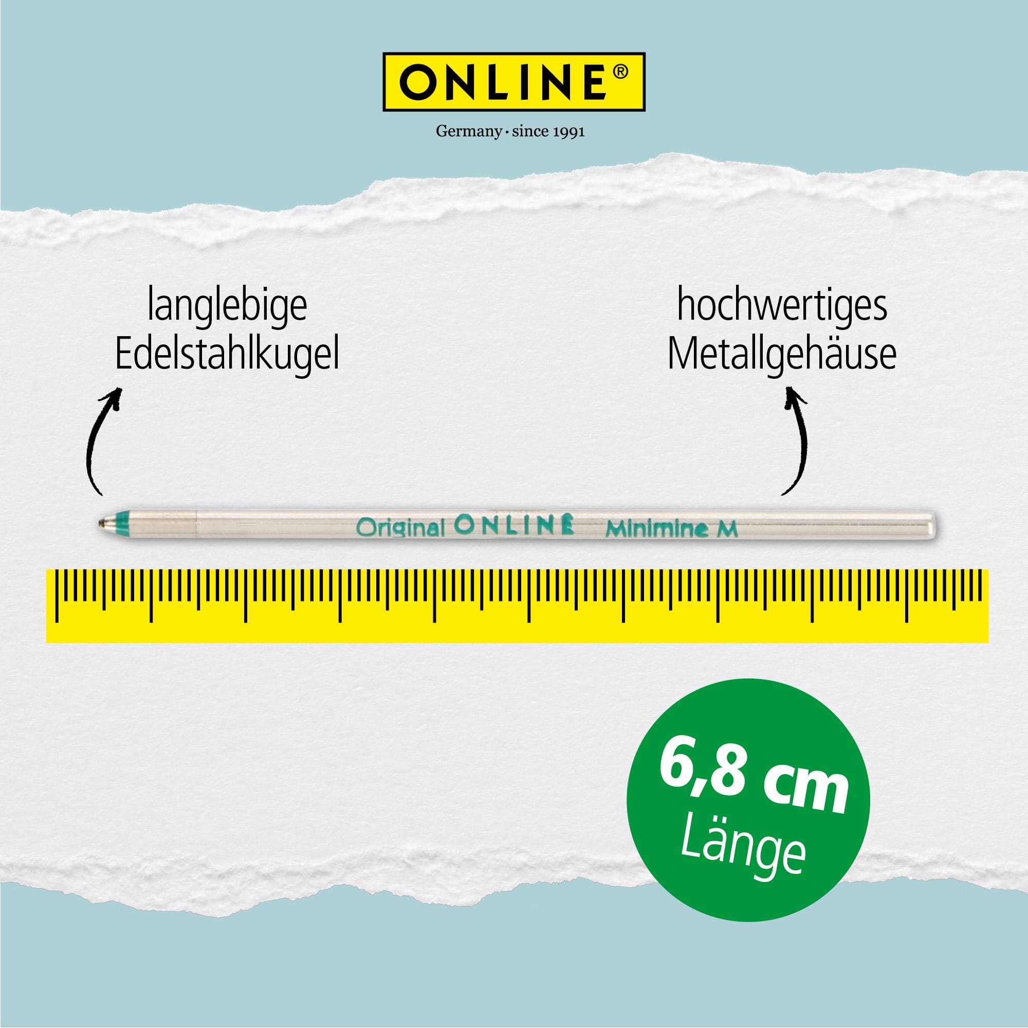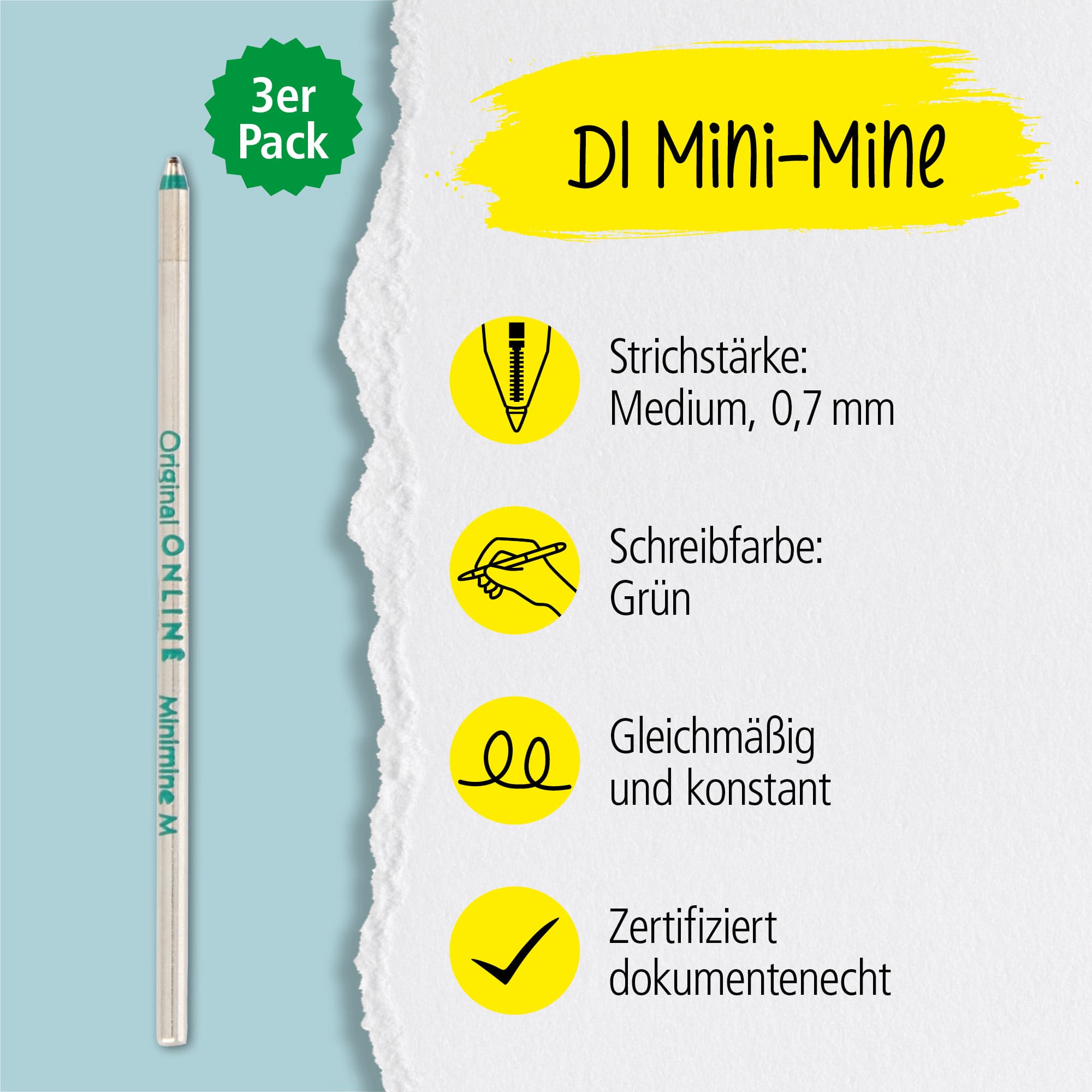 Ballpen refill,standard D1,made in Germany,metal,width M,green ink,documentary proof,water proof;stainless steel ball, in black and blue; width B in orange ink; ISO 12757-2DOC; Contains 3 refills.