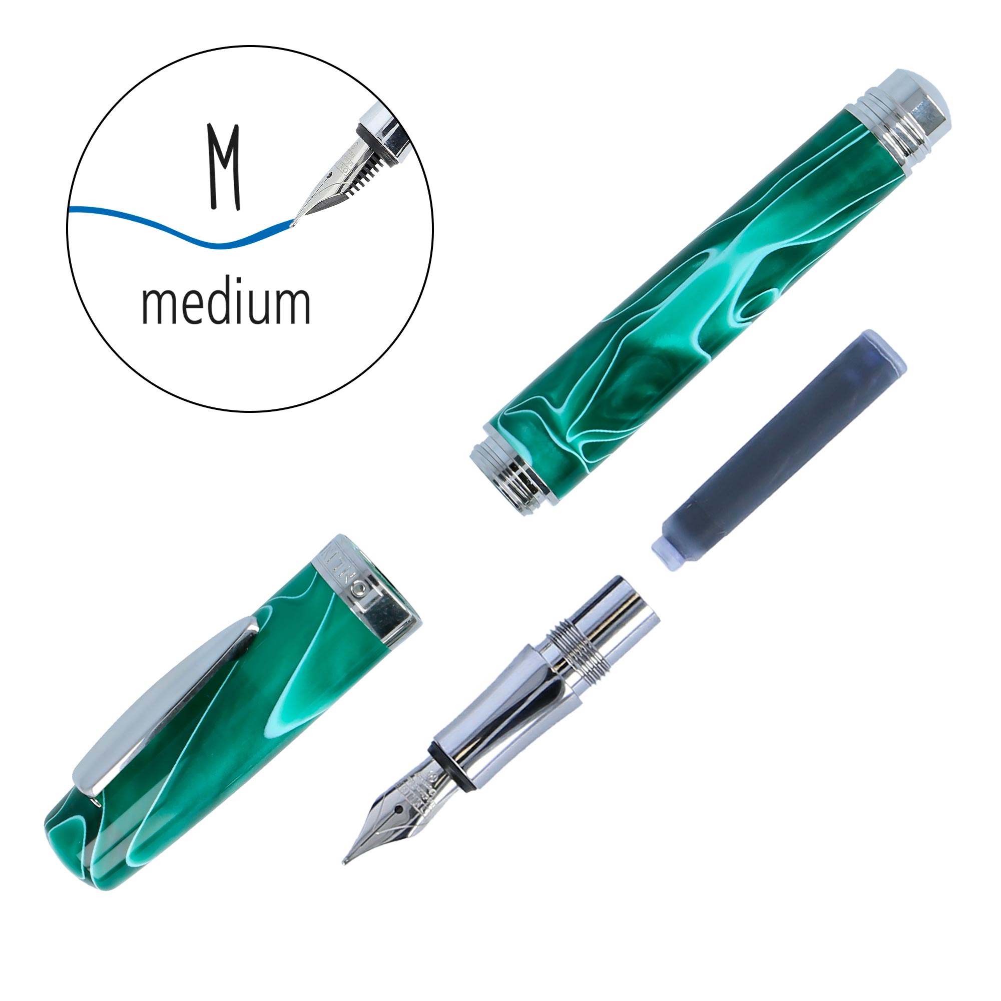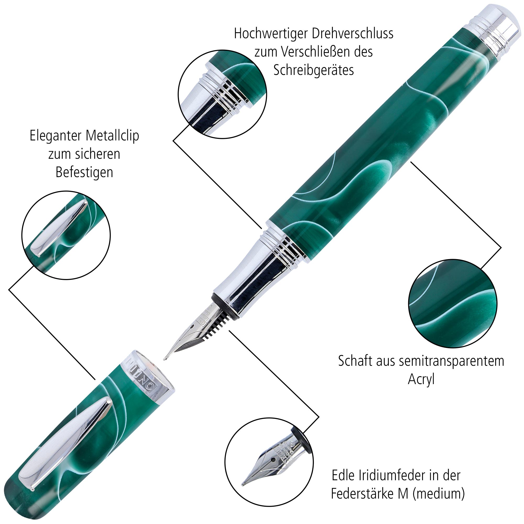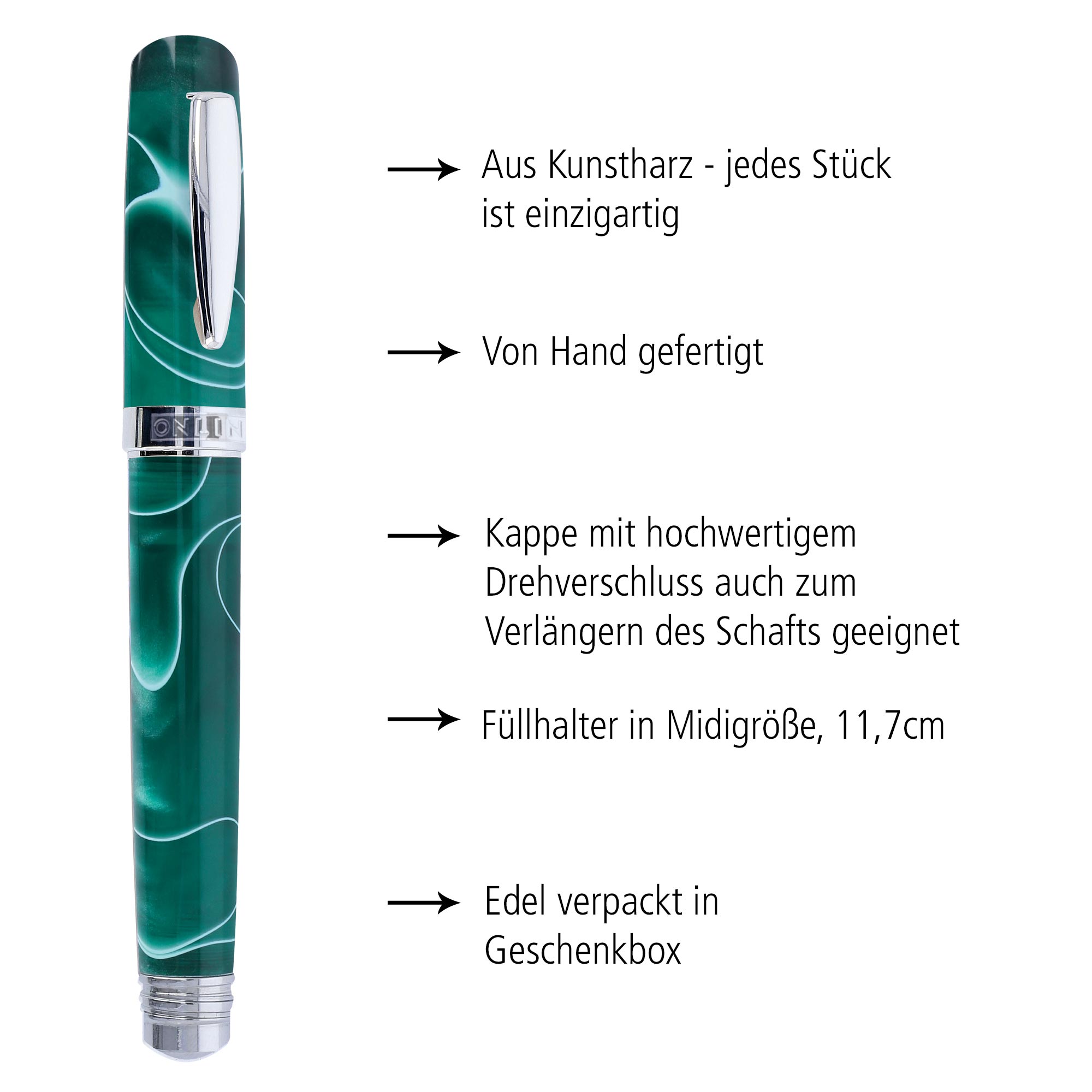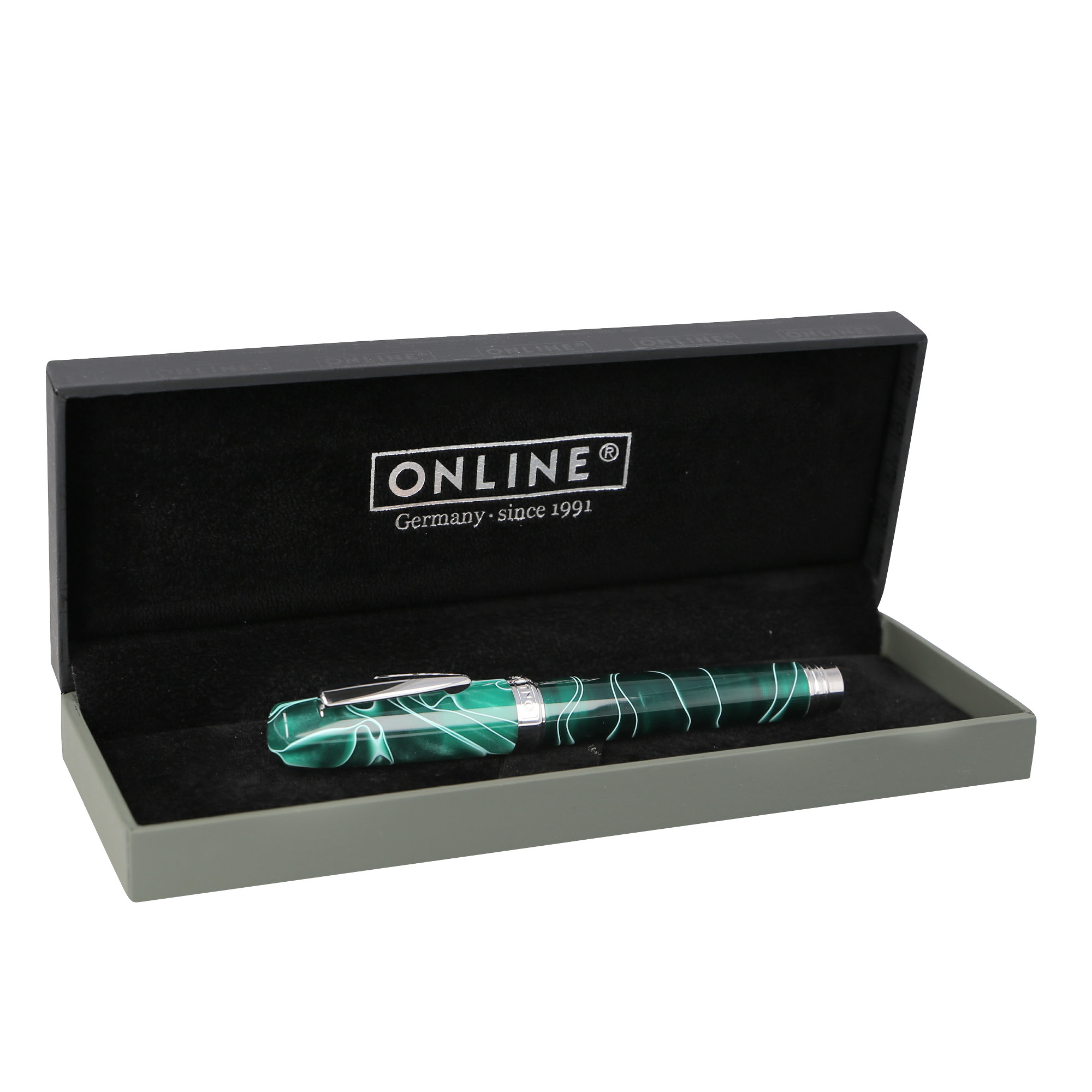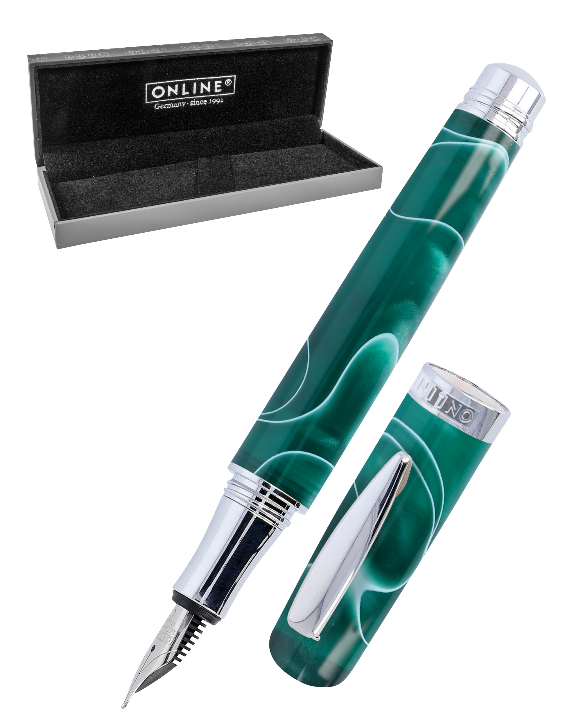 A noble fountain pen made of semi-transparent acrylic, in midi size, high quality workmanship - completely in the style of the Boheme, a stylistic direction that especially artists in the 20s have shaped with their way of life. Also acrylic was discovered as a material during that time. The material from which transparent objects in a wide variety of areas are made today. The fountain pen is turned by hand, bit by bit. Due to the interesting acrylic each piece is an original. High quality cap with screw tip, also to extend the shaft. The gift box perfectly fits the Boheme style and makes the fountain pen the perfect gift for all retro fans.Refillable with standard ink cartridges, use of a short converter possible. ONLINE grants 5 years warranty on the noble Iridium nib M (medium). Easy-change nibs for personal writing comfort thanks to "Easy-Change-System".
