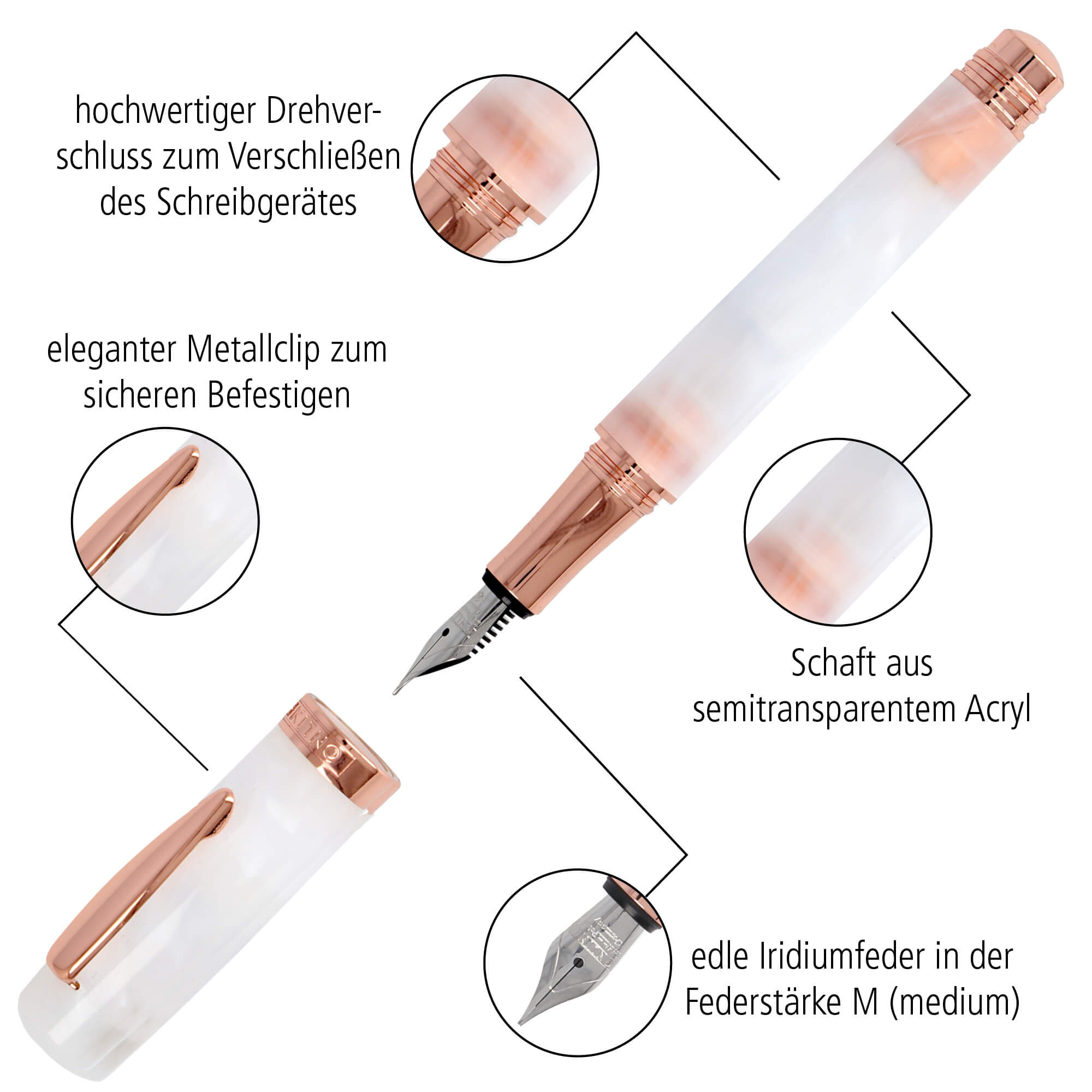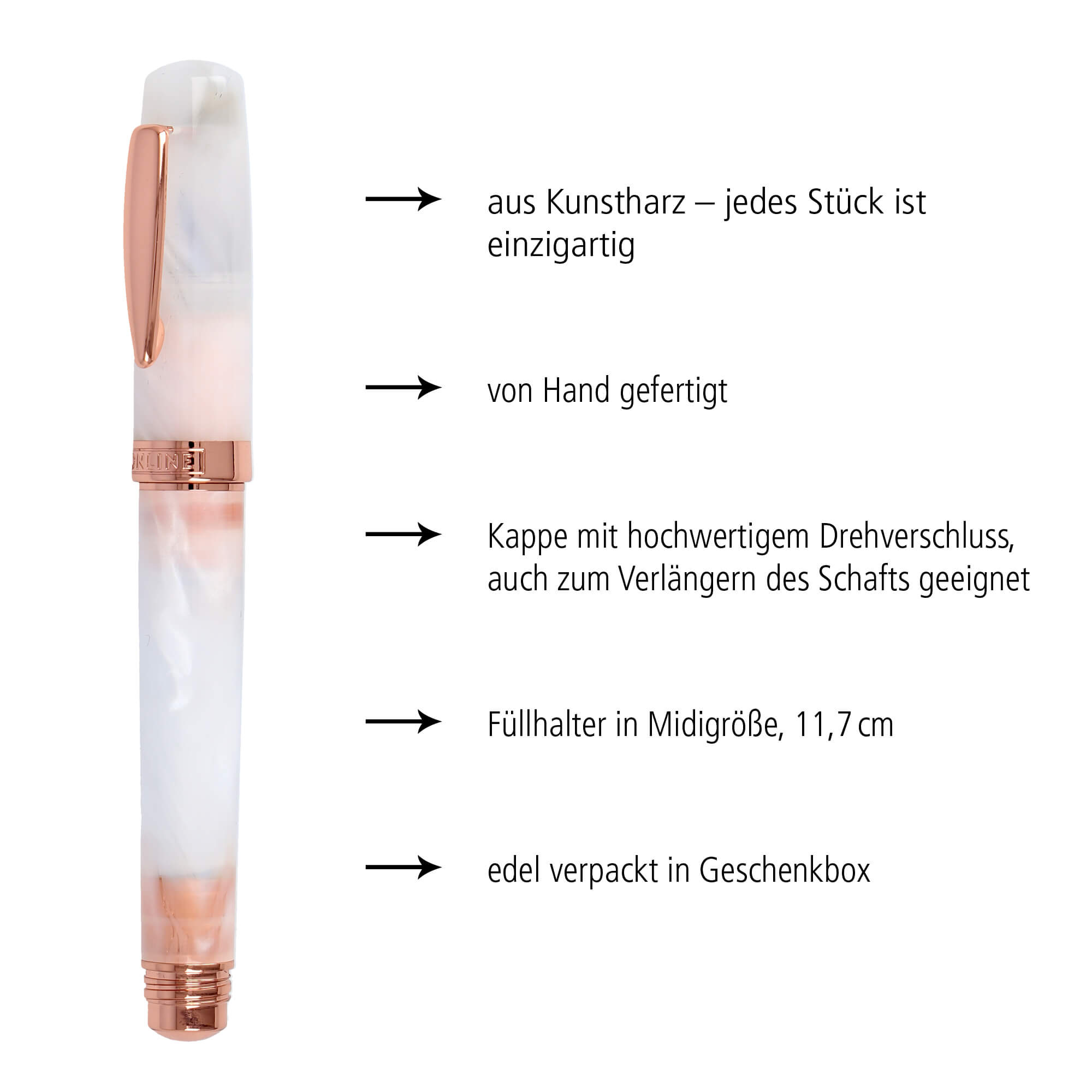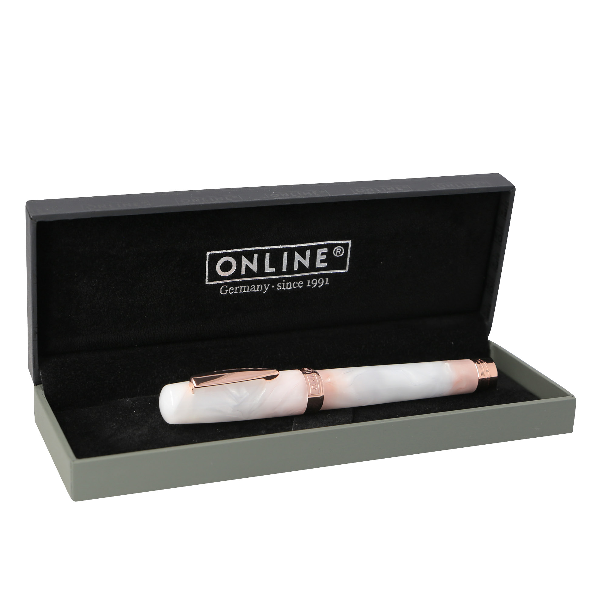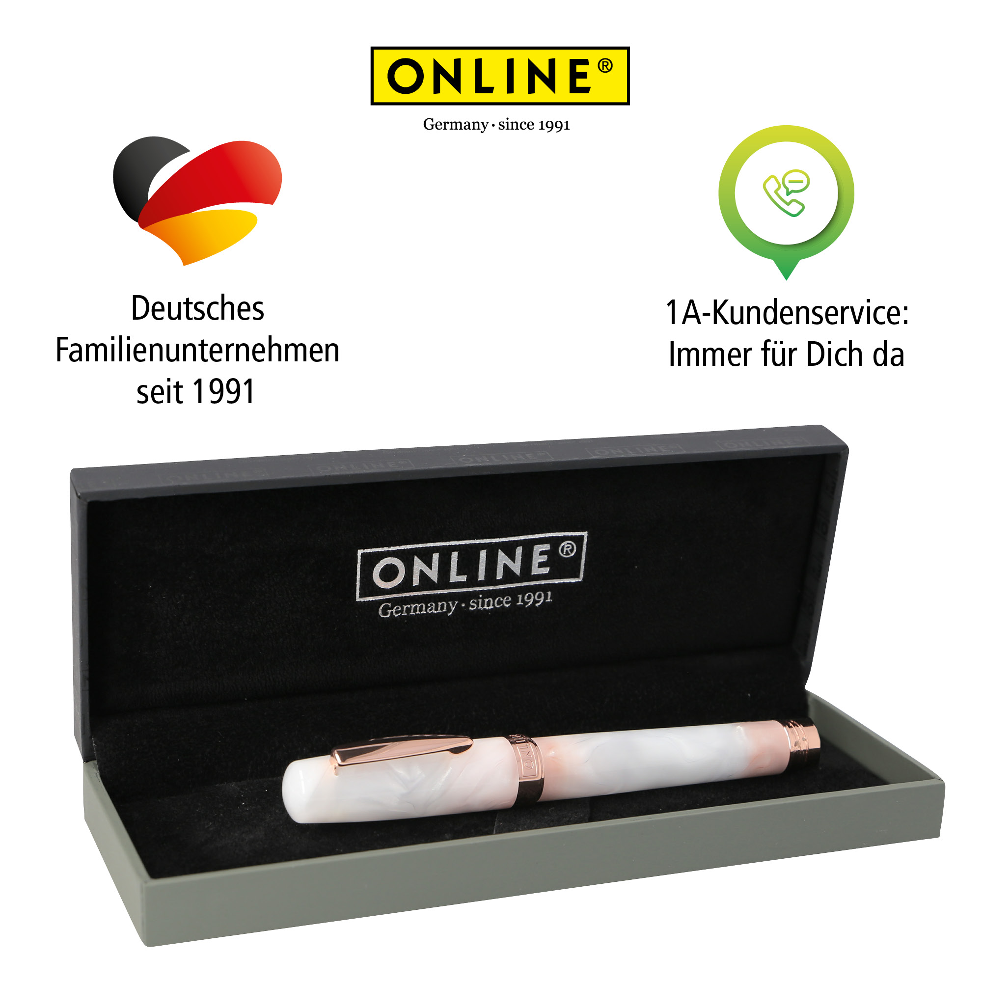 A noble fountain pen made of semi-transparent acrylic, in midi size, high quality workmanship - completely in the style of the Boheme, a stylistic direction that especially artists in the 20s have shaped with their way of life. Also acrylic was discovered as a material during that time. The material from which transparent objects in a wide variety of areas are made today. The fountain pen is turned by hand, bit by bit. The metal parts are finished in a fashionable rose gold look. Due to the interesting acrylic each piece is an original. High quality cap with screw tip, also to extend the shaft. The gift box perfectly fits the Boheme style and makes the fountain pen the perfect gift for all retro fans.Refillable with standard ink cartridges, use of a short converter possible. ONLINE grants 5 years warranty on the noble Iridium nib. Easy-change nibs for personal writing comfort thanks to "Easy-Change-System".