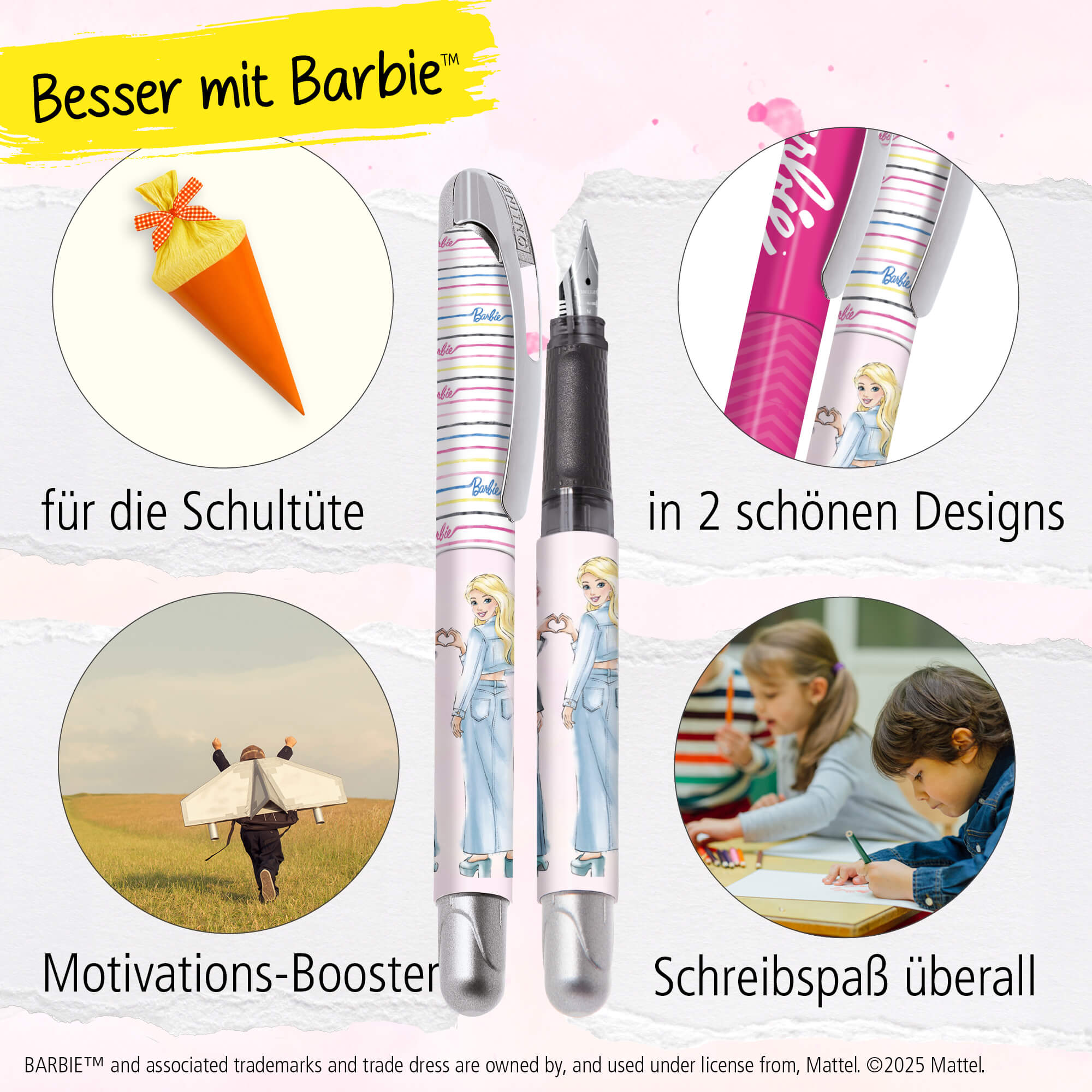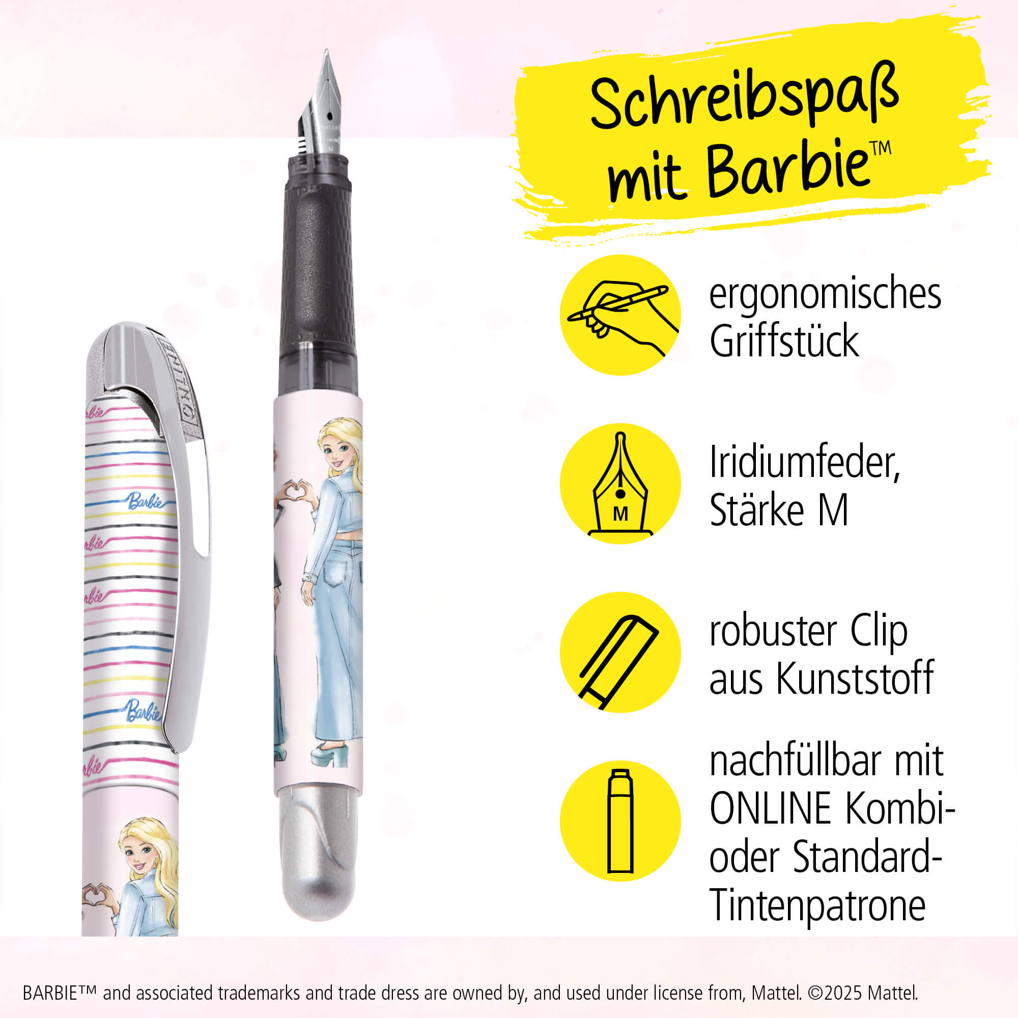 Rock the school day with Barbie: The right-handed fountain pen with cap has everything a good fountain pen needs: A sturdy iridium nib in medium, a practical and allergy-friendly clip and a stylish design that will delight every Barbie fan. It also comes with a blue ink cartridge so that you can start writing straight away. The fountain pen for children is suitable for all standard ink cartridges. We recommend the online combi ink cartridges in large capacity format with high-quality ink.