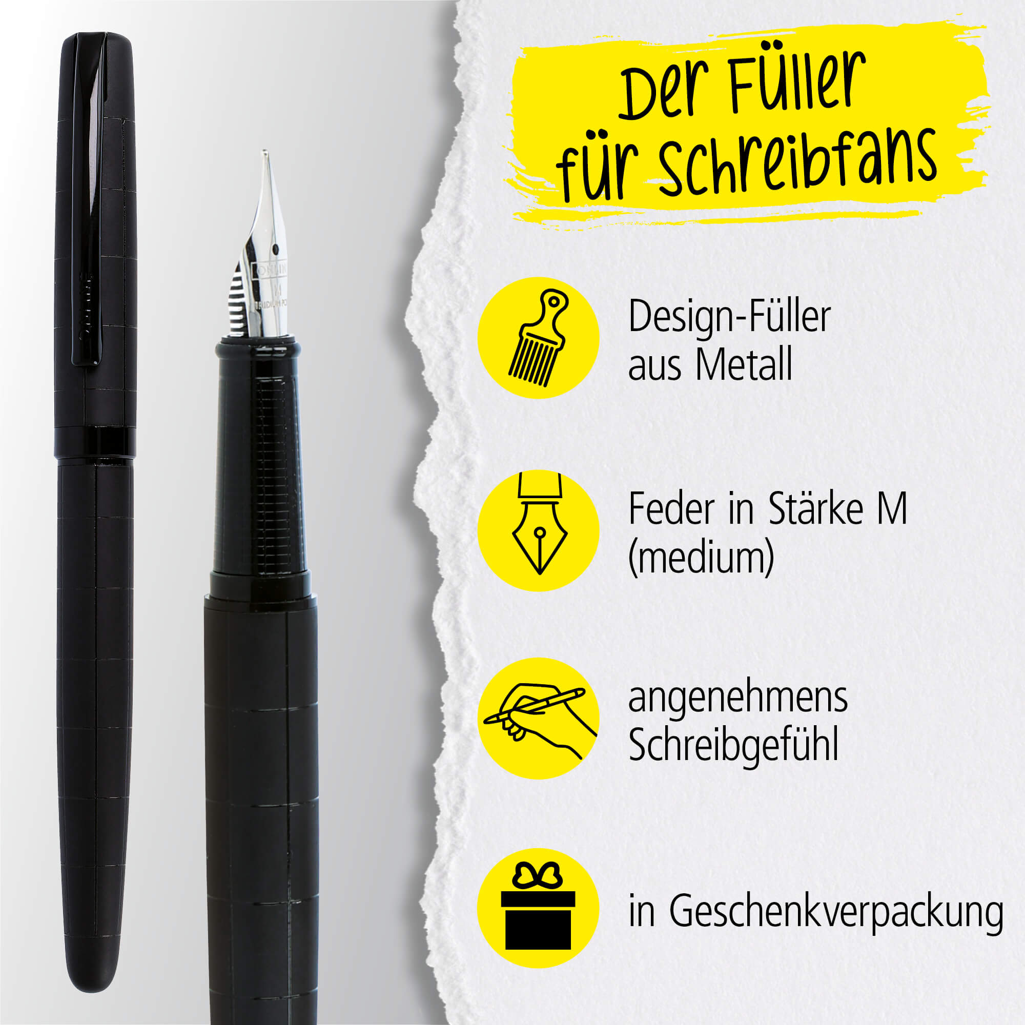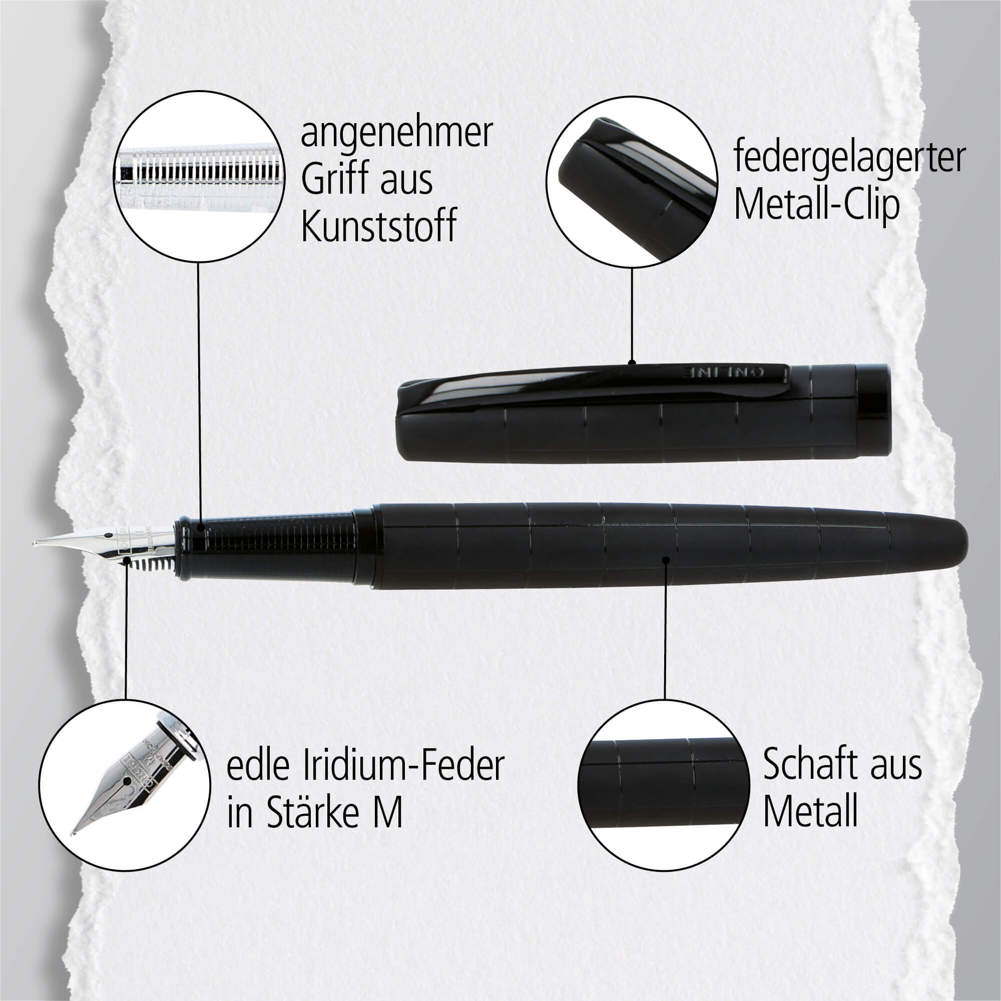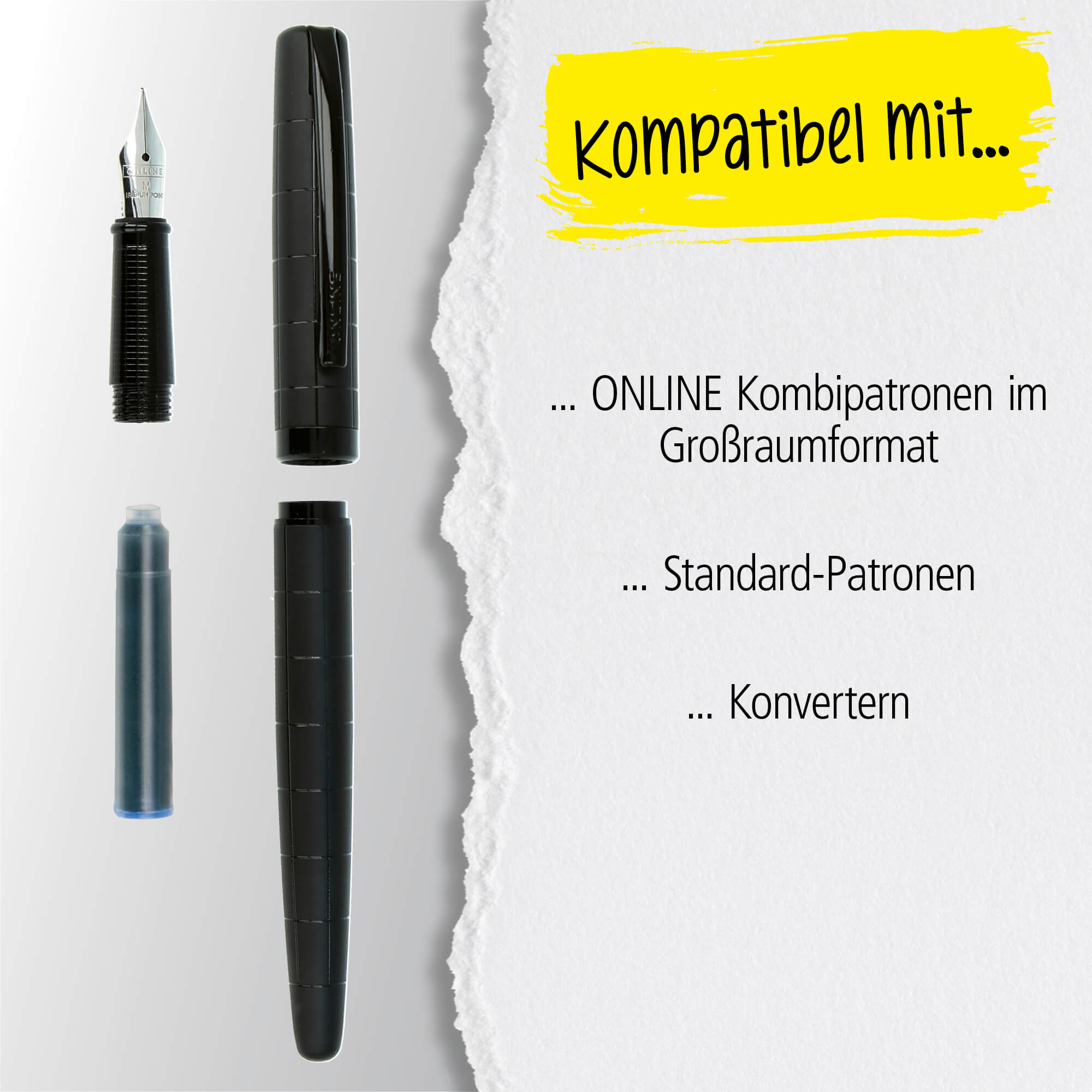 This ONLINE design metal fountain pen is equipped with a high-quality M nib (medium) and offers the highest level of writing. Delivered in a gift box, every writing instrument is an elegant gift. For standard cartridges, converter use is possible. ONLINE grants a 5-year warranty on the iridium nib.