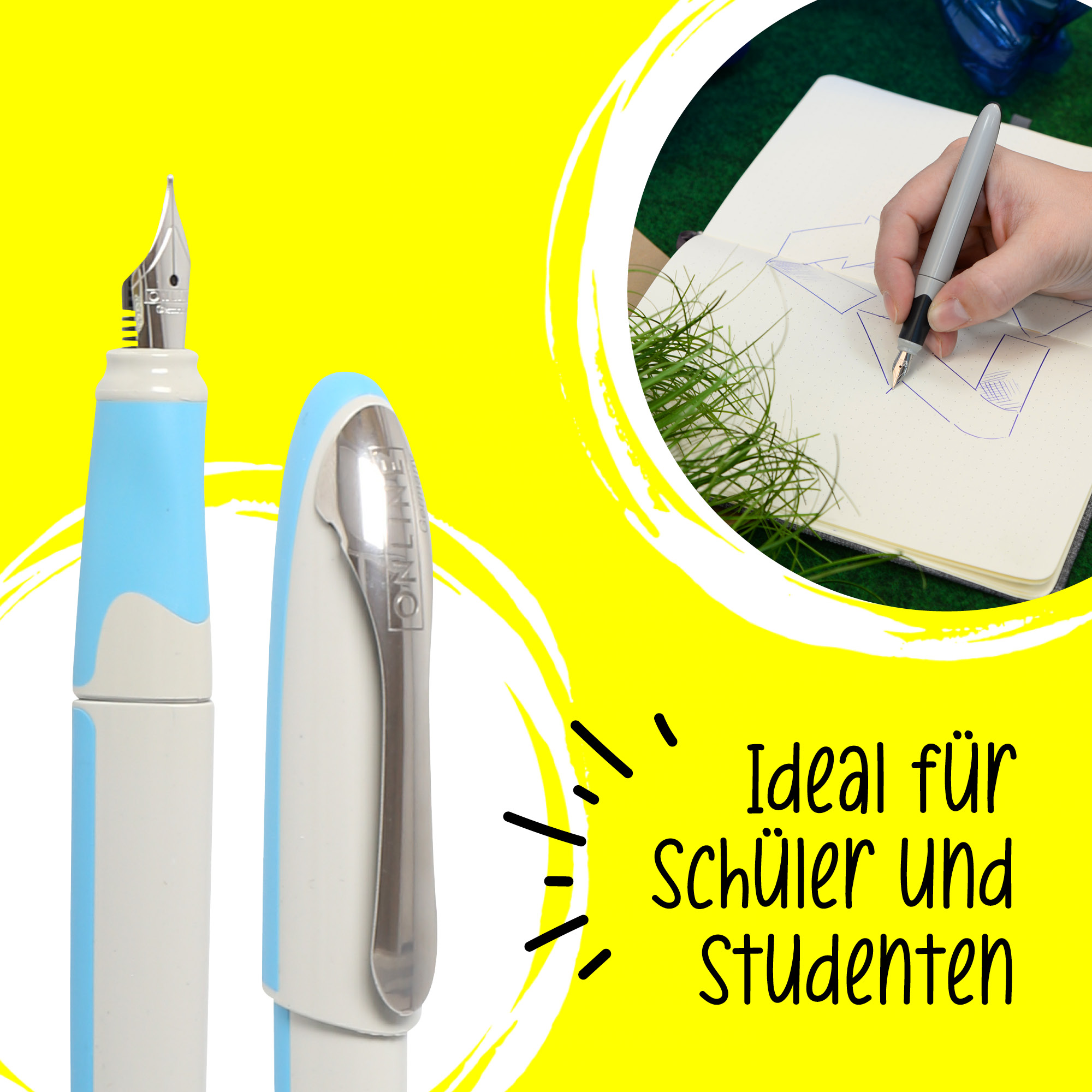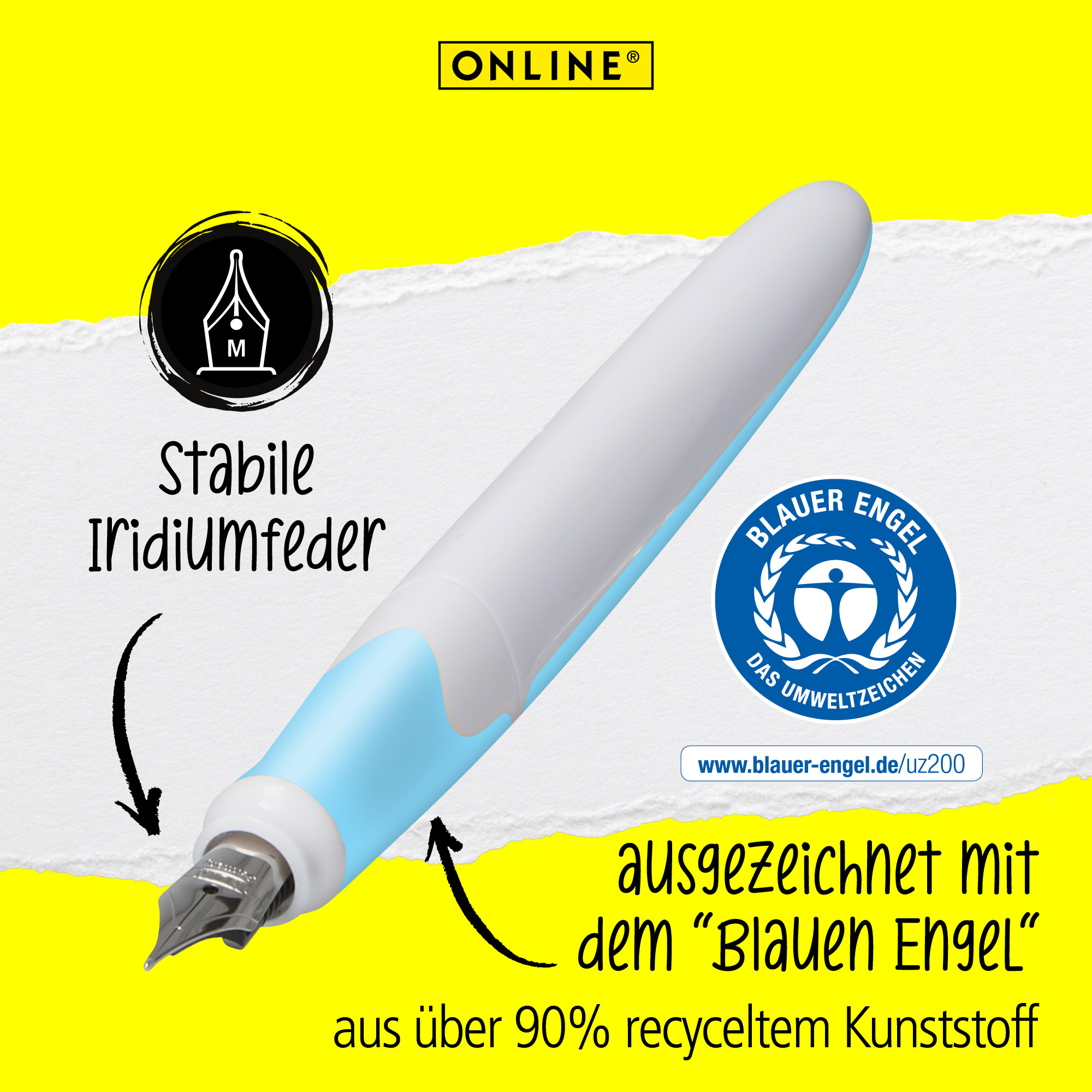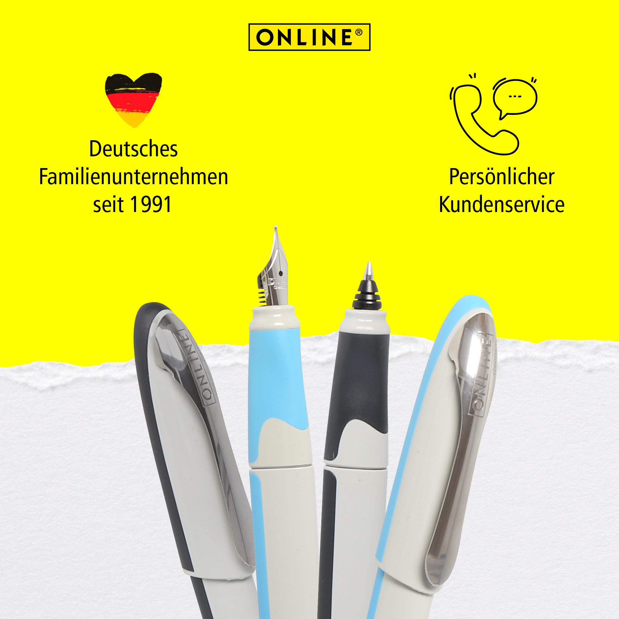 This pen impresses all the way from the cap to the shaft with its soft triangular shape and a high-quality ergonomic grip part. With the ONLINE AIR, writing means pure pleasure, whether at school, at work or at home. The premium style of the whole fountain pen as well as the high-quality iridium nib in size M (medium) stand for the sustainable and thorough quality of this writing instrument, emphasized by the sturdy metal clip. Each pen represents tested quality – Made in Germany. Refillable with ONLINE Combi cartridges, two small standard ink cartridges or a converter.