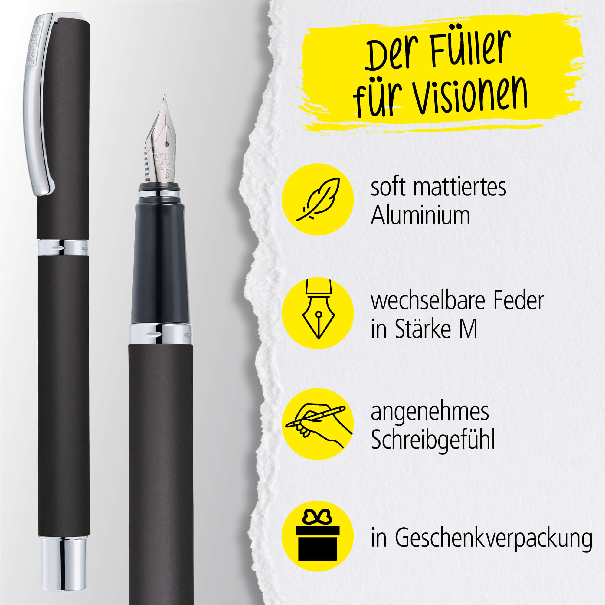 SIMPLE ELEGANCE: The ONLINE design fountain pen impresses with its high-quality, simple appearance, a robust aluminium surface and a spring-loaded metal clip. Together with the gift packaging, it makes an ideal present for lovers of clear shapes and precise technology - and is guaranteed to be an eye-catcher at university or in the office.