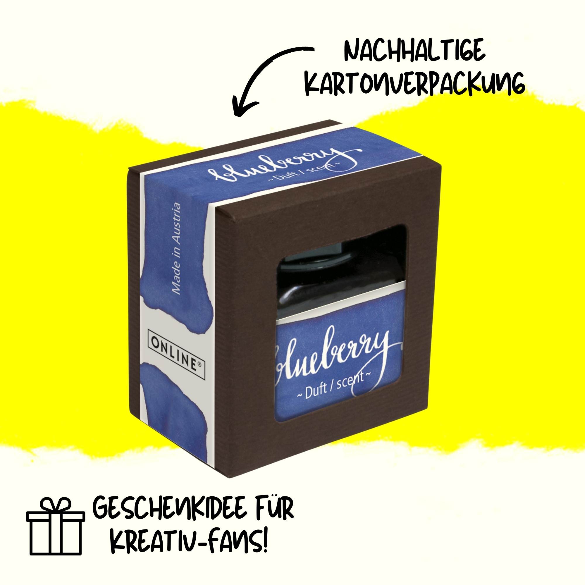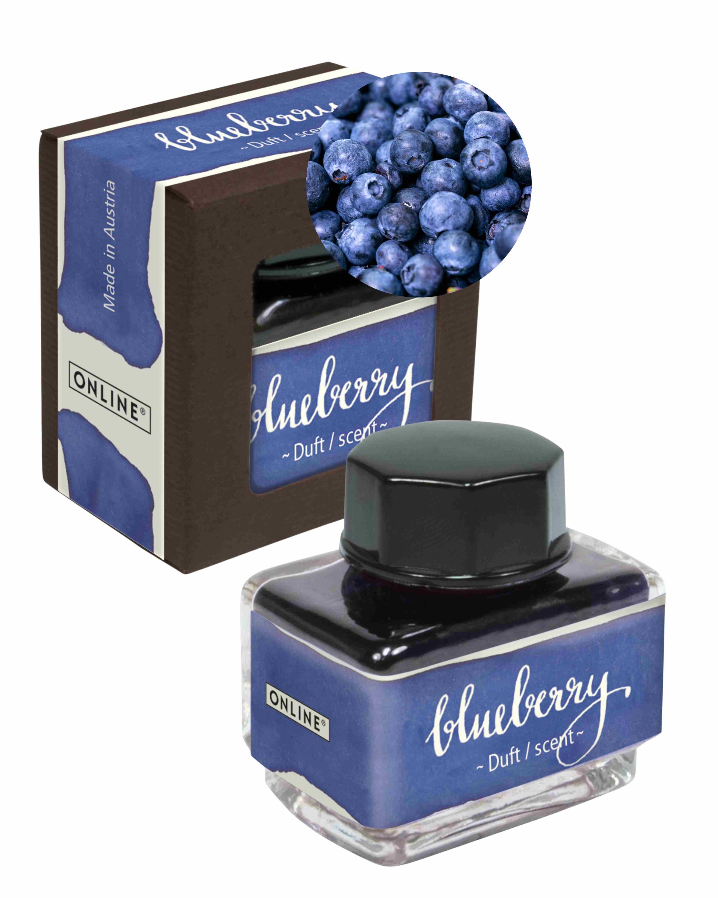 High-quality ink, colour Royal Blue, with scent “Blueberry” is the new fragrance collection with balancing effect and activates the senses. Inspired by beguiling fragrance substances from nature, these innovative inks release their unique aroma during writing. These scented ink colours will inspire you while writing and creating beautiful letters – and will captivate the recipient. A message that bestows a special charm on the written word. Every ink bottle is packed in a high-quality packaging.