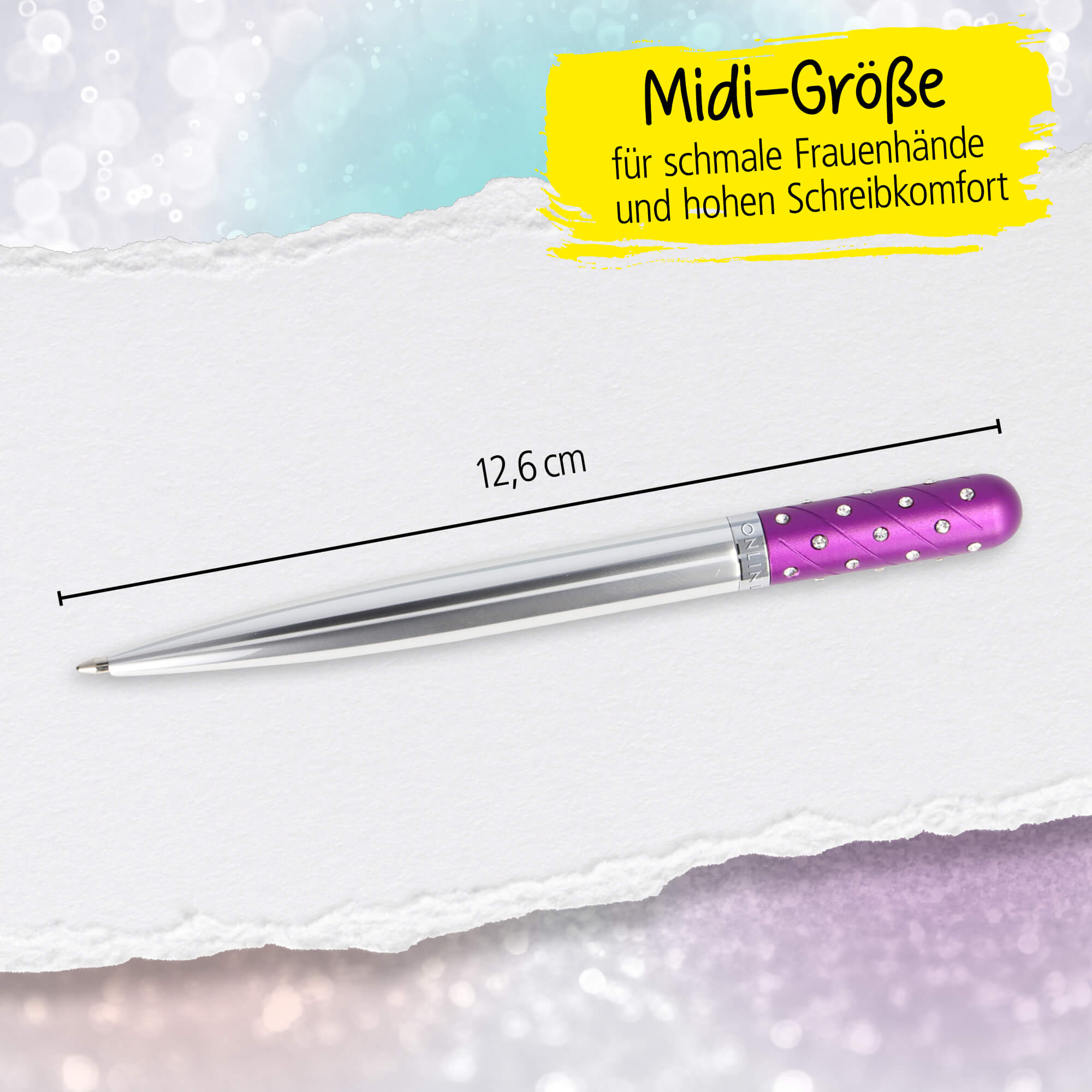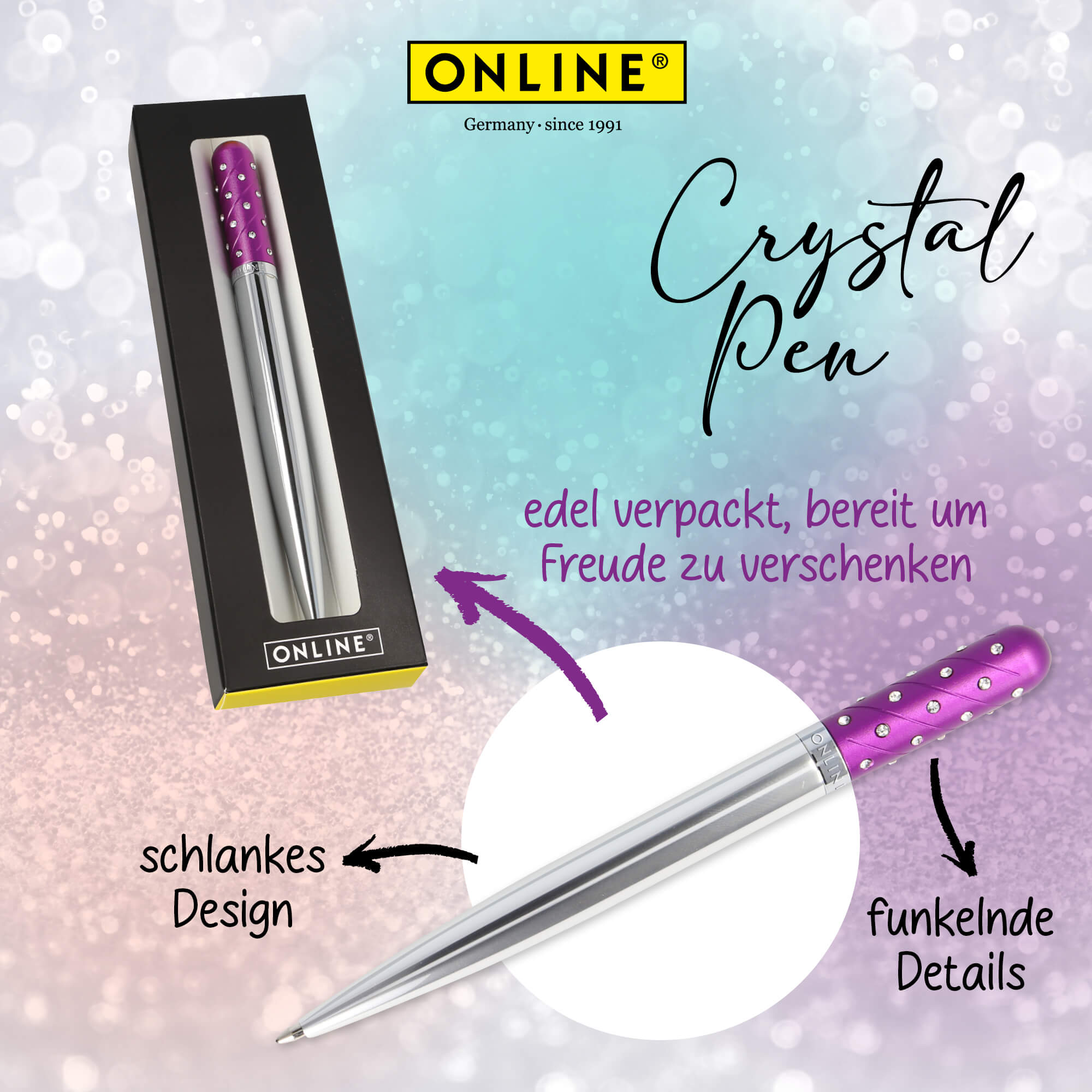 - DESIGN BALLPEN: The ballpen is made from pure aluminium. The sparkling rhinestones give the pen a modern look