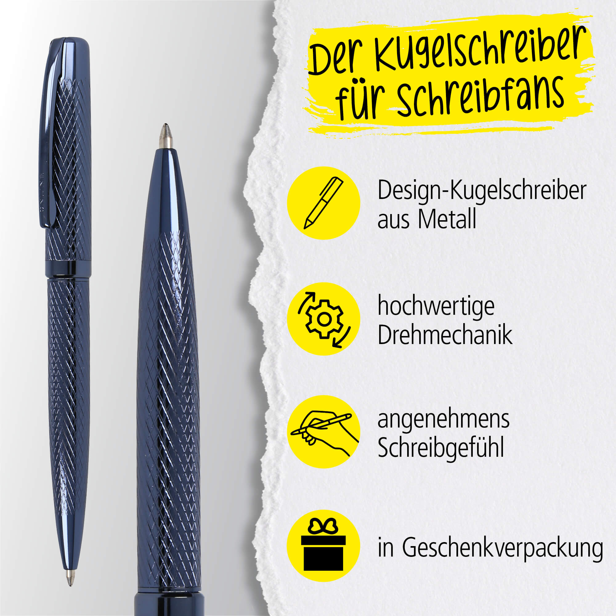 Our Eleganza Diamond Night combines a simple design with a high level of comfort. The biros in deep midnight blue is both elegant and eye-catching. Its ribbed surface ensures that it sits comfortably in the hand. This means you can write for long periods of time without any effort. The lightweight aluminium material makes it stable yet pleasantly light.