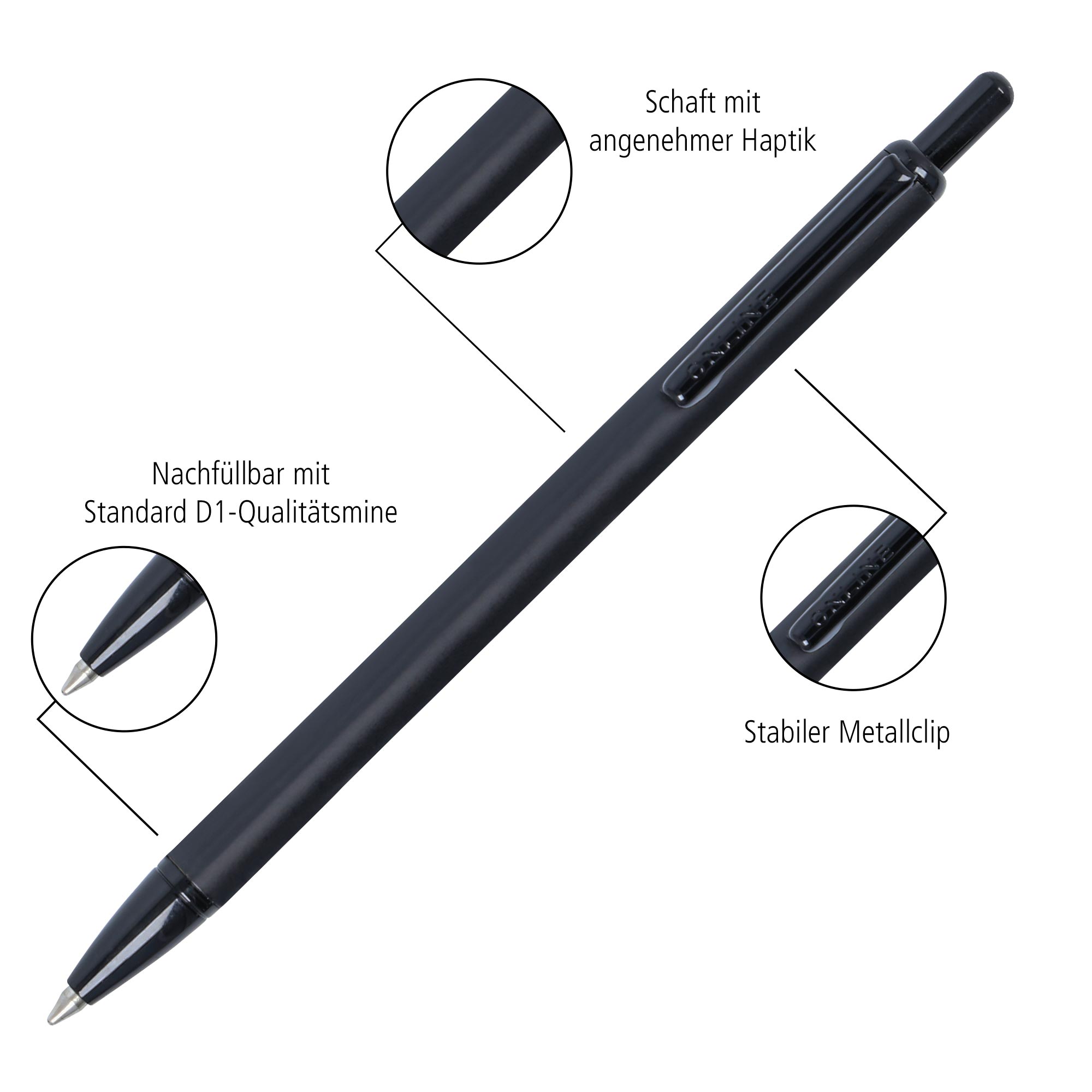 The ballpen has a metal clip, comfortable twist action mechanism, D1 standard refill containing black ink.