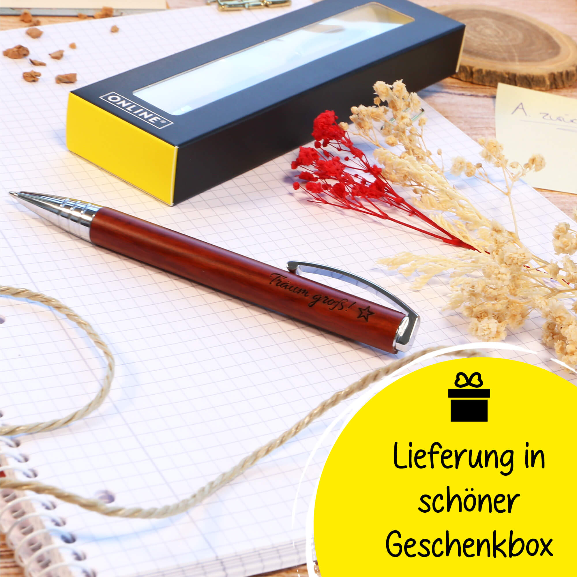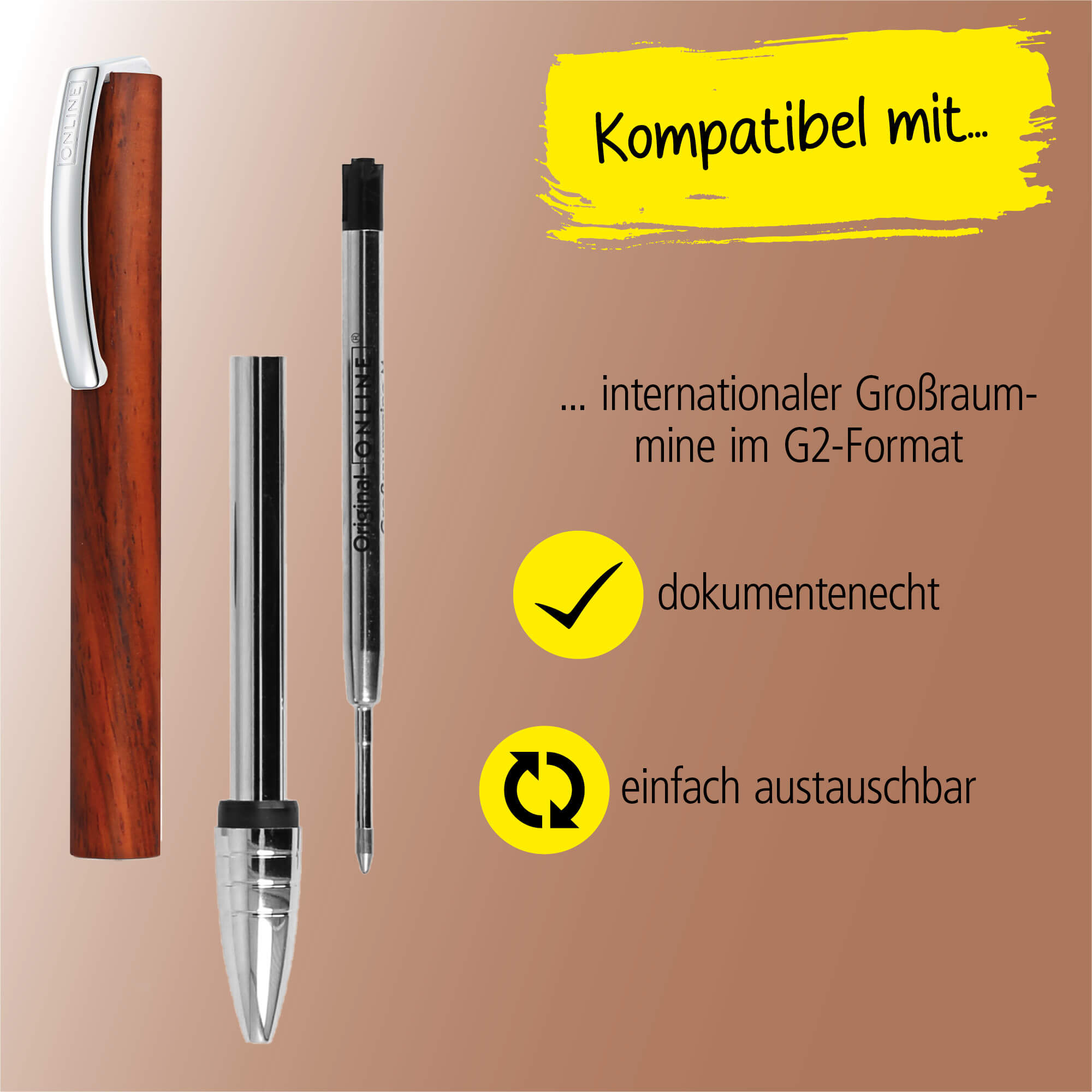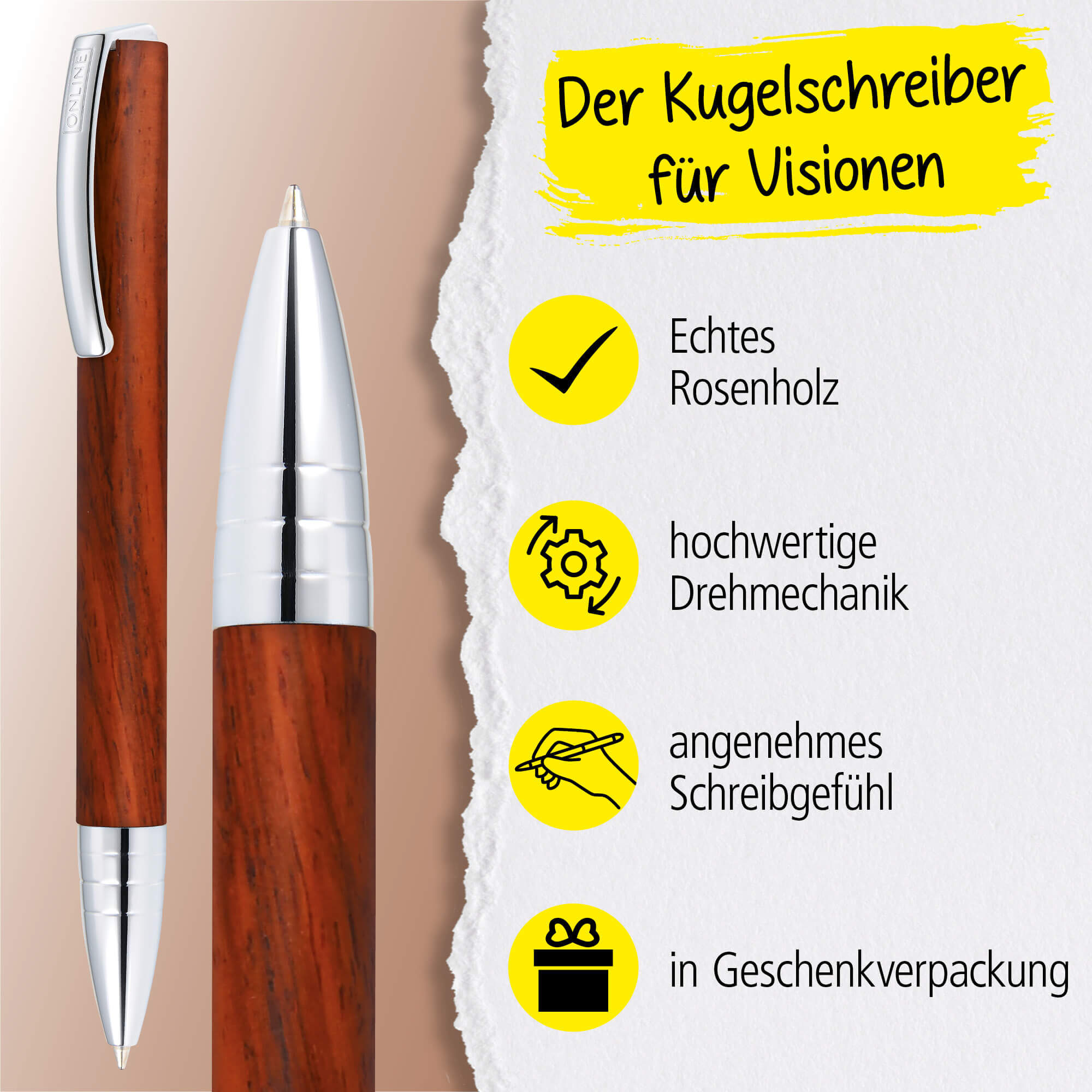SIMPLE ELEGANCE: The ONLINE Vision ballpoint pen impresses with its high-quality, simple appearance, its smooth wooden surface and a spring-loaded metal clip – serious and ideal for university, the office or your own desk.
