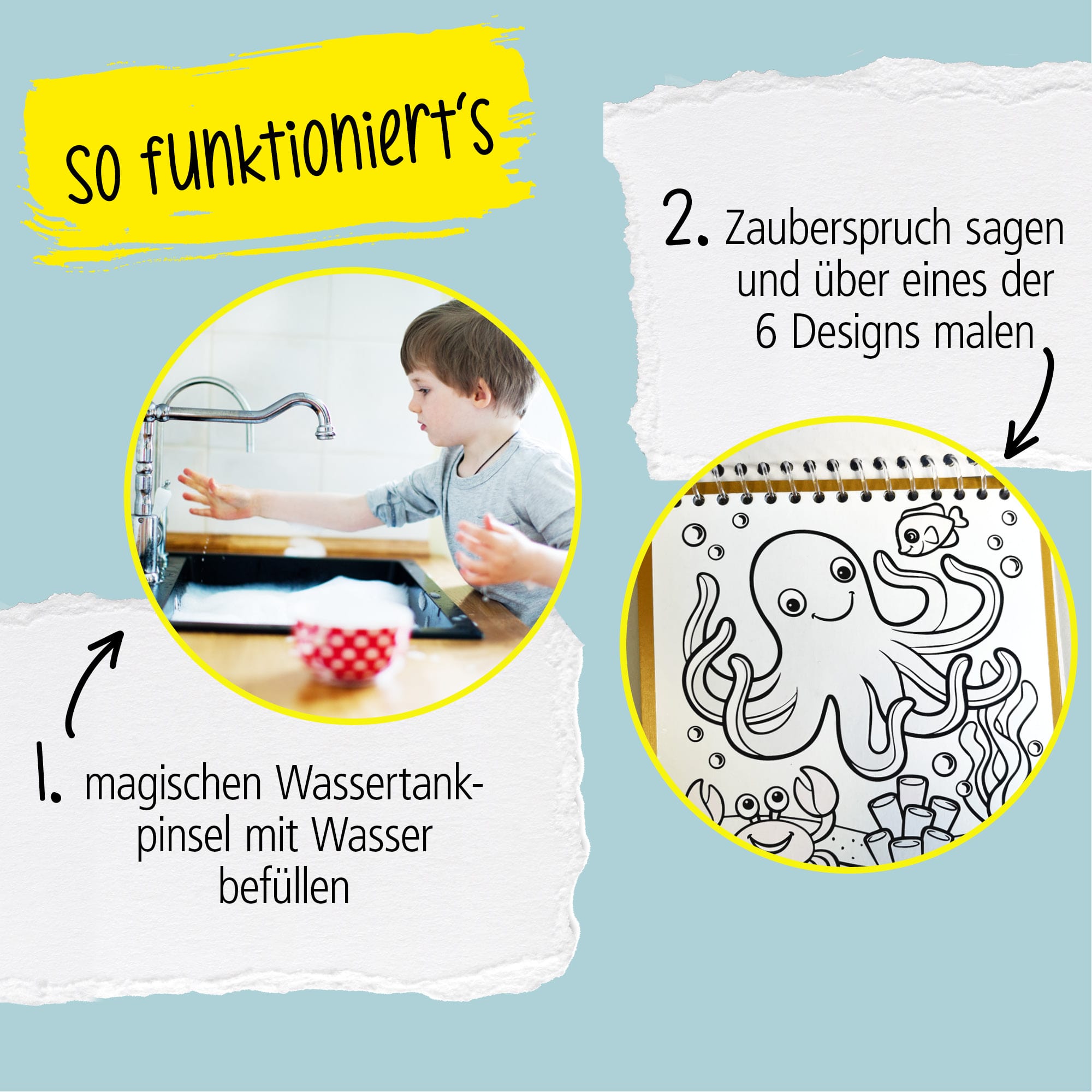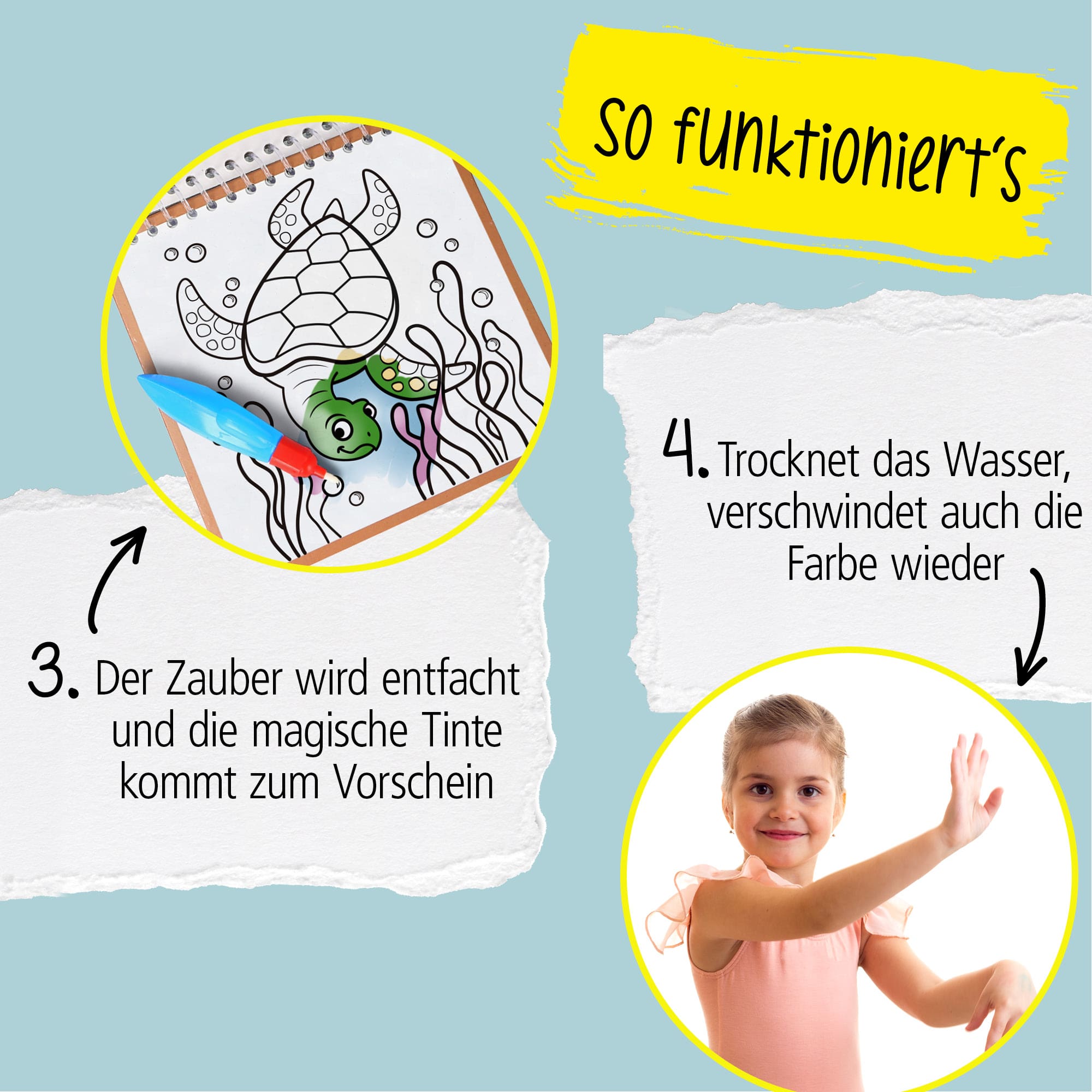 REUSABLE: As the colour disappears when the pages dry, the water crayon colouring book with 6 motifs is reusable and the colouring adventure can be relived as often as desired. Ideal for children aged 3 and over.