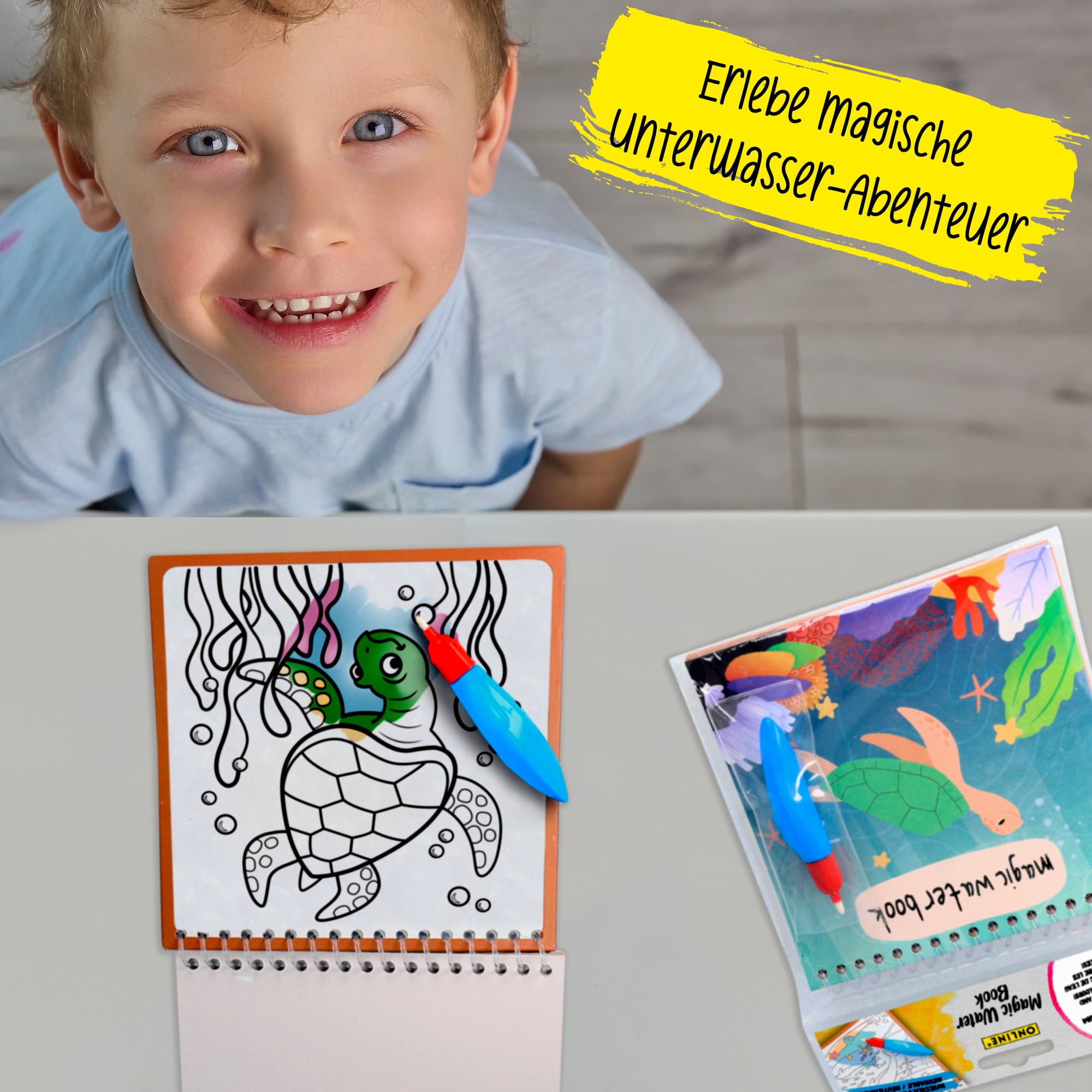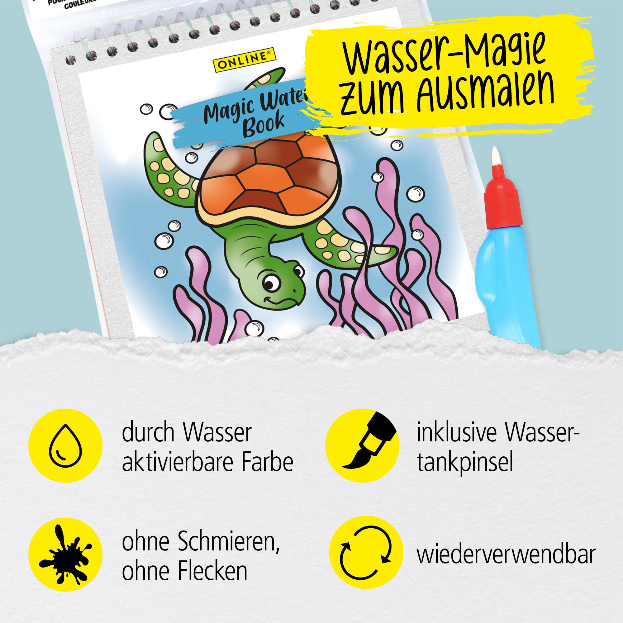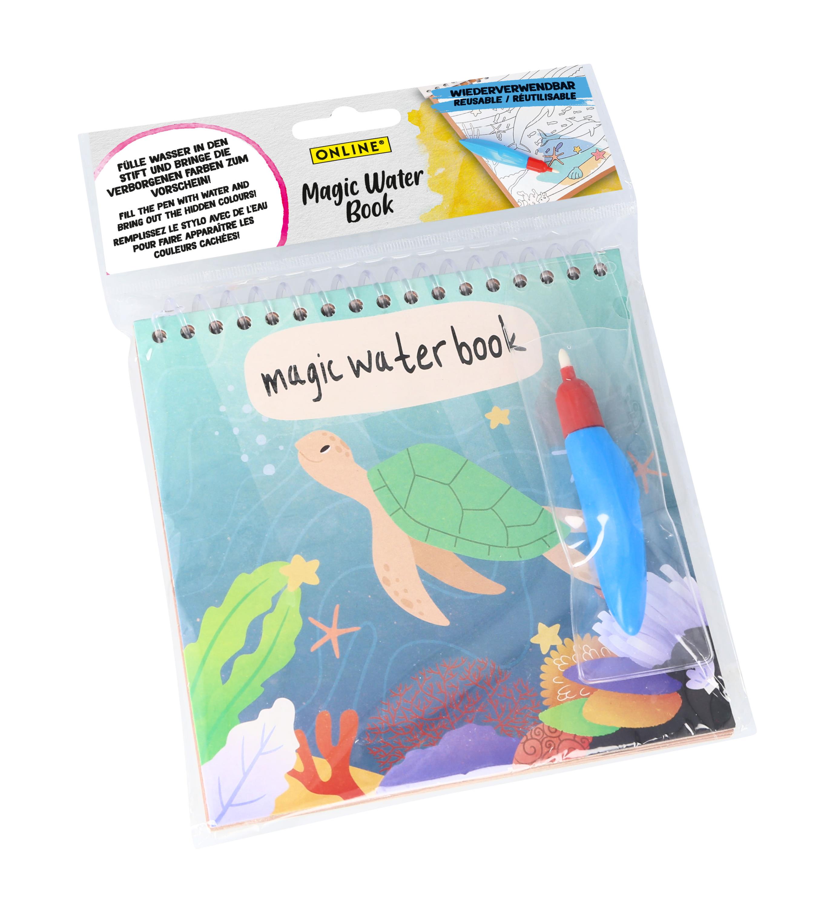 SIMPLY MAGICAL: With the reusable Magic Water Colouring Book from ONLINE, magic is brought into everyday life: together with the supplied water tank brush, smudge-free works of art are conjured up that disappear again after drying.