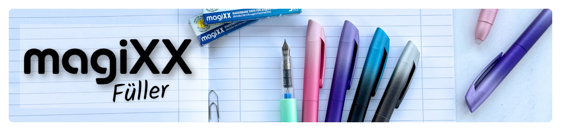 Welcome to our range of high-quality and innovative erasable pens and accessories! Discover the perfect combination of writing comfort and correction possibilities with our erasable gel pens, replacement refills, as well as erasable ink cartridge rollerballs and ink cartridges. Our magiXX erasable gel pens offer a smooth and even writing experience that is suitable for everyday use as well as for school and the office. With their quick-drying gel ink, you can write smoothly without worrying about smudging or smearing. And the best thing about it? If you make a mistake, it's no problem! Thanks to the integrated eraser, you can correct your mistakes in no time at all. Fully sustainable! Do you love your writing instrument and want to use it for longer? We offer a selection of replacement refills. These high-quality refills are specially designed for our erasable gel pens and ensure that you can always enjoy reliable writing performance. You'll never have to worry about running out of your favourite pens again - with our replacement refills, you'll always have a spare on hand. The refills are compatible with the magiXX erasable gel pen from ONLINE and Pilot FriXion ballpoint pens.When it comes to erasable ink cartridge rollerballs and ink cartridges, we offer a variety of options to meet your individual writing needs. Our magiXX rollerballs use a special ink that ensures a fast drying time and a smooth writing experience. Our range of erasable pens and accessories are not only practical and functional, but also stylish and versatile. Whether you use them for taking notes in class, in the office or for creative projects, our products are the perfect choice for anyone who values quality and convenience. Buy your magiXX erasable gel pen, replacement refills or the erasable ink cartridge rollerball with ink cartridges today and experience a new dimension in writing!