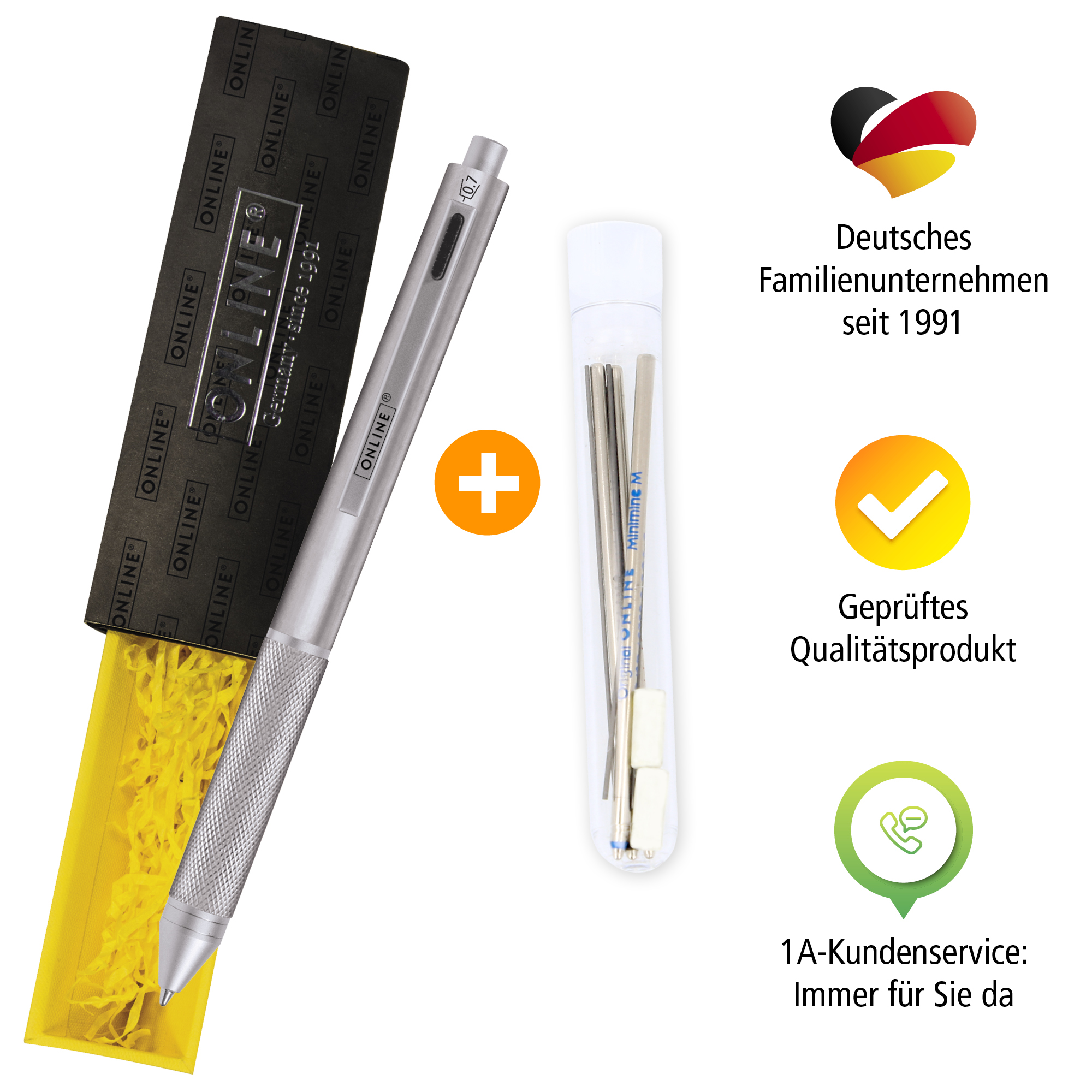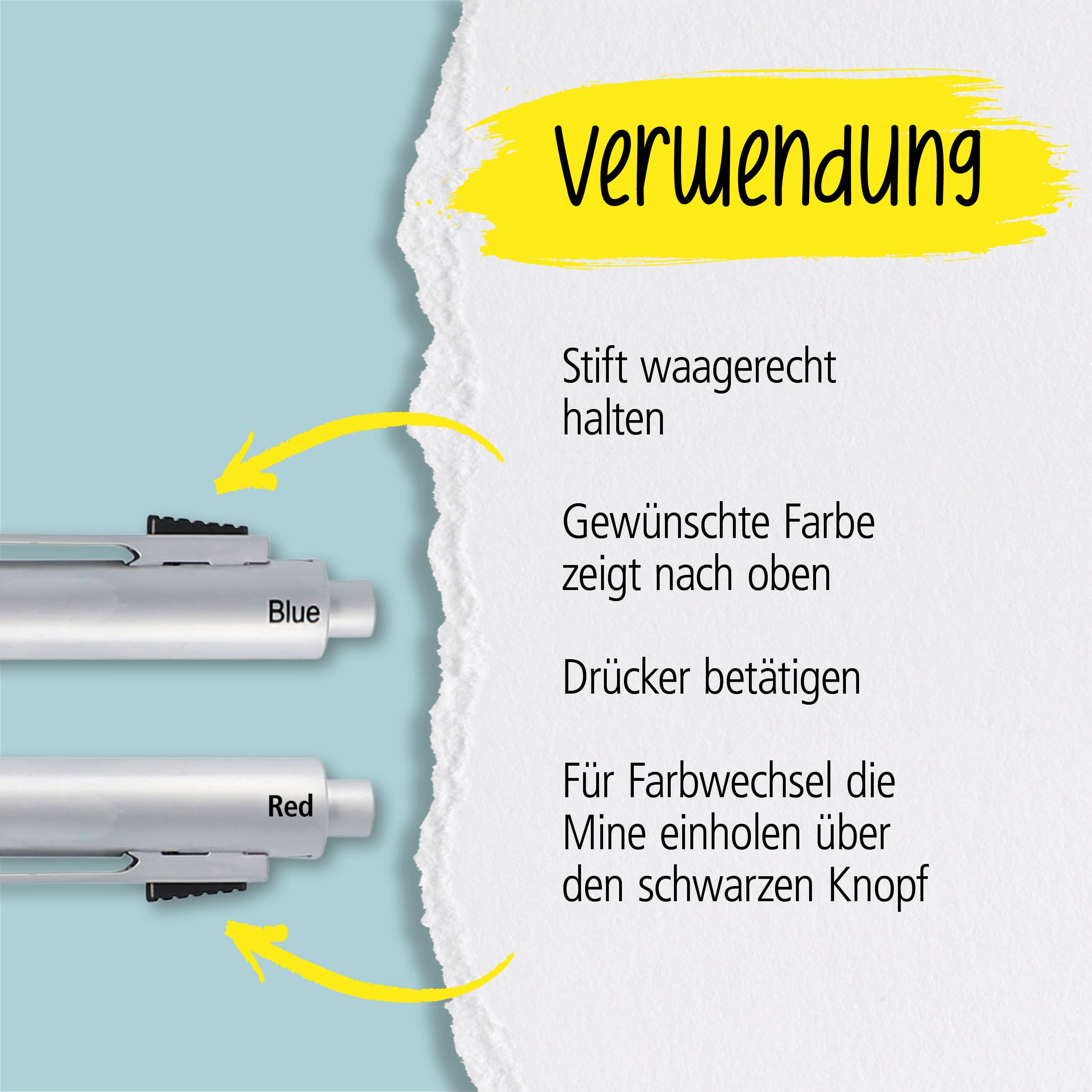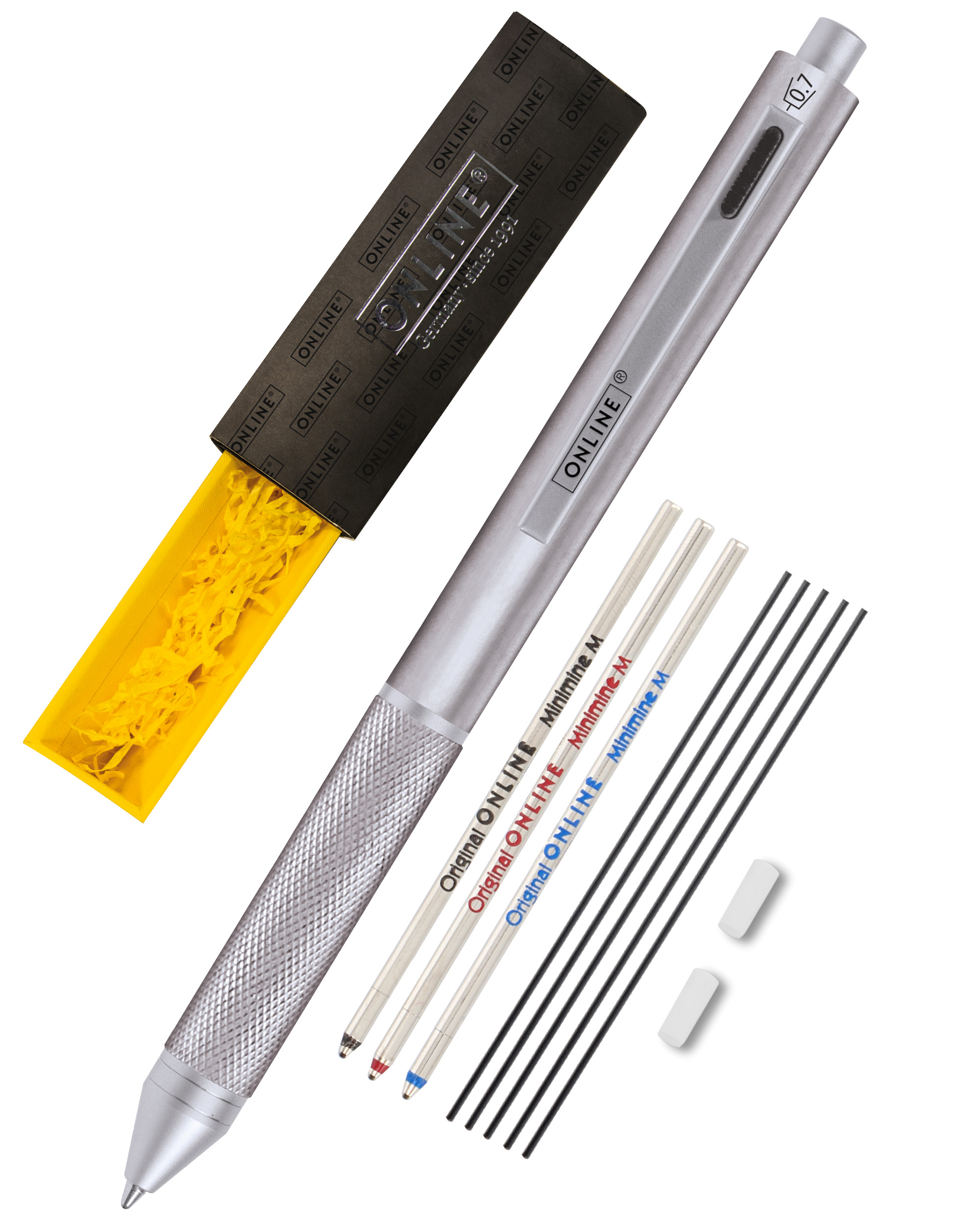 The 4–in-1 pen is made of metal, a multifunctional ballpen with blue, and red refills, neon highlighter orange, mechanical pencil 0.5 mm and eraser.Incl. extra refills.