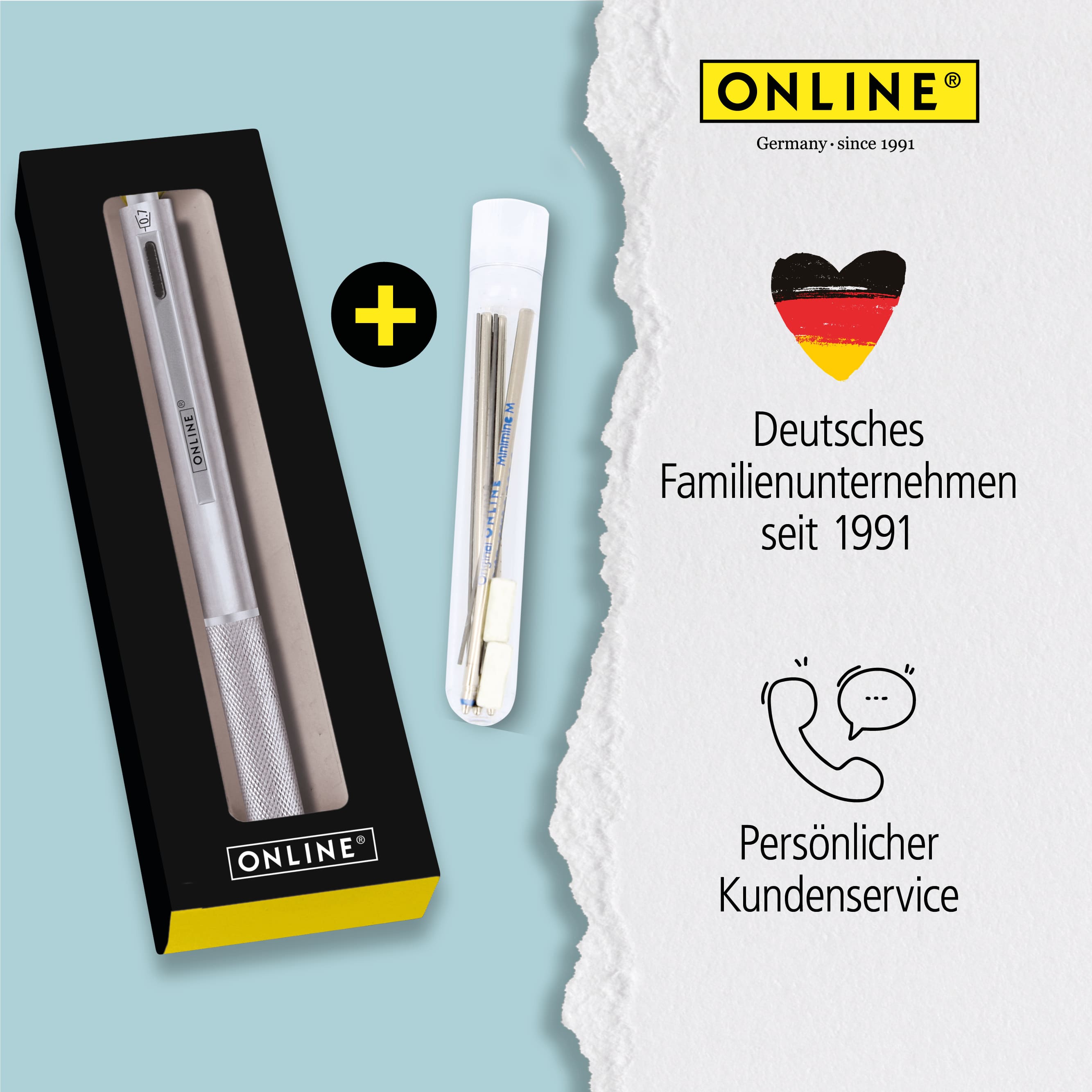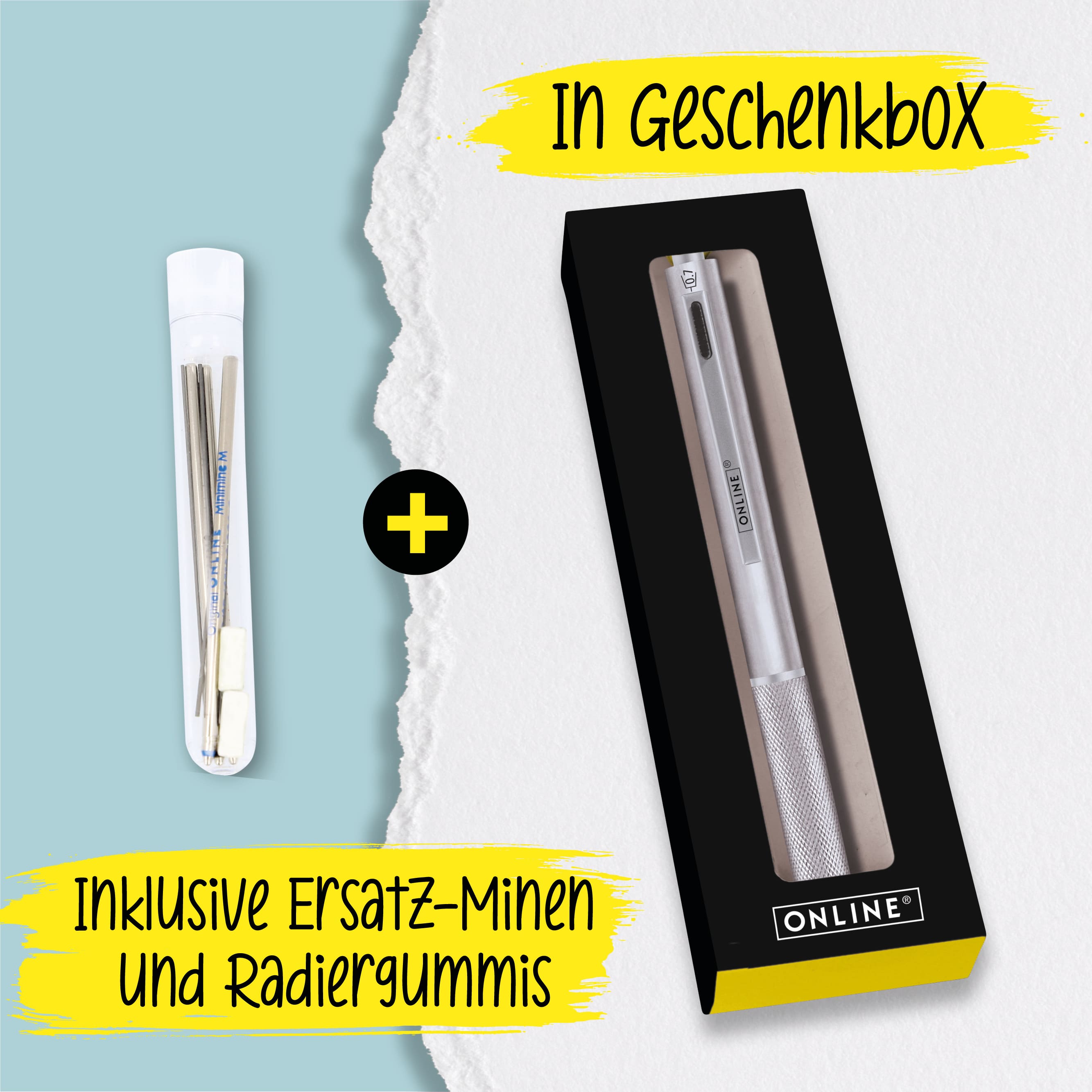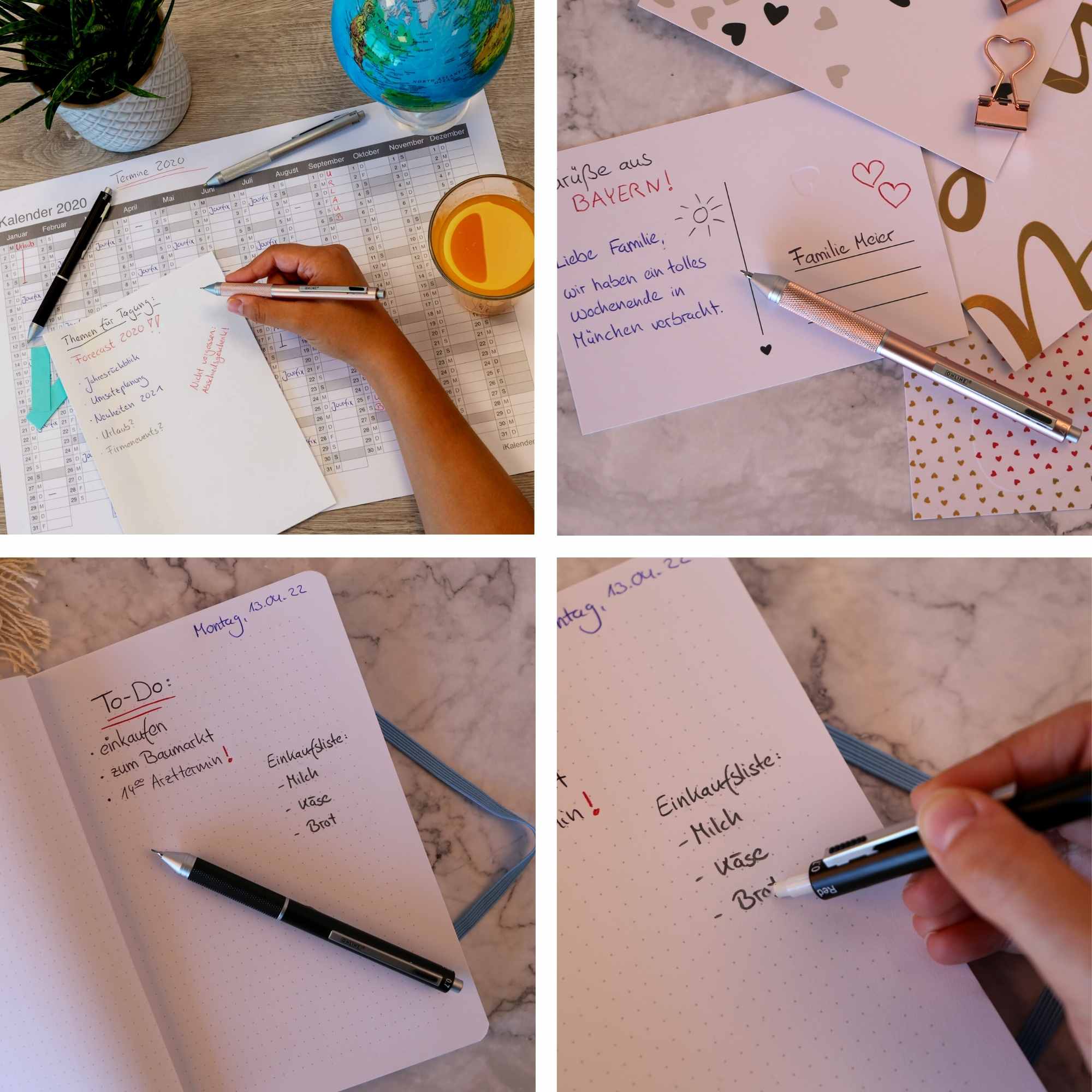 The 4–in-1 pen is made of metal, a multifunctional ballpen with blue, and red refills, neon highlighter orange, mechanical pencil 0.5 mm and eraser.Incl. extra refills.