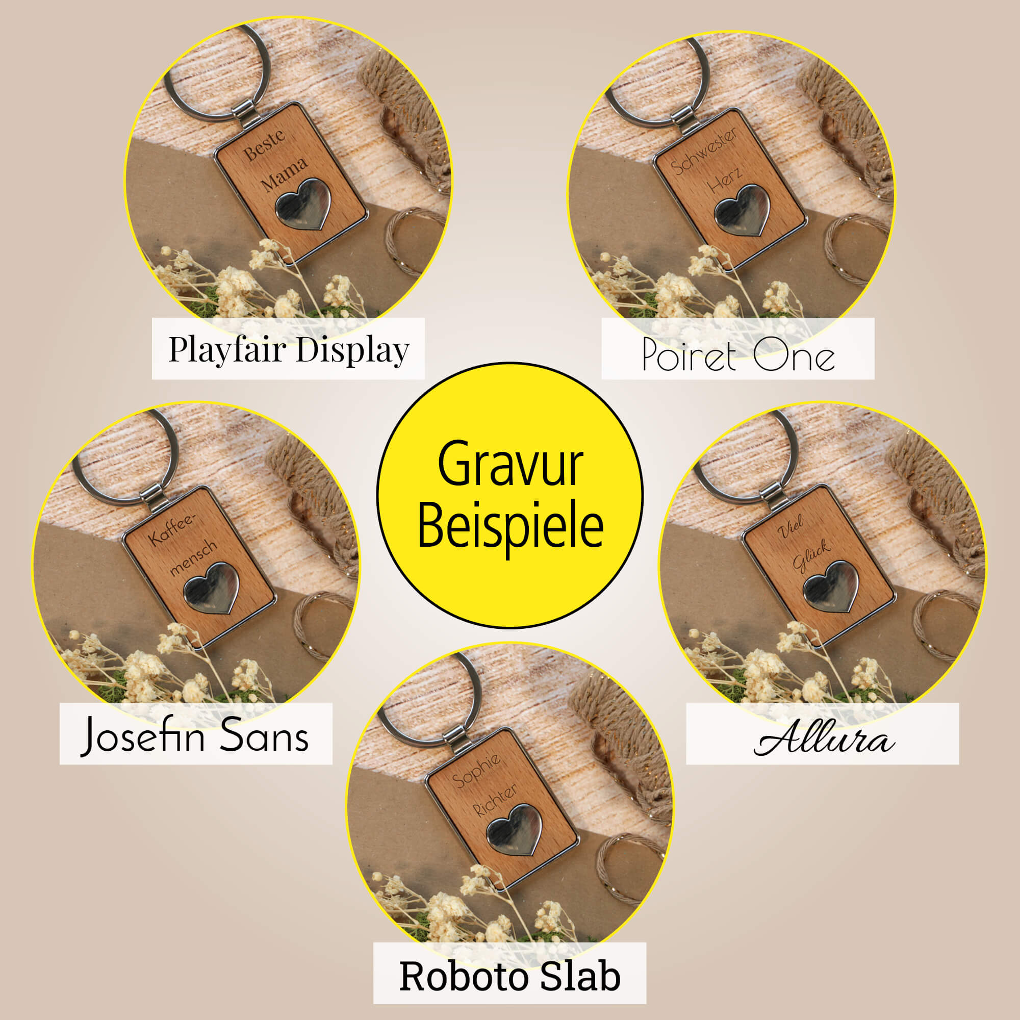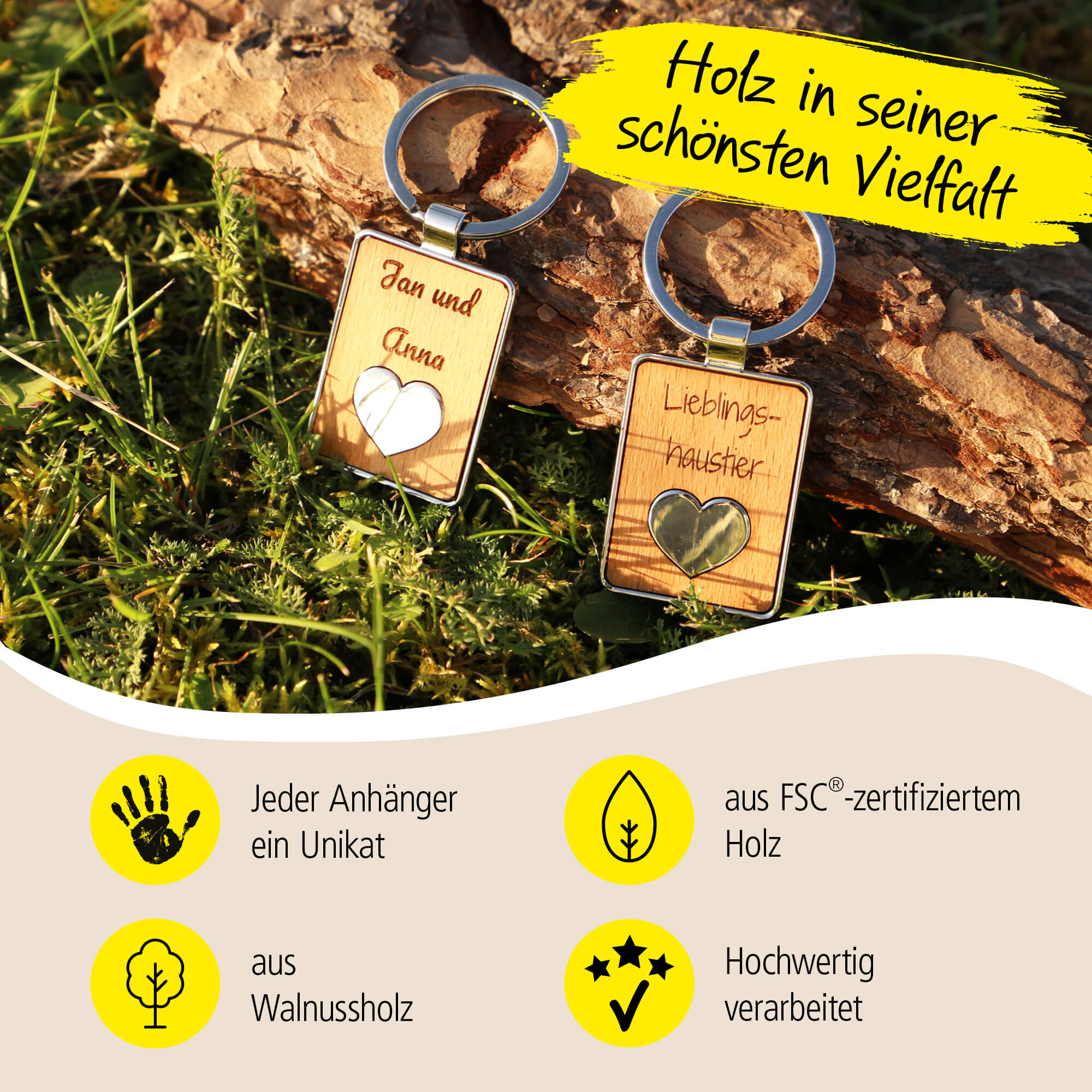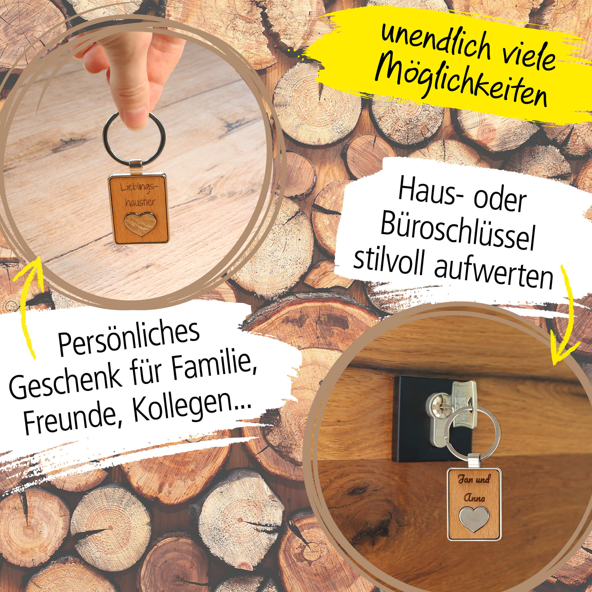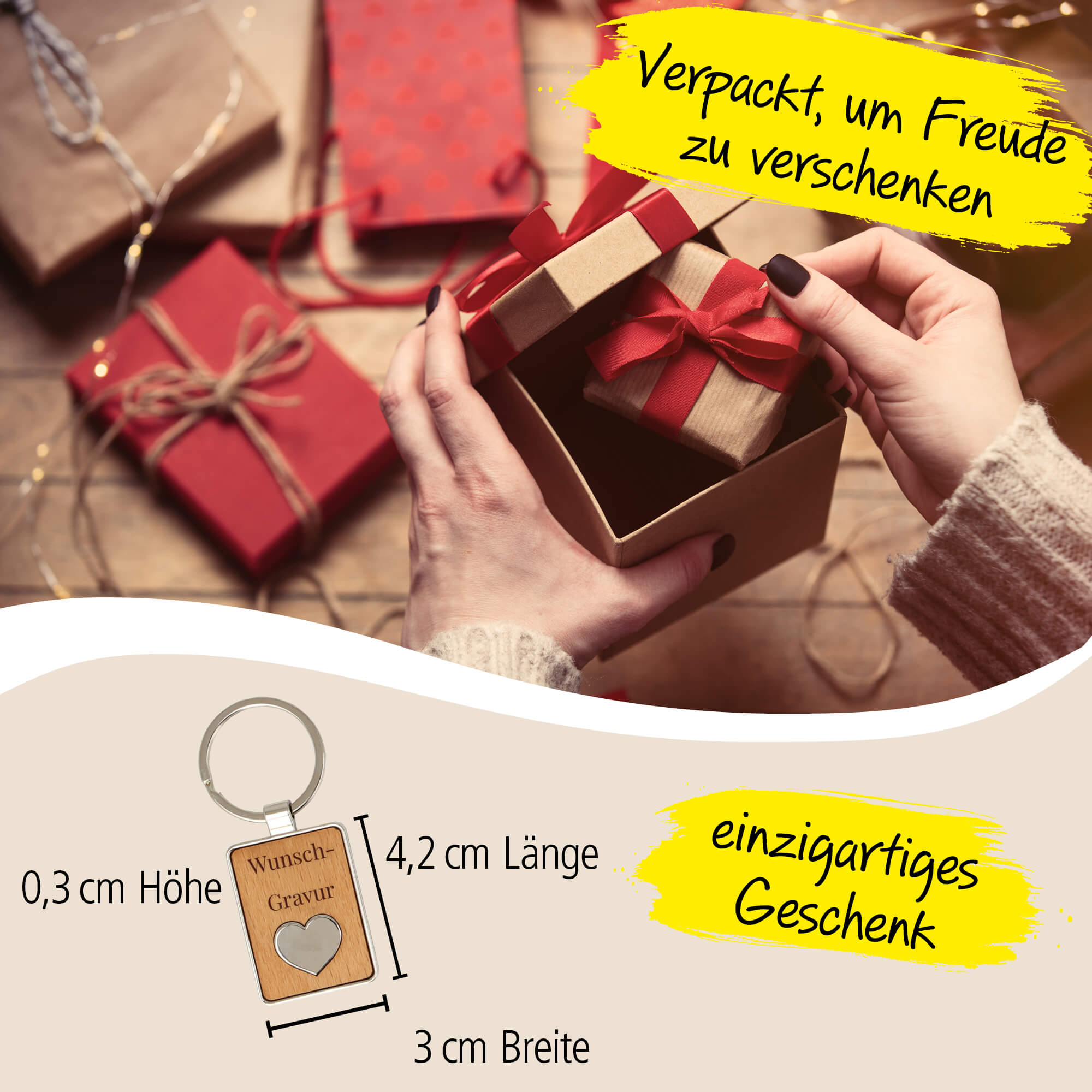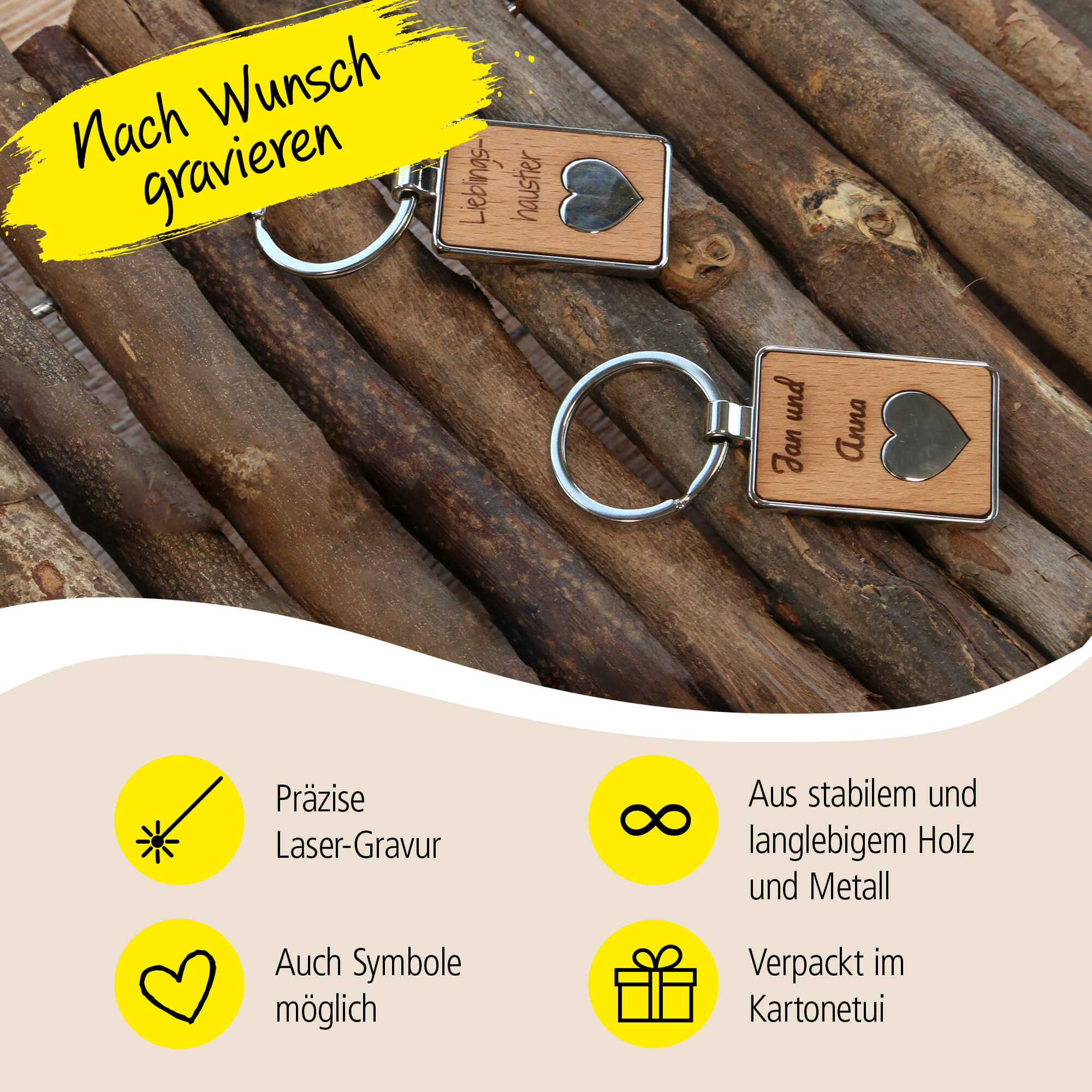 UNIQUE AND BEAUTIFUL: The key ring made of FSC®-certified wood with an embedded metal heart becomes a personal highlight with your individual engraving and is the perfect gift idea for any occasion. Whether it's a “drive safely” for passing your driving test, a heartfelt “welcome home” for moving in, or a loving greeting—there are no limits to your creativity!