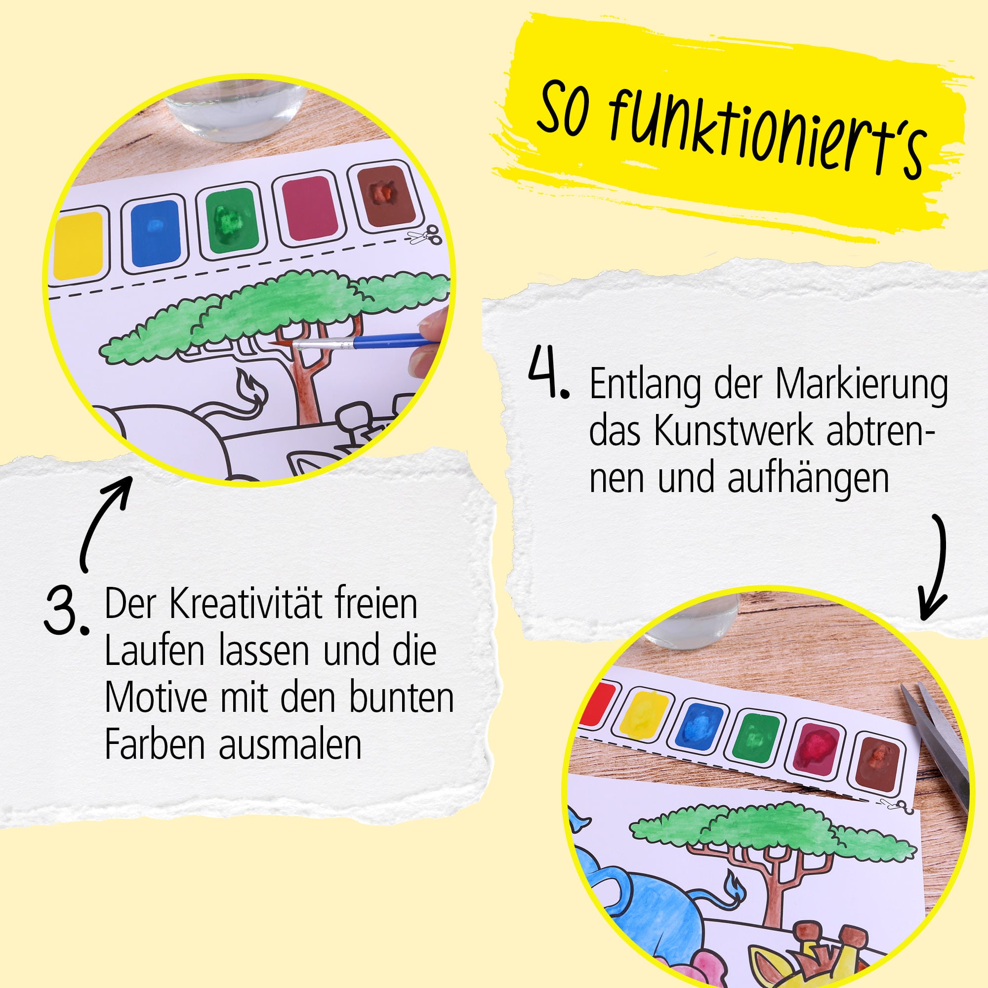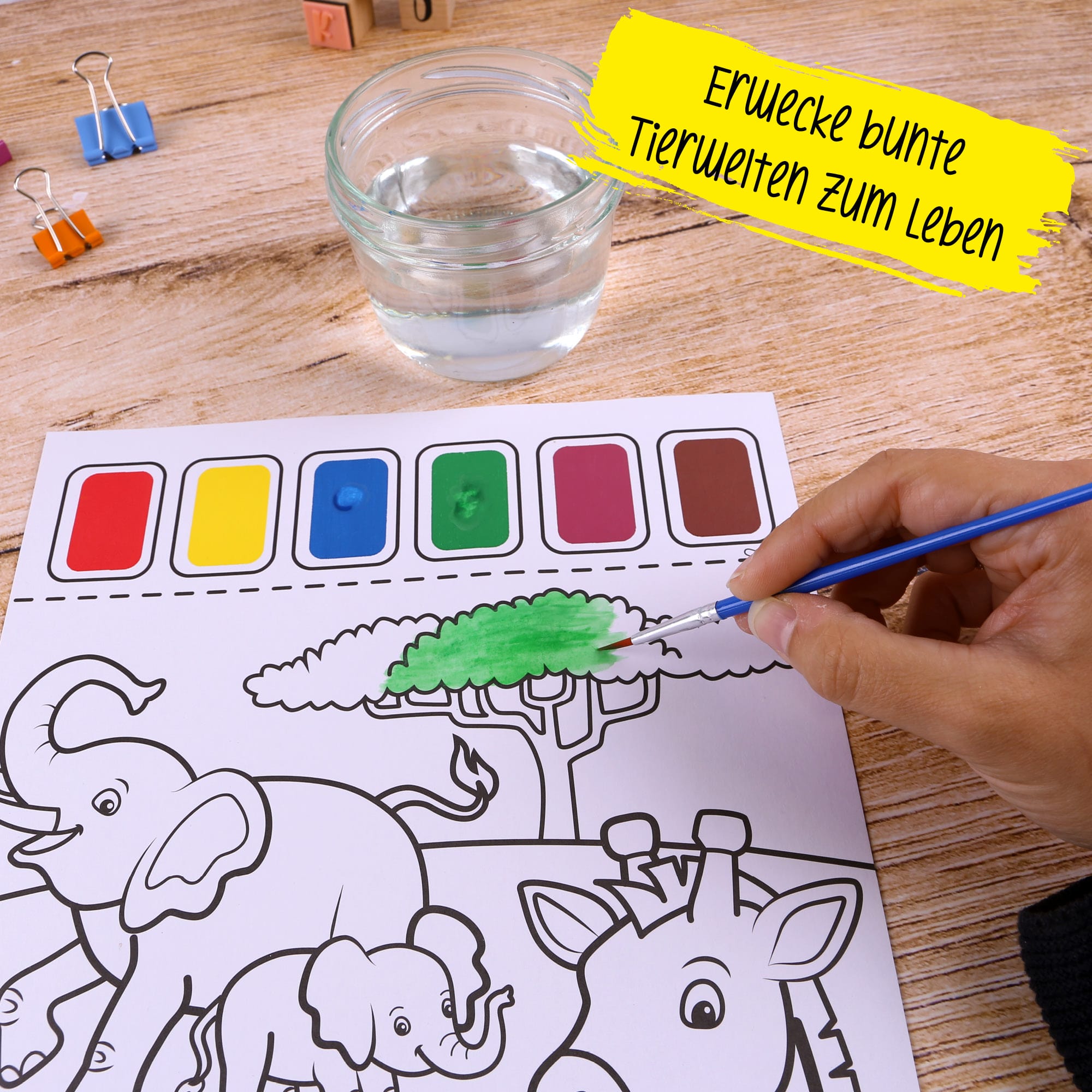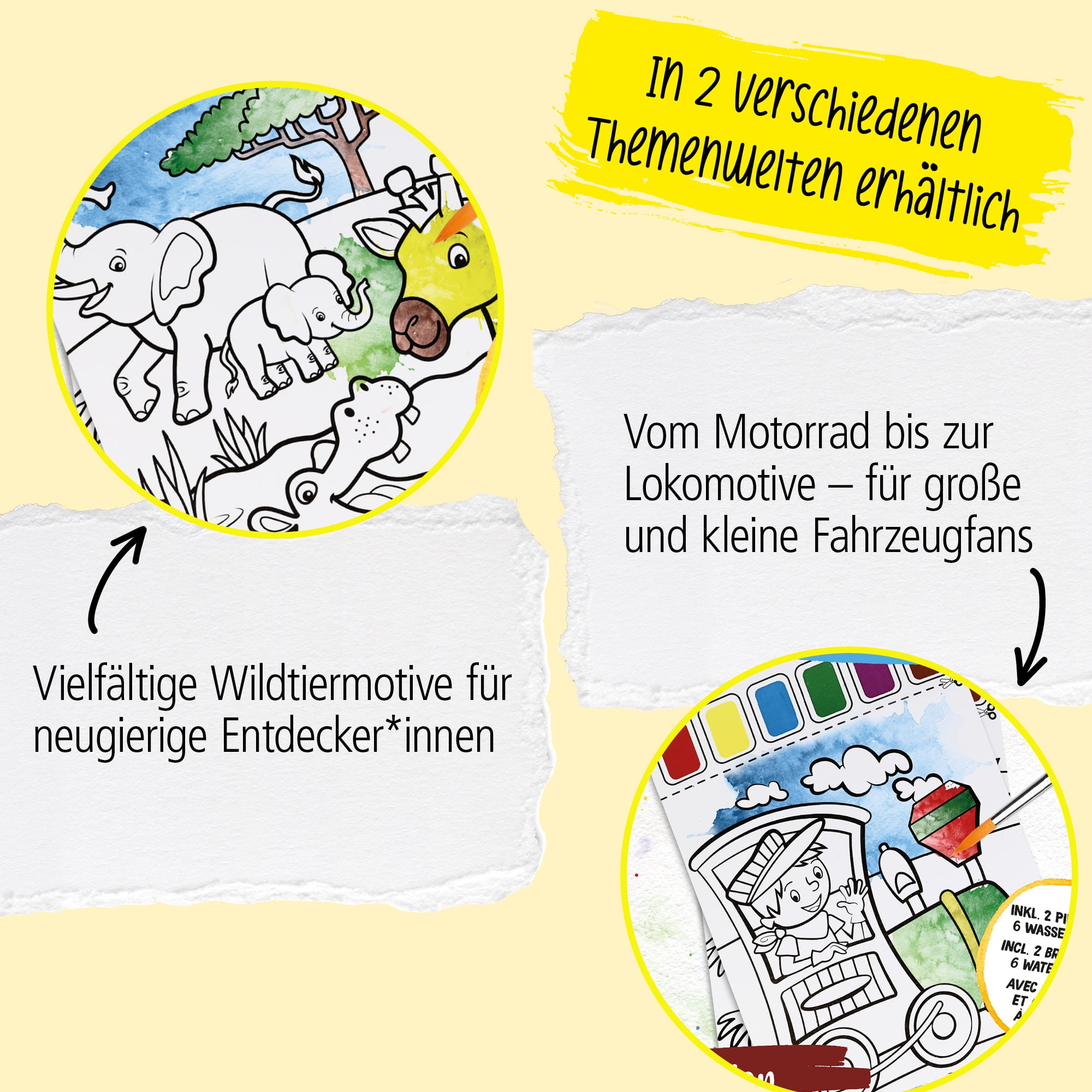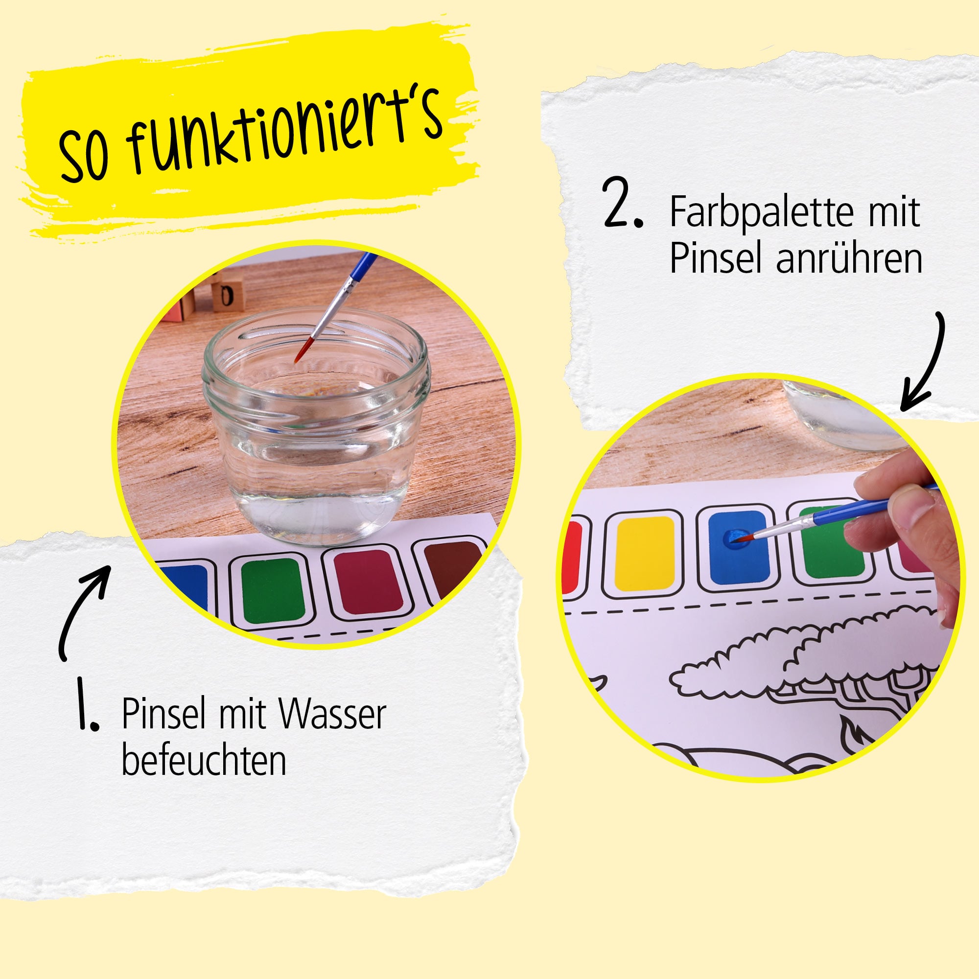 Discover the magic of painting with watercolours! The designs printed on paper of the "Paint with watercolour" set already contain watercolour fields that are brought to life simply by wetting them with one of the included brushes.