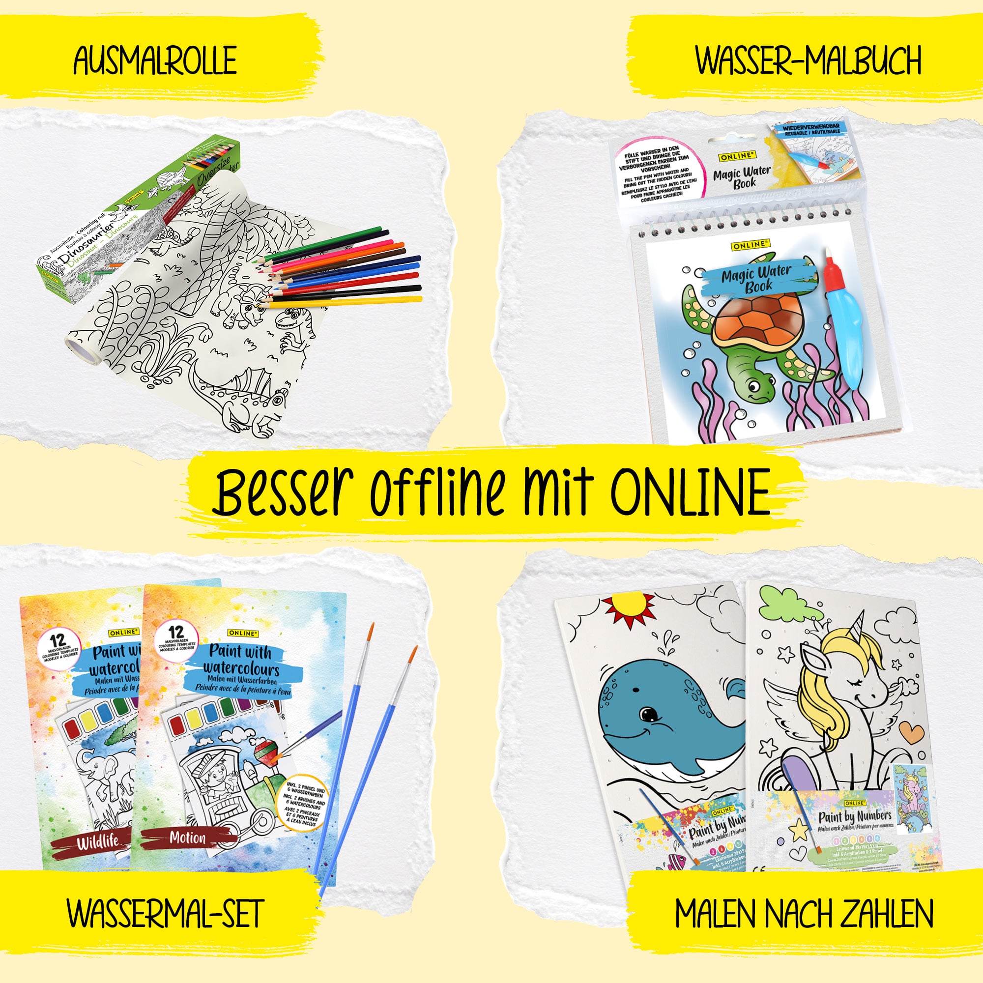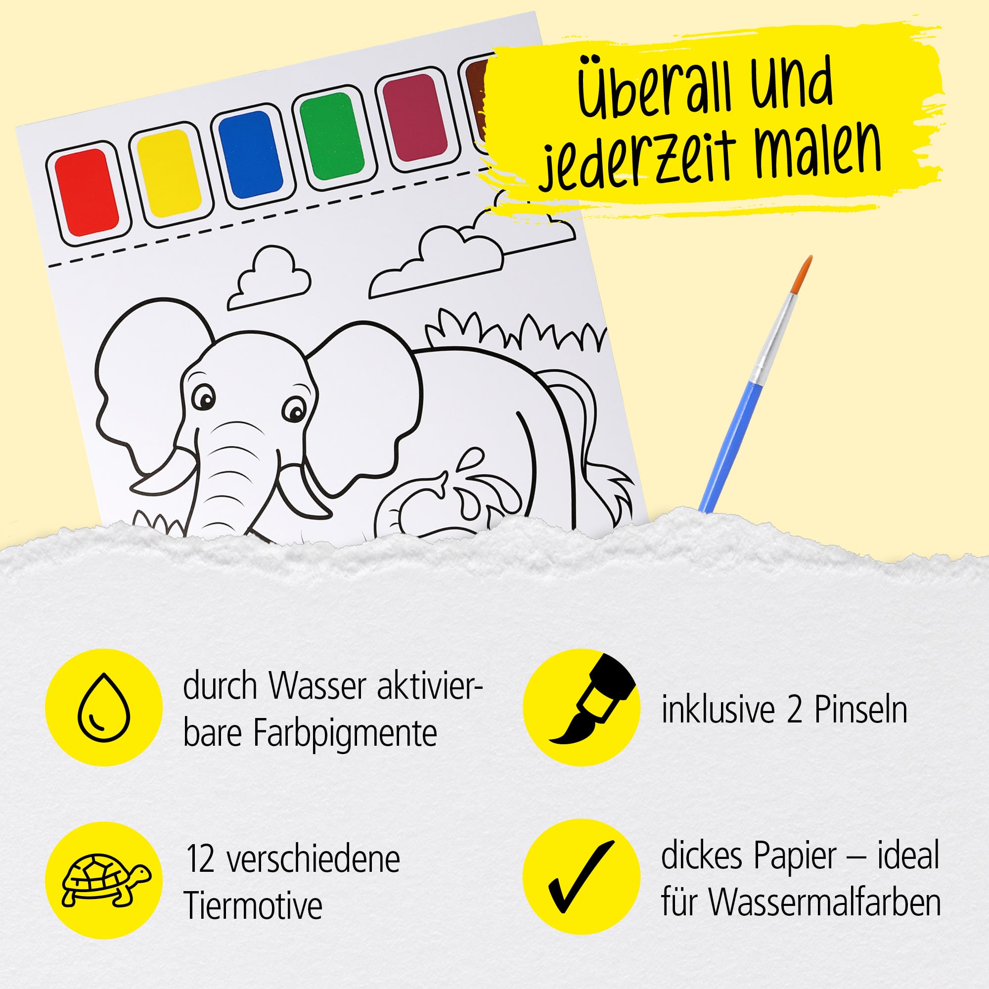 Painting with watercolours, 12 colouring templates, incl. 2 brushes and 6 watercolours
