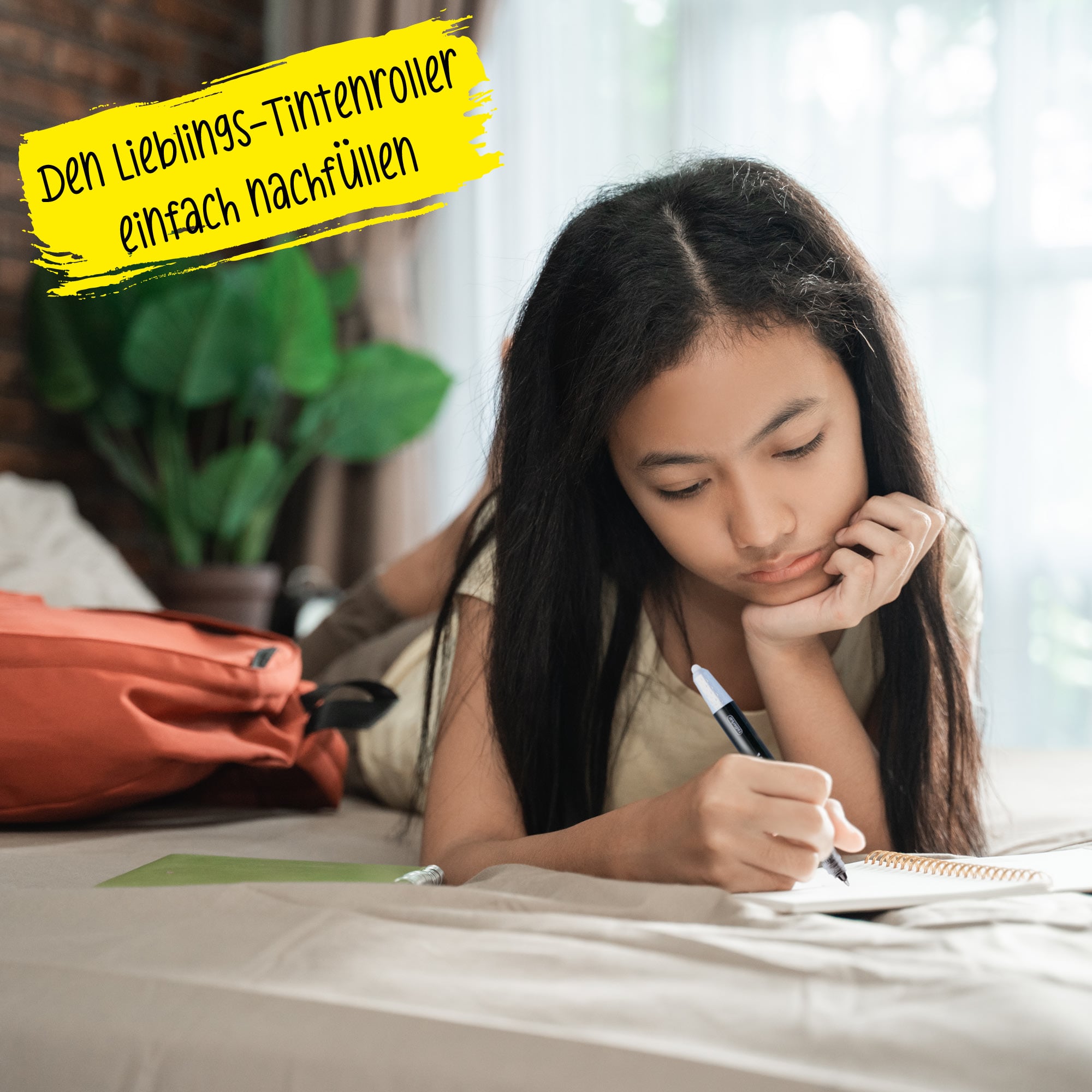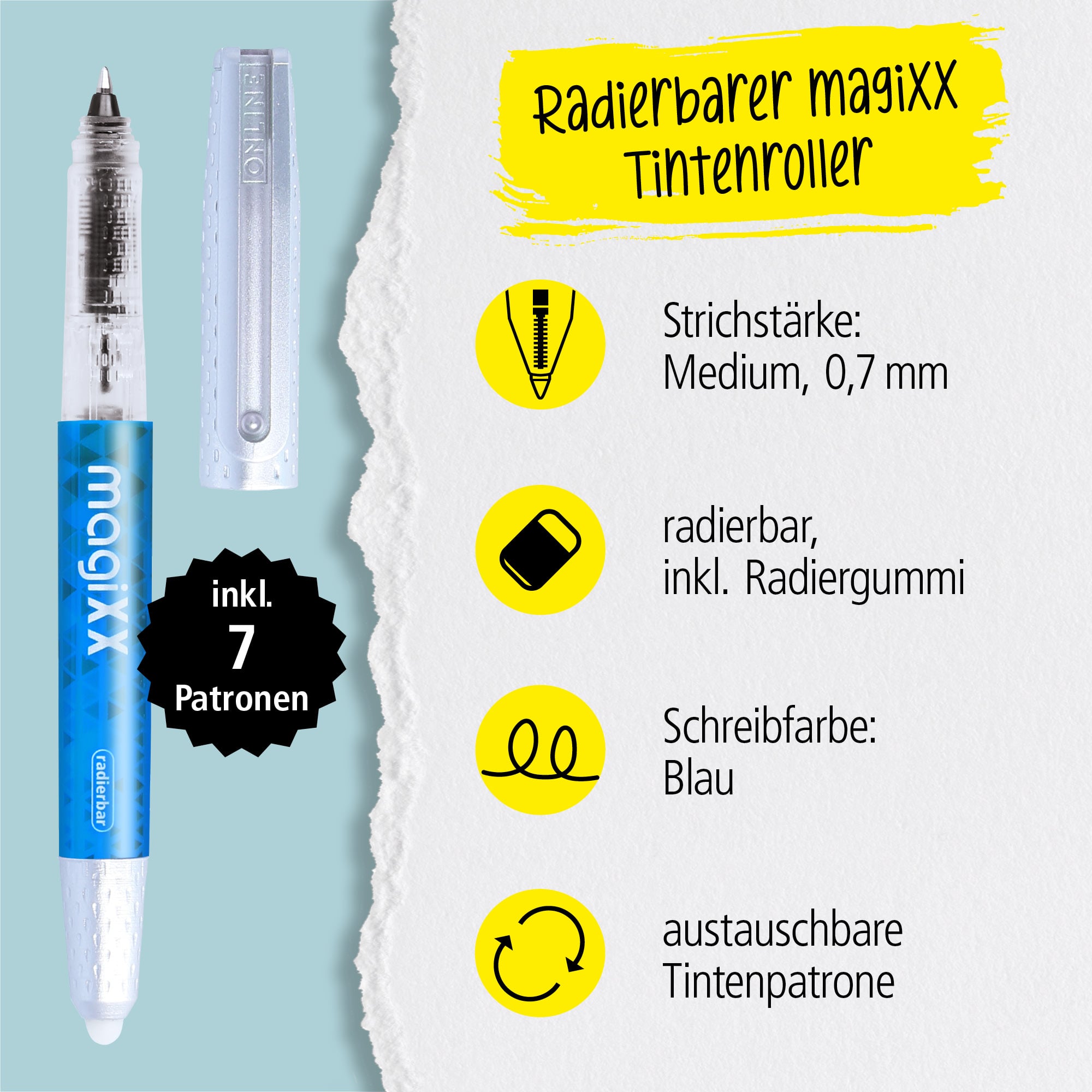 The magiXX rollerball pen with erasable ink - the novelty for school! It is the combination of rollerball pen and erasable ink that makes the magiXX so special. The erasable ink makes writing an absolute pleasure. Simply erase over the paper and immediately write over it again. With more than 800 metres per cartridge, the magiXX rollerball offers extra-long writing pleasure. And if the cartridge does run out? Then the new rollerball can be easily refilled with the fully recyclable magiXX ink cartridges. The ergonomic grip ensures comfortable, smooth writing. The cartridge rollerball, in a trendy design for all trendsetters, is ideal for right and left-handers. The magiXX ink is available in the writing colour blue.