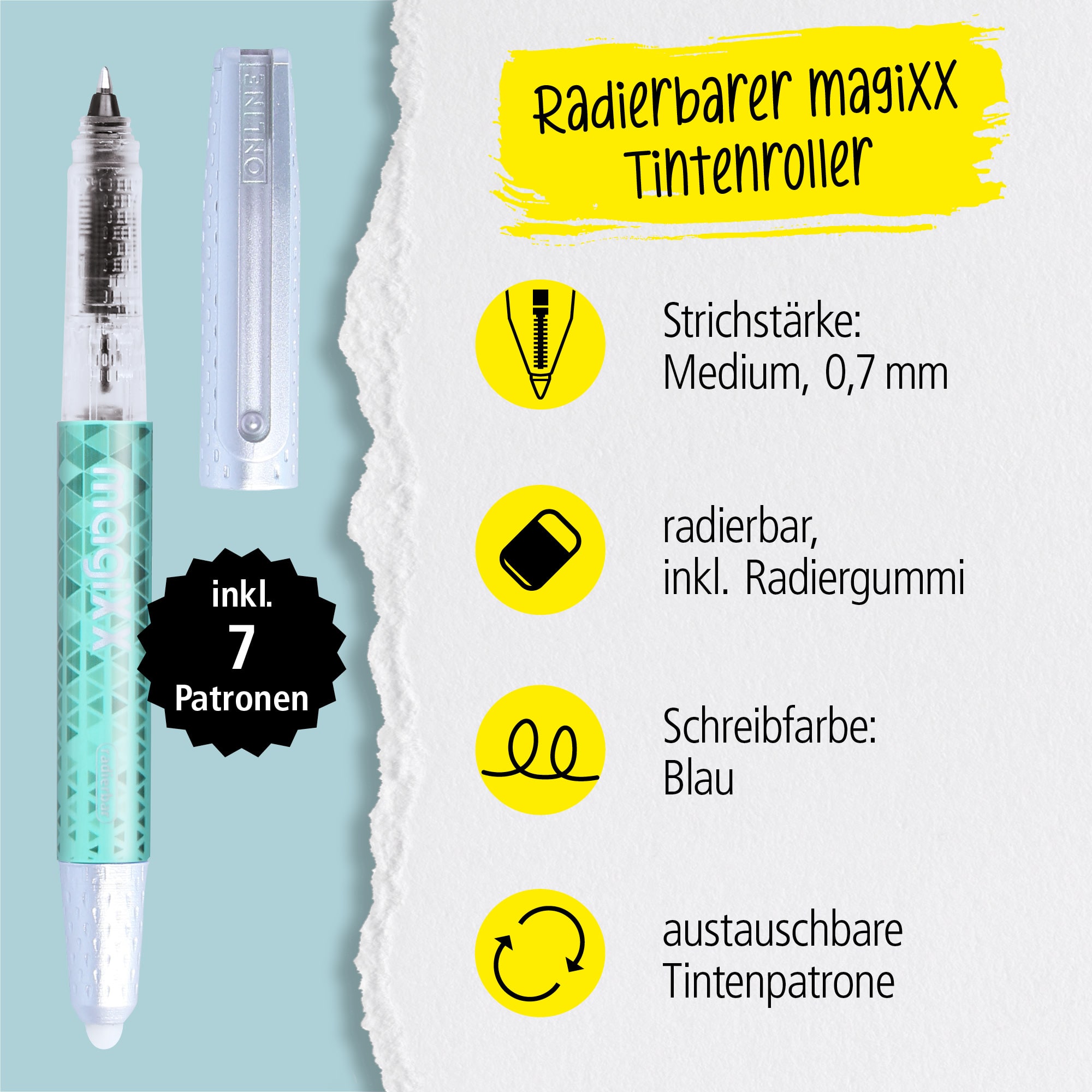 The magiXX rollerball pen with erasable ink - the novelty for school! It is the combination of rollerball pen and erasable ink that makes the magiXX so special. The erasable ink makes writing an absolute pleasure. Simply erase over the paper and immediately write over it again. With more than 800 metres per cartridge, the magiXX rollerball offers extra-long writing pleasure. And if the cartridge does run out? Then the new rollerball can be easily refilled with the fully recyclable magiXX ink cartridges. The ergonomic grip ensures comfortable, smooth writing. The cartridge rollerball, in a trendy design for all trendsetters, is ideal for right and left-handers. The magiXX ink is available in the writing colour blue.
