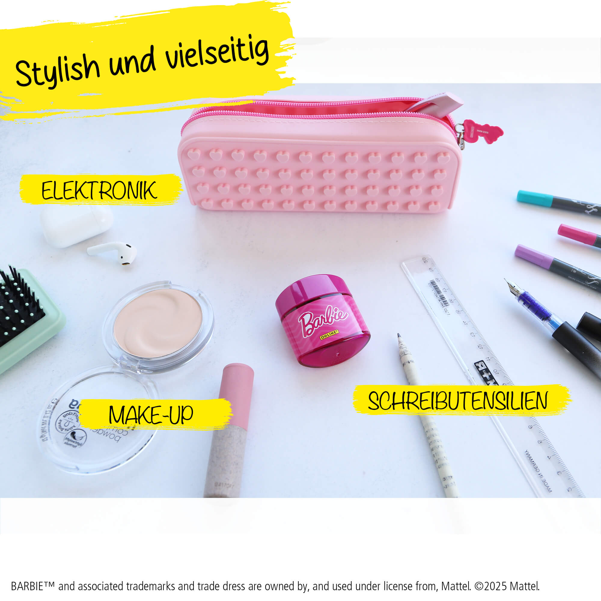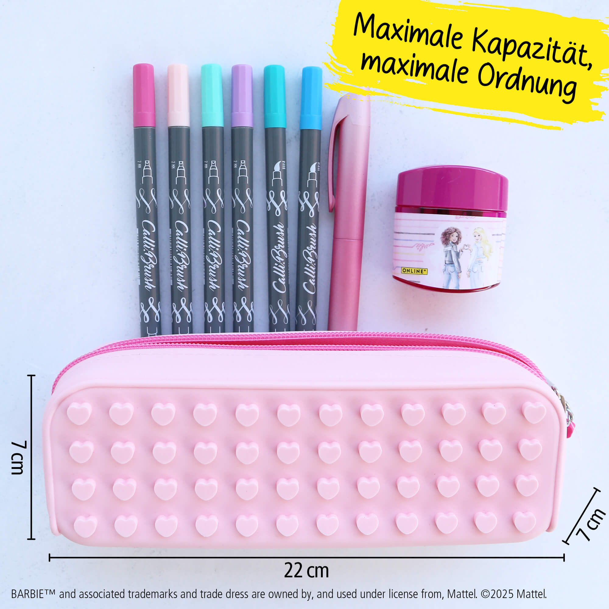 Barbie style for every day: The ONLINE pencil case made of silicone with 3D hearts and Barbie zip brings order and style to everyday school life. Whether at school, at home or on the go - everything is safely stowed away and quickly to hand. A practical must-have for little fashionistas.