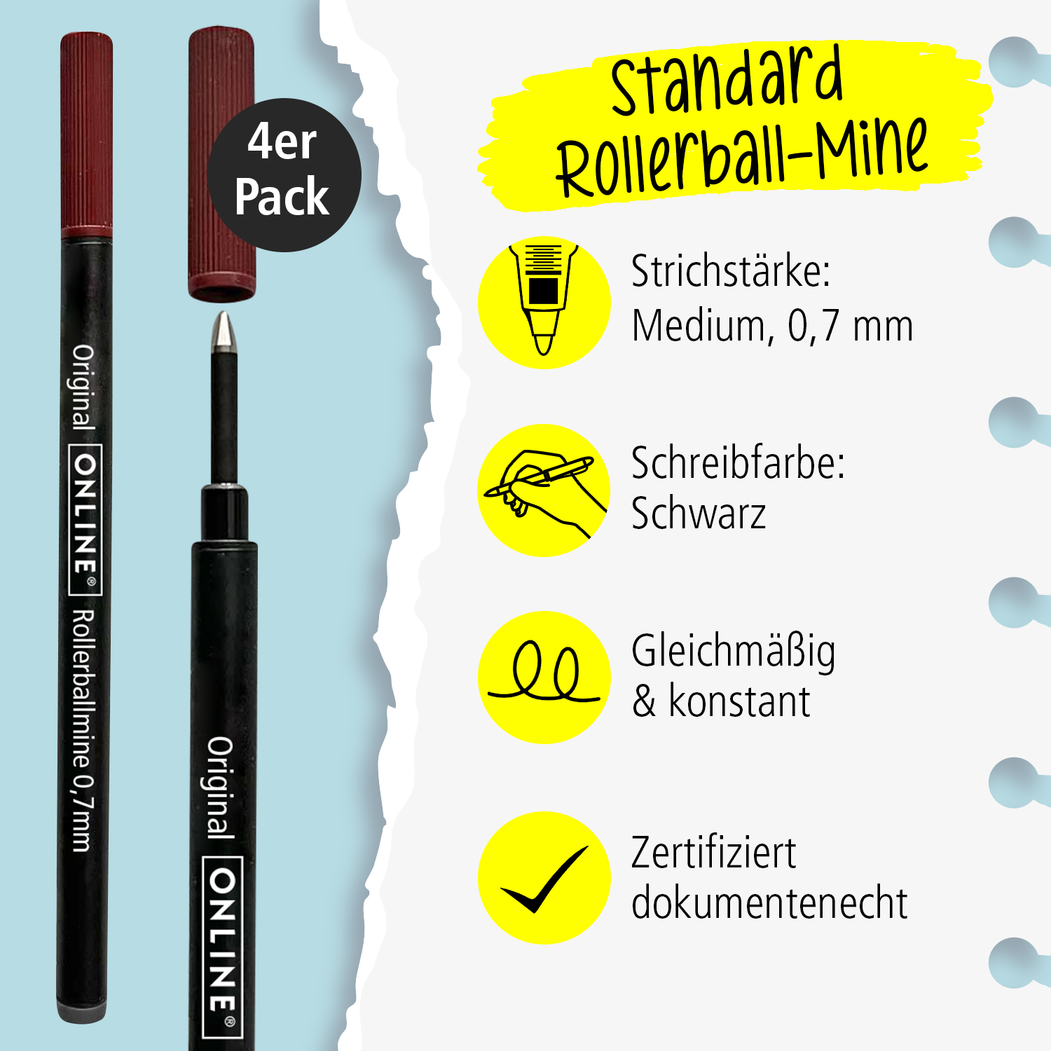 Rollerball refill, high quality, metal, stainless steel ball 0,7mm, black ink, safety-technology is perfect for pens without cap seeling, made in Germany ISO 14145-2; Contains 4 refills