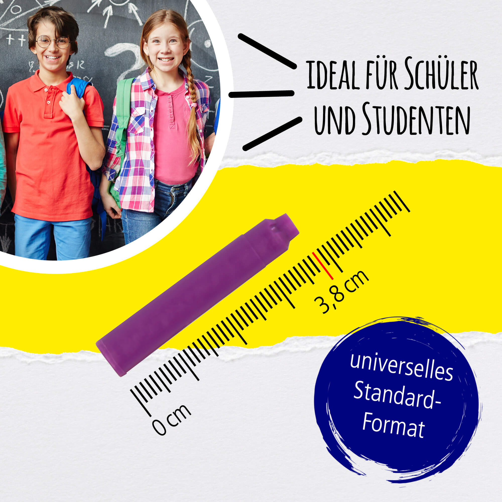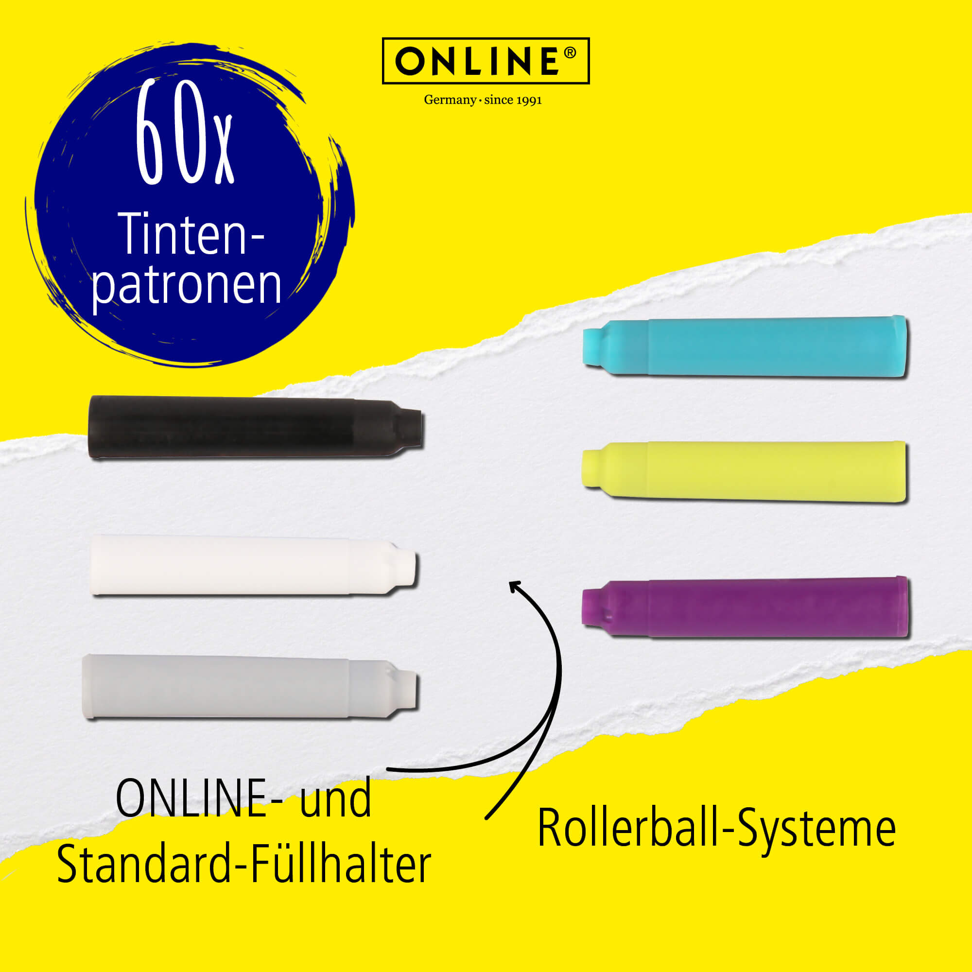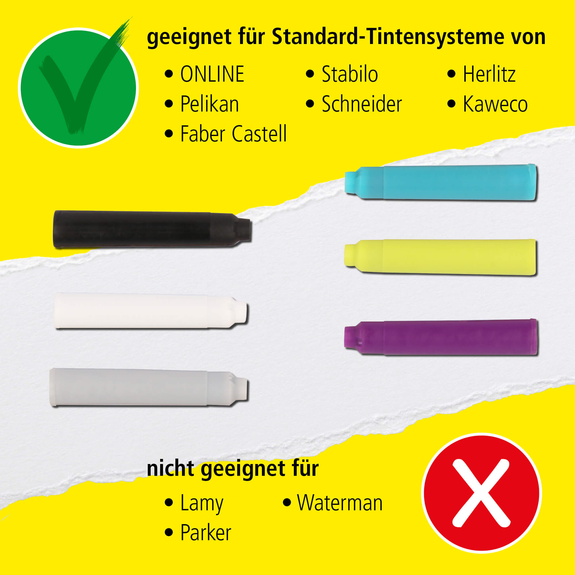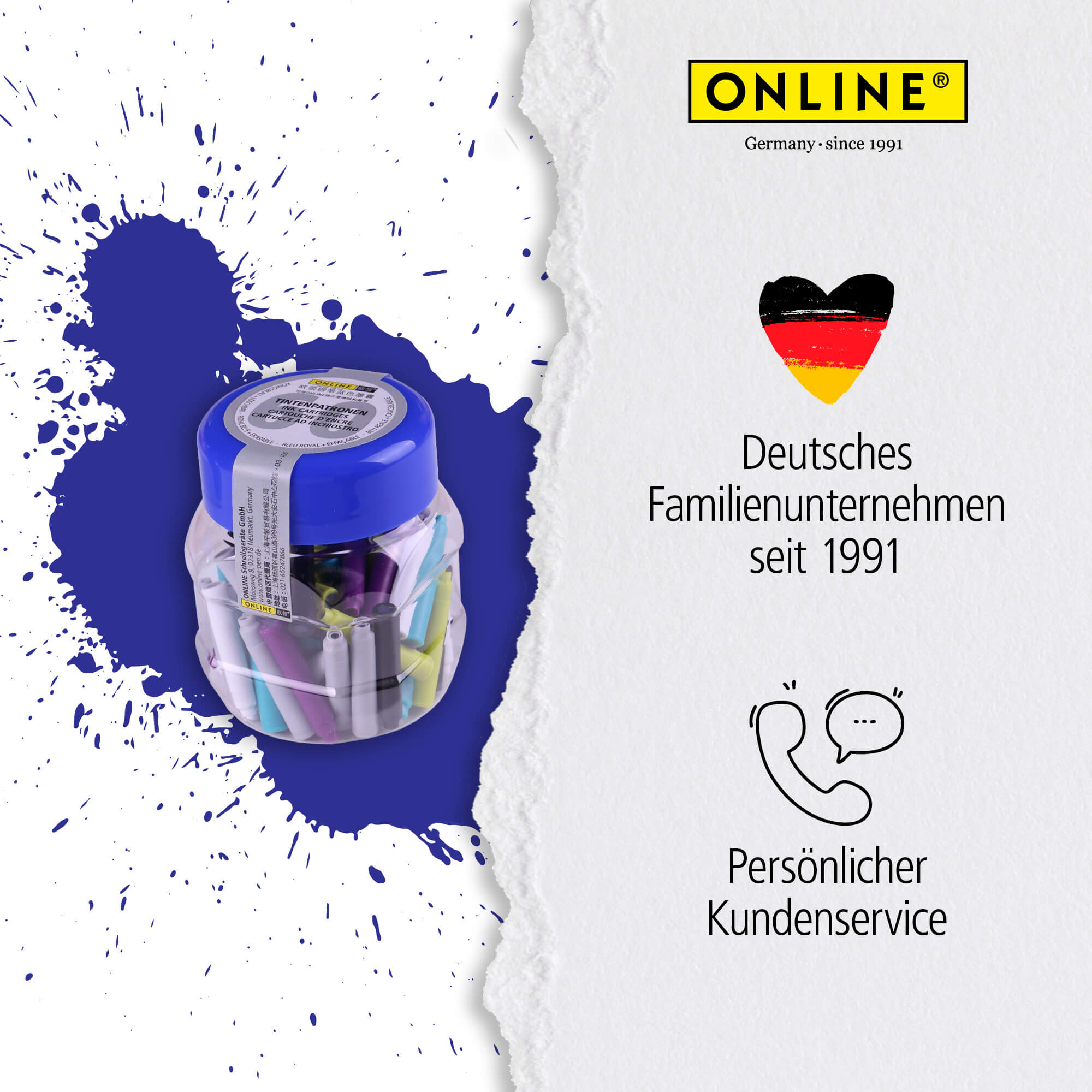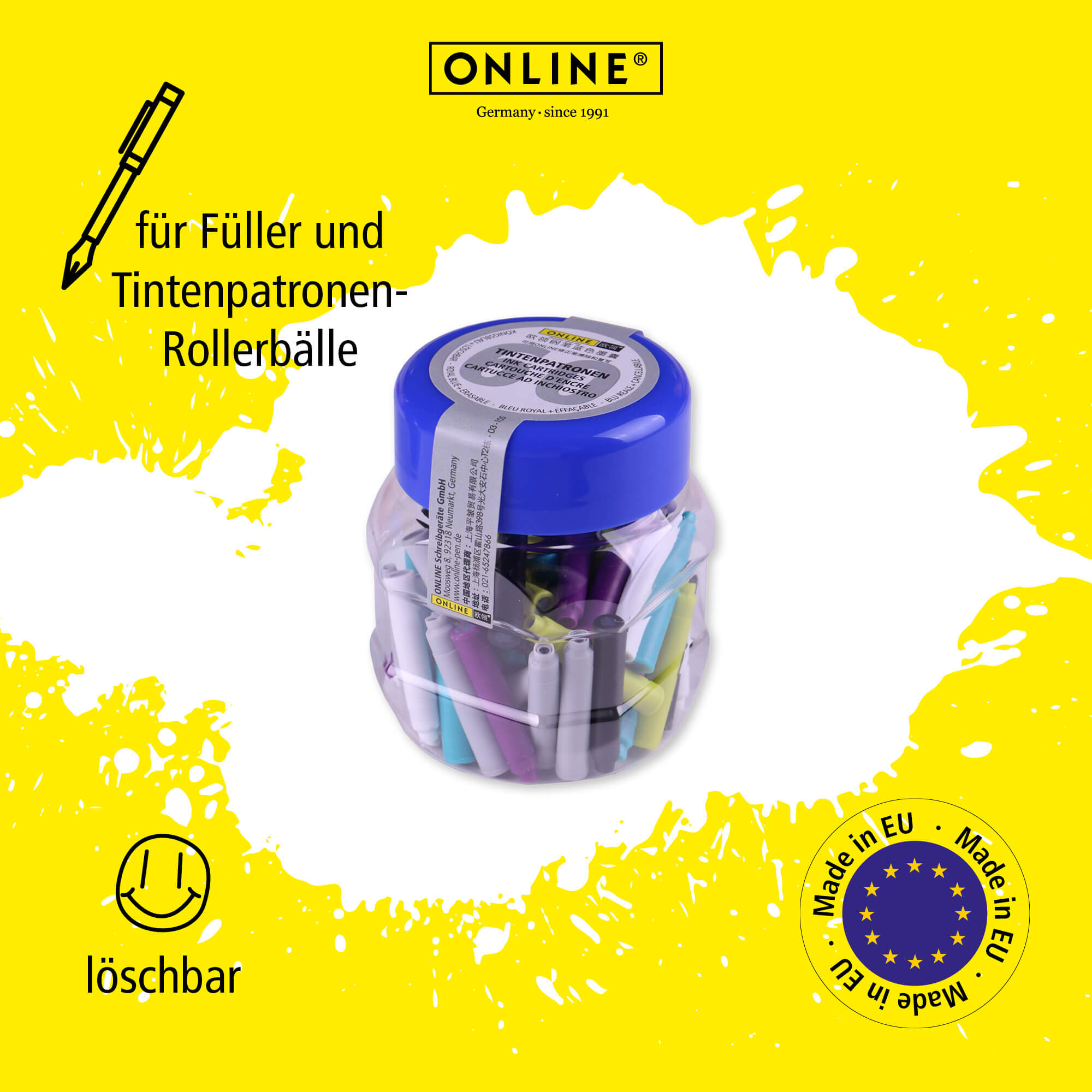 The ONLINE fountain pen ink cartridges guarantee high-quality ink and an intensive color – writing colour royal blue, erasable – in consistent quality. They are compatible for all ONLINE ink systems and any other standard ink fountain pen systems.