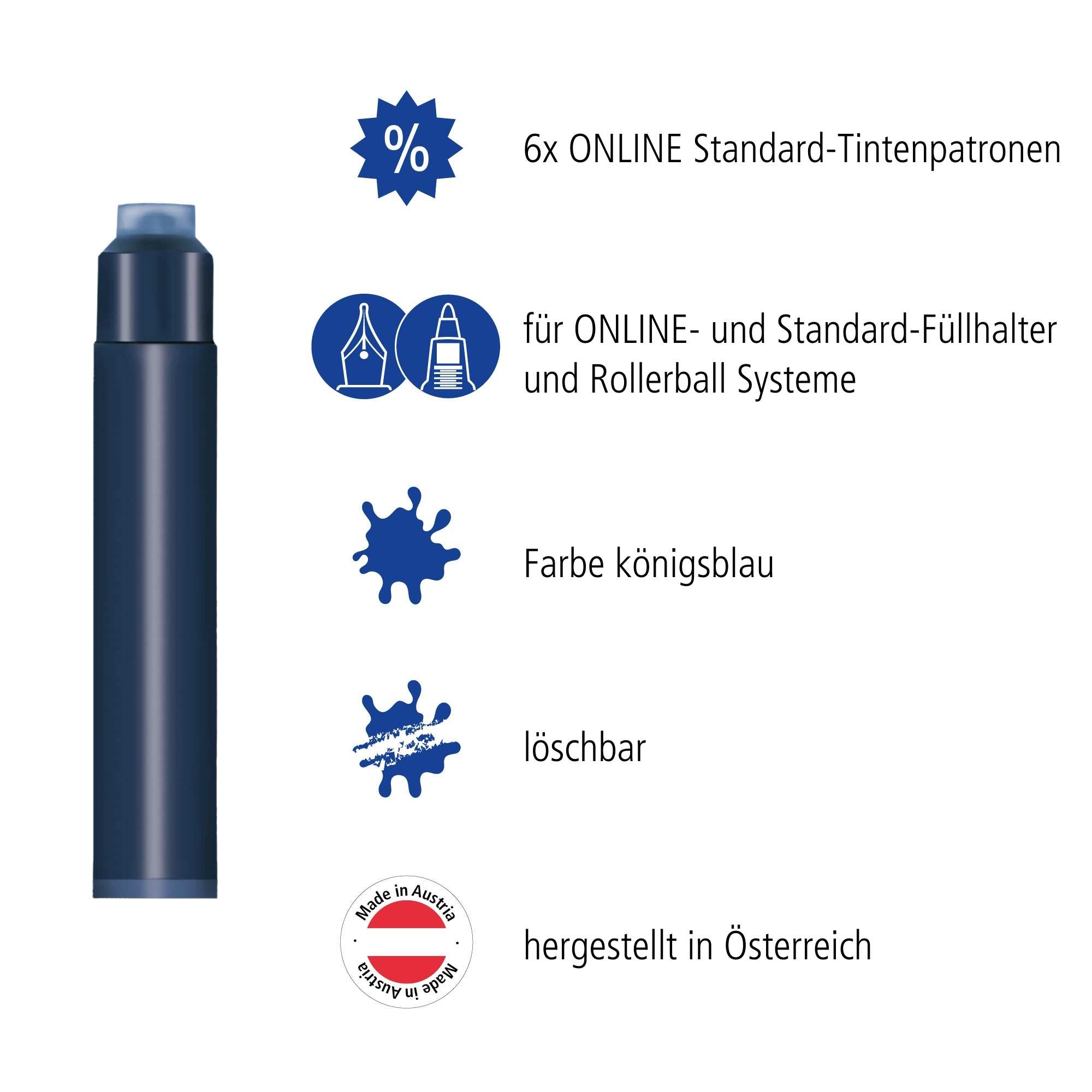 The ONLINE fountain pen ink cartridges guarantee high-quality ink and an intensive color, in consistent quality. They are compatible for all ONLINE ink systems and any other standard ink fountain pen systems. Available in many different colors. Contains 6 cartridges.