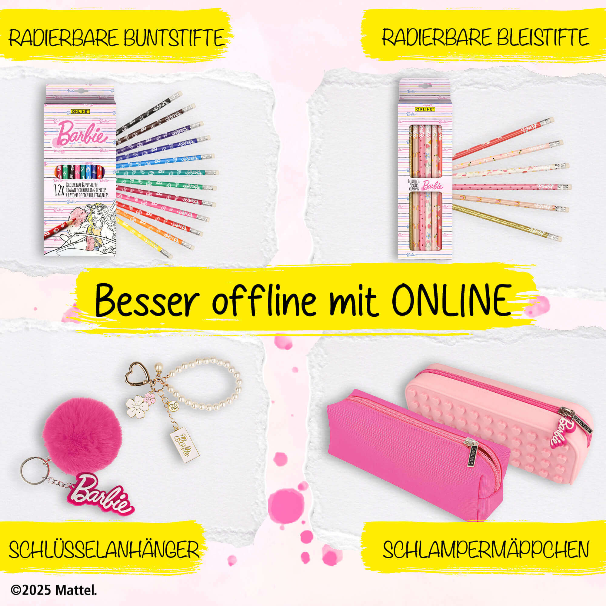 Noch mehr Schulzubehör im Barbie-Design? Tauche ein in die pinke Welt von Barbie, mit dem Hausaufgabenheft, den Rollerball Pens oder den radierbaren magiXX-Gelschreibern, die perfekt in das traumhaft pinke Barbie-Schlampermäppchen passen. Jetzt entdecken!