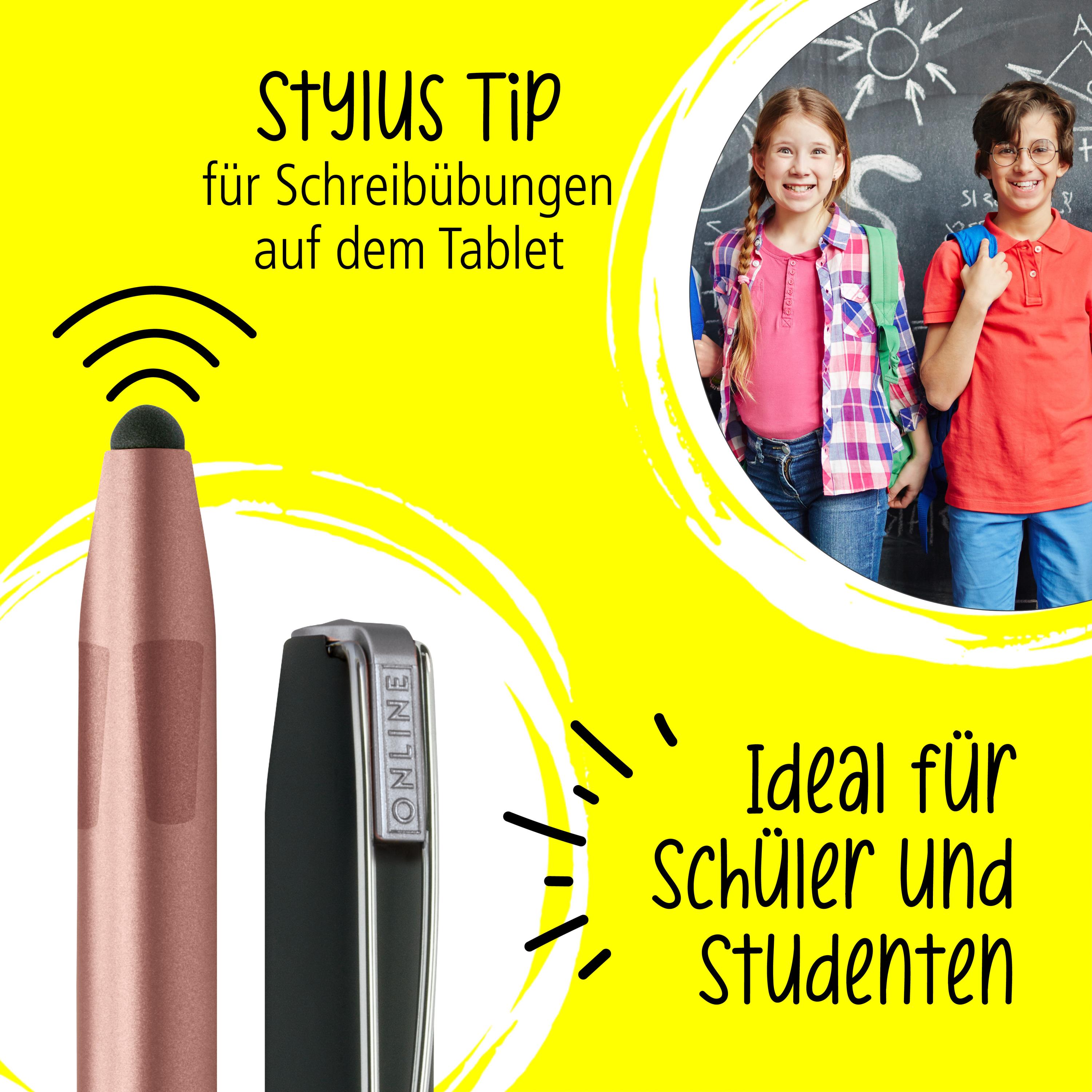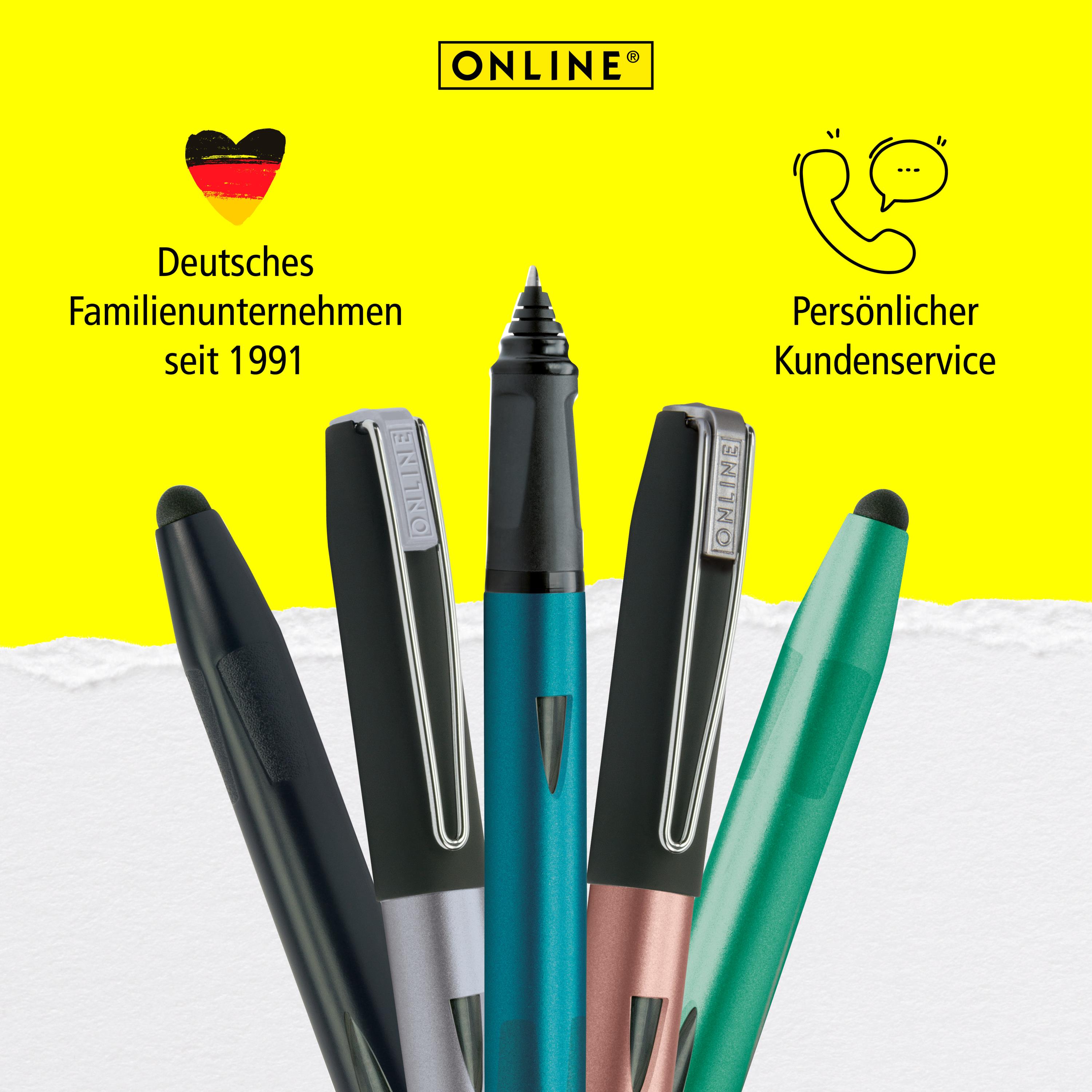 SWITCH Plus – the design ink rollerball with metal clip and Stylus tip. The modern rollerball is perfectly suited for writing on paper thanks to its ergonomic grip part. The innovative multifunctional writing instrument is convincing due to its extraordinary quality and its soft and fluid writing feeling on paper – and on tablets and smartphones. Made of conductive plastic, the SWITCH Plus glides softly over capacitive screens with its high-quality Stylus tip. The exciting optic is especially appealing: the cap in Soft Black, the barrel in lacquered metallic colors – and the clear, innovative product design. The SWITCH Plus is the ideal companion for digital everyday life in the office, on a trip or at home – around paper or tablet. Refillable with ONLINE combi cartridges or standard ink cartridges.